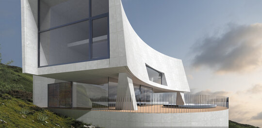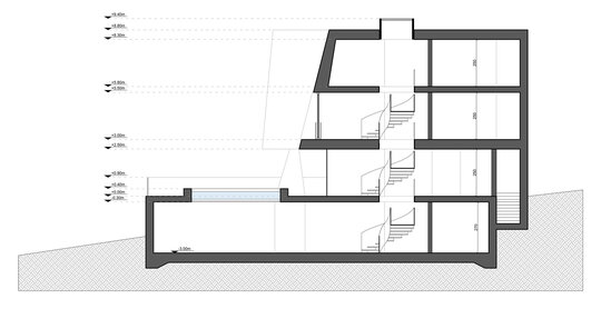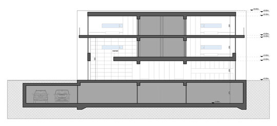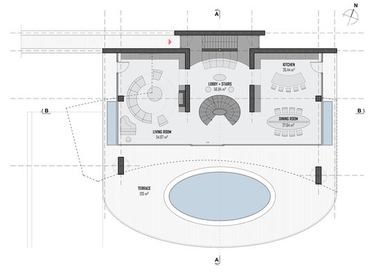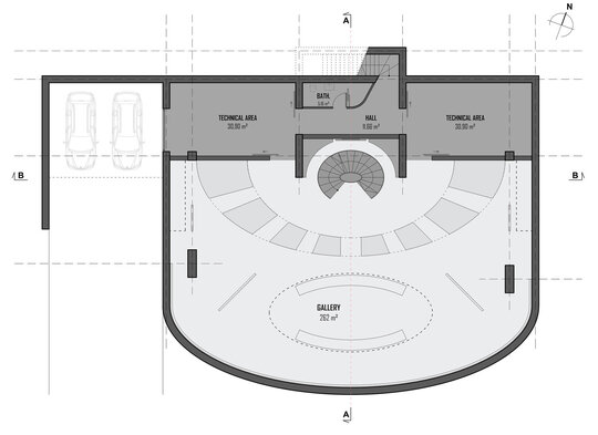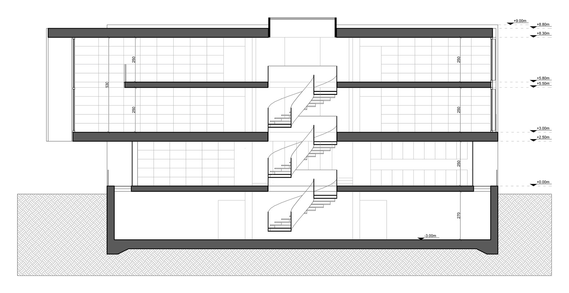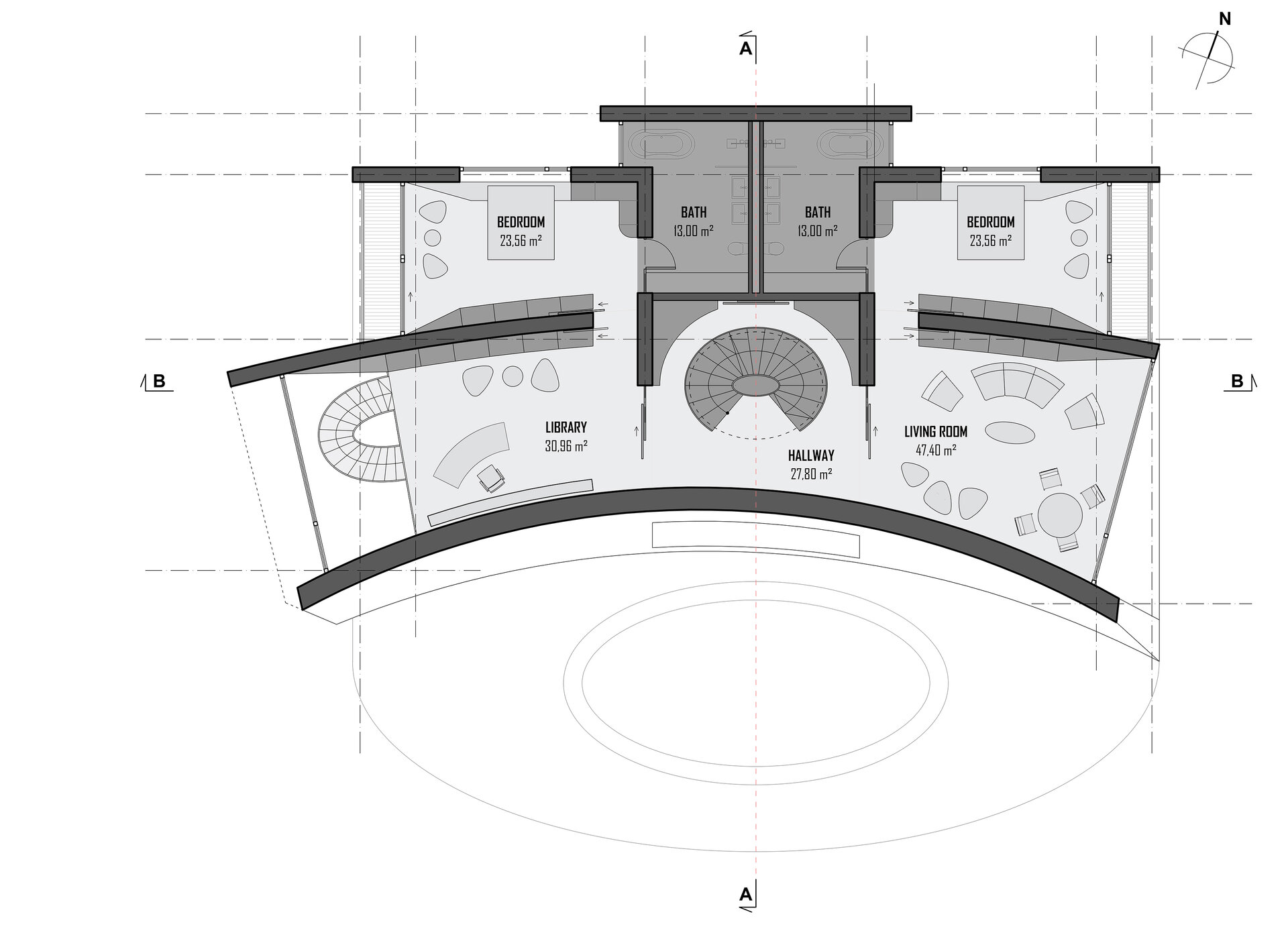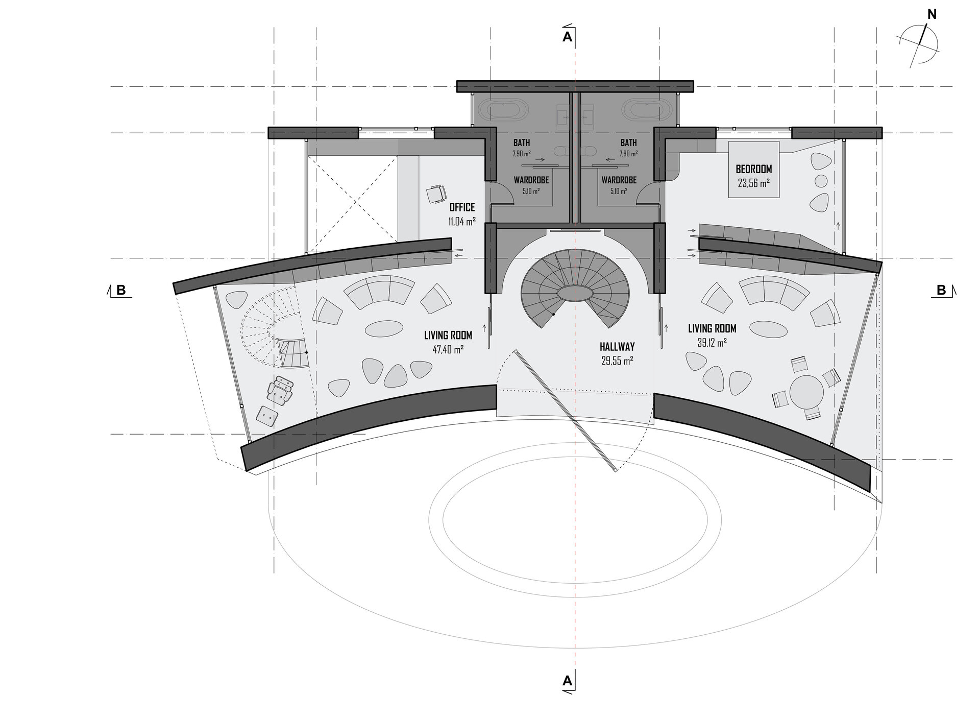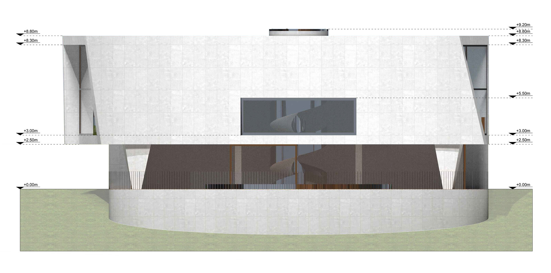 Aranjamentul funcțional pe nivele/ volume, subliniază independența acestor spații și ilustrează principiul structural al direcționării eforturilor către fundația de la demisol. Pentru a crea efectul de „plutire” al peretelui frontal, am introdus două puncte de descărcare pe capete prin pilonii ușor retrași, ale căror axe se rotesc de la etaj la parter, pentru a prelua in mod optim incărcările din grinda asociată peretelui concav. Acesta (peretele concav plus pilonii) acționează ca un arc, fiind in mod real o grindă foarte înaltă din beton armat post-comprimat ( peste 6m înălțime), ce susține pe latura sa acoperișul și plăcile de la etajul 1 și 2, fără a folosi coloane sau structuri intermediare de transfer, eforturile fiind direcționate spre piloni. Se obține astfel o separare clară formală și spațial-constructivă a etajelor față de bază și demisol, și respectiv prin terasa și livingul de la parter.