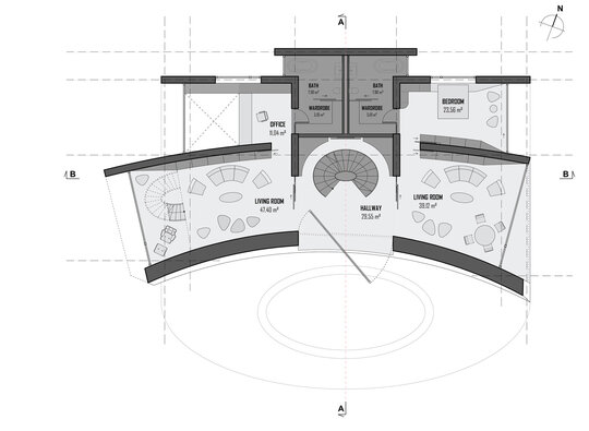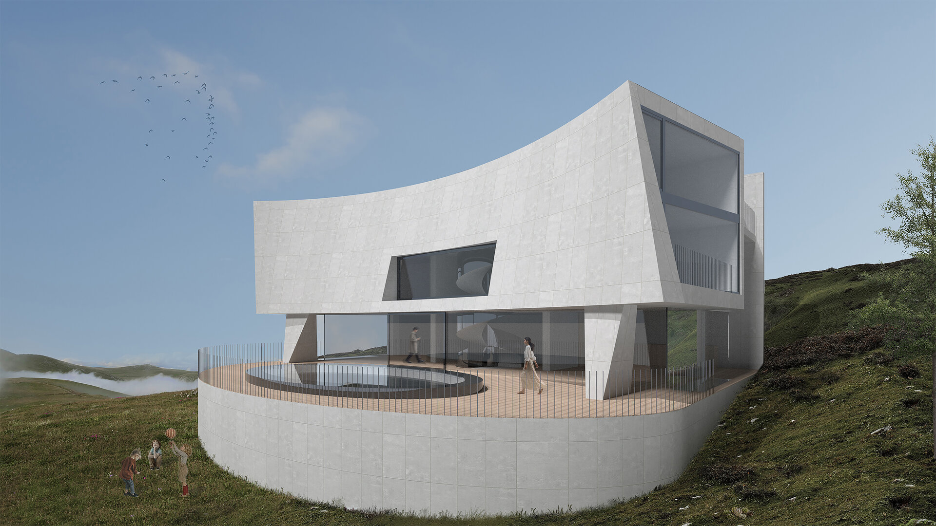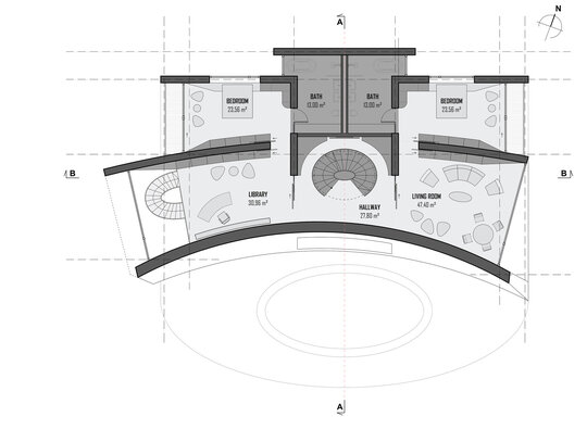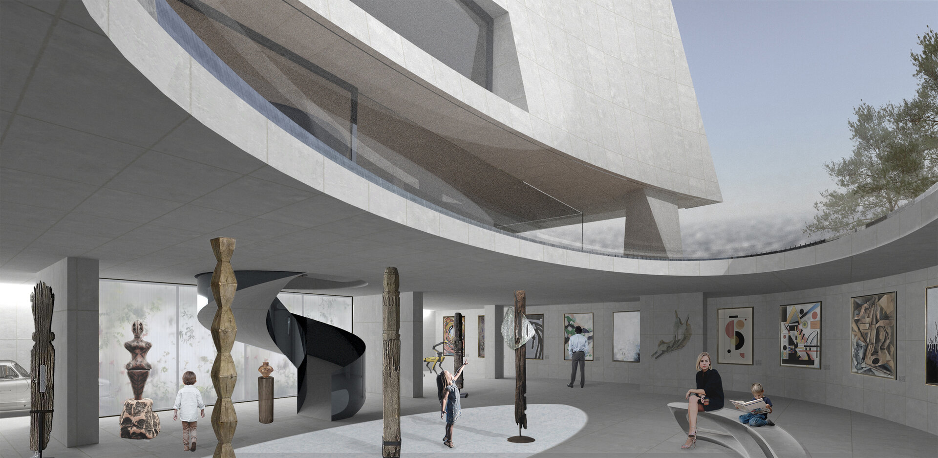 Dacă în scenariile clasice întâlnim o separație în plan între spațiile de locuit / dormit și cele de lucru tip atelier / galerie, în cazul de față această separație se produce pe verticală, folosind panta terenului pentru a ilustra o separare pe layere a spațiilor și funcțiunilor casei, analogie la stratificarea geologică a dealului pe care este situată casa. Forma casei, privită din exterior, este un semicerc tăiat în diagonală la capete, așezat pe o bază solidă, parțial eliptică, ce găzduiește spațiile de lucru și de expoziție pentru un cuplu pasionați de artă și copiii lor.