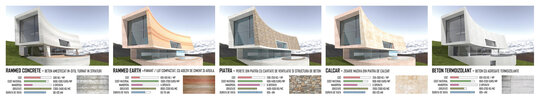 Materialul abordat în final în proiect este betonul termoizolant cu conținut redus de dioxid de carbon. Rețeta sa conține pe lângă agregate termoizolante (sticlă expandată, perlit EPS sau bile de argila expandată cu bucați de mică, distribuite in masă), și agregate rezultate din concasarea deșeurilor altor clădiri (deșeuri din demolare), plus avand ca bază un sortiment de ciment cu inlocuitori de zgură și cenușă de furnal, rezultând un comportament synergetic cu agregatele termoziolante, la fel ca la cele de tip nano-silicați (testat in rețetele mai scumpe), reducând transmisia termică a betonului cu până la 80% și 90%. Structural, elemenții au nevoie de un procent mic de armare raportat la sectiuna transversală – datorat volumului lor supra-dimensionat (pereți, grinzi și planșee), astfel ca avem de a face cu un beton cu comportament ductil, optim din punct de vedere seismic.