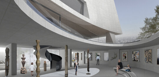 Între forma superioară concavă și baza convexă se află un „gol” / un nivel deschis delimitat prin vitraj, care formează, impreuna cu terasa peste demisol, parterul; având living, bucătărie și loc de luat masa, precum si intrarea principală, reprezentând un spatiu orientat către exterior. La partea superioară sunt două etaje ce cuprind spațiile domestice cu caracter privat: dormitoare, birouri și mici camere de zi secundare, unite printr-o scară comună. Scara centrală, elicoidală, este un element-cheie, care conectează toate nivelurile și crează în jurul ei o zonă comună de circulație, cu mențiunea că spațiul din jurul ei este deschis către celelalte funcțiuni. Ea evidențiază relația vizuală și funcțională dintre cele trei registre: atelier/expoziție la demisol, spațiu de zi vitrat pe 3 laturi la parter și zonele private de la etaje, tip studiouri. Astfel, forma generală a casei răspunde cerințelor spațial-funcționale și structural-estetice, iar jocul de plin-gol, convex-concav între parți subliniază stratificarea morfologică, cu baza semi-eliptică și semicercul simbolizând ancorarea în peisaj, ca un om extinzand bratețe și imbrățisând in sens figurativ perspectiva catre vale oferită de poziționarea casei.