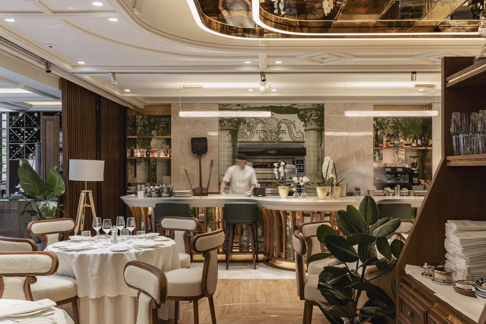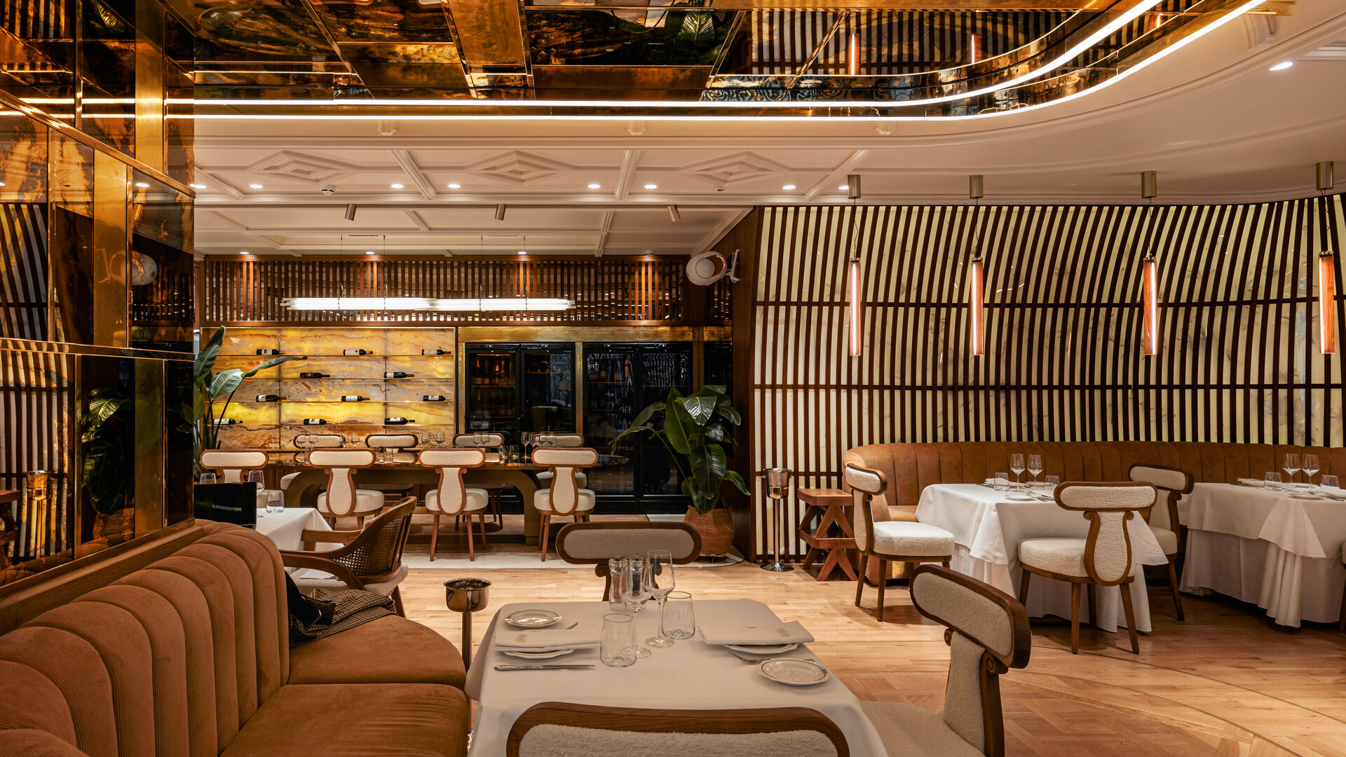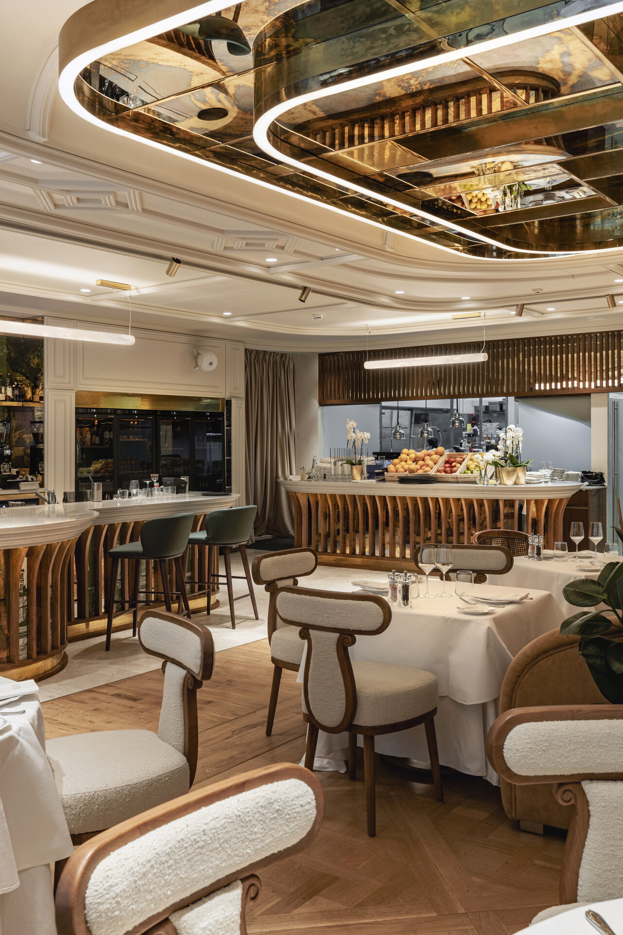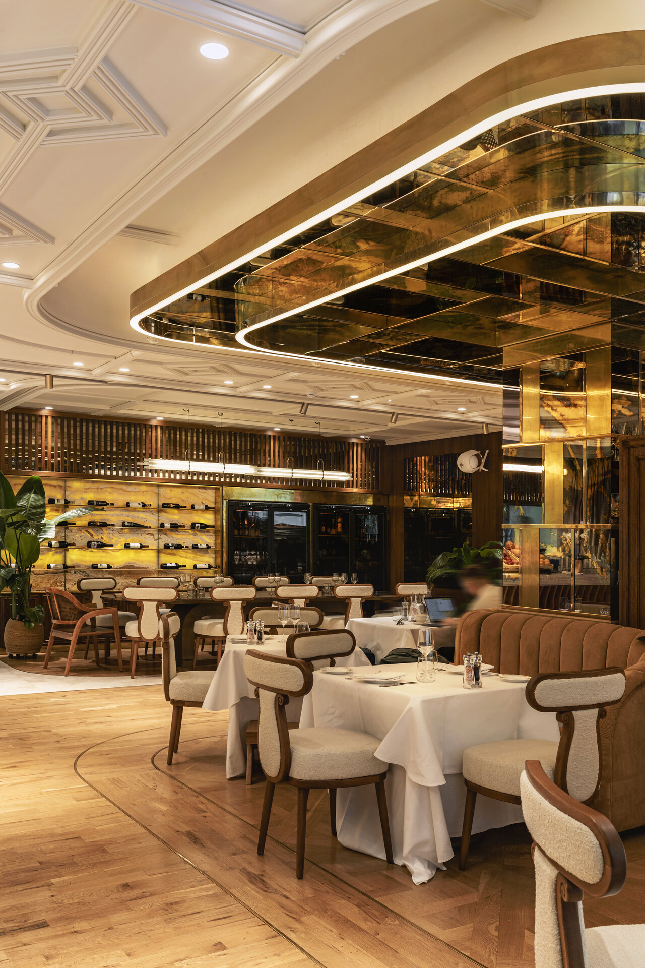 Întregul spațiu a fost gândit pentru a crea o atmosferă organică și integrată, pornind de la un plan deschis cu linii curbe ce conectează vizual toate zonele – de la barul central, un nucleu surpriză în sine, până la zona „chef’s table” și vitrina de pește, poziționată strategic în fața bucătăriei. Bucătăria, de altfel, este un adevărat spectacol, conectată vizual cu restul restaurantului printr-un ecran, oferind o privire nefiltrată asupra procesului creativ culinar.