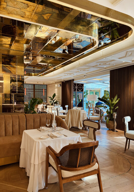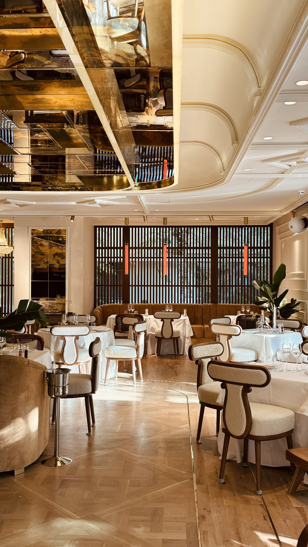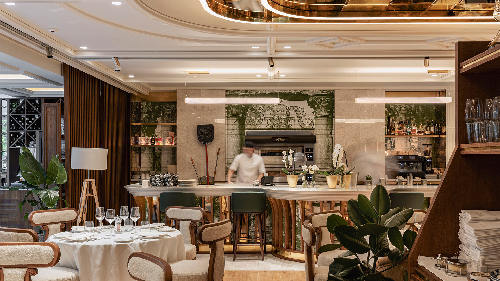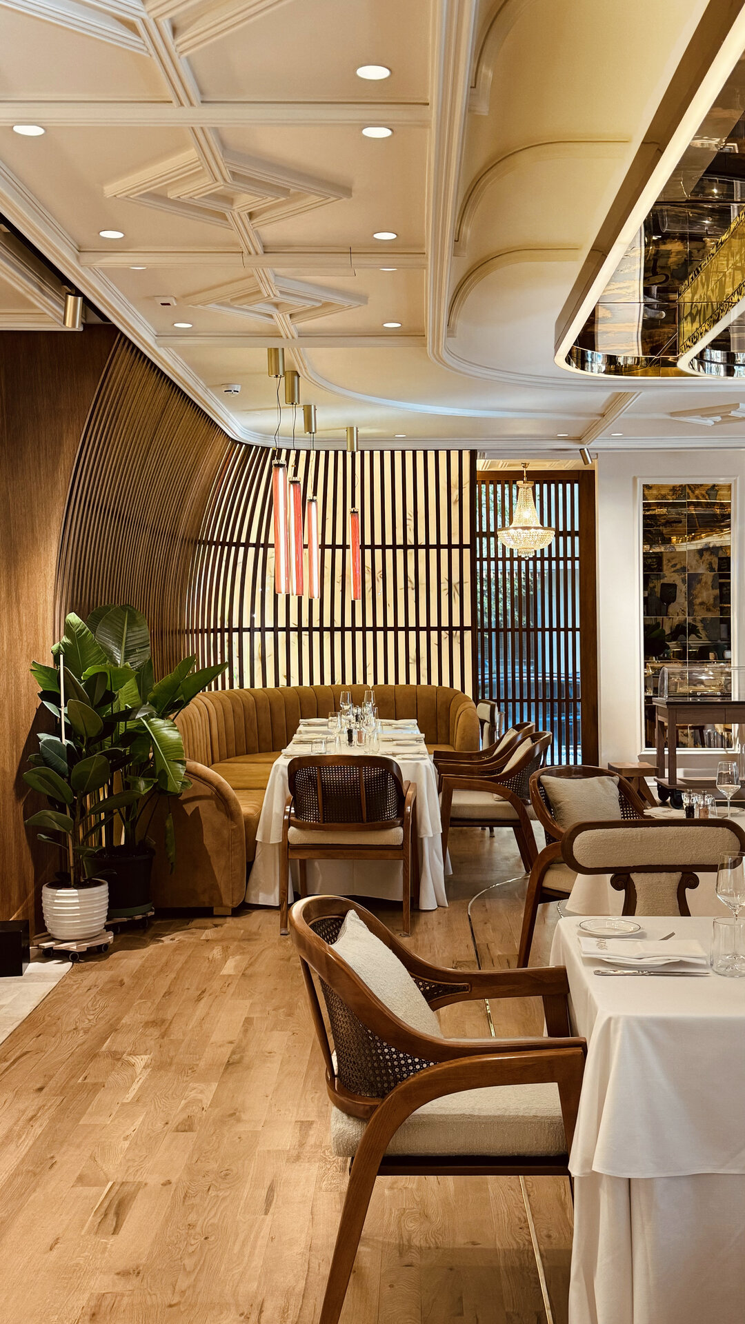 Întregul spațiu a fost gândit pentru a crea o atmosferă organică și integrată, pornind de la un plan deschis cu linii curbe ce conectează vizual toate zonele – de la barul central, un nucleu surpriză în sine, până la zona „chef’s table” și vitrina de pește, poziționată strategic în fața bucătăriei. Bucătăria, de altfel, este un adevărat spectacol, conectată vizual cu restul restaurantului printr-un ecran, oferind o privire nefiltrată asupra procesului creativ culinar.