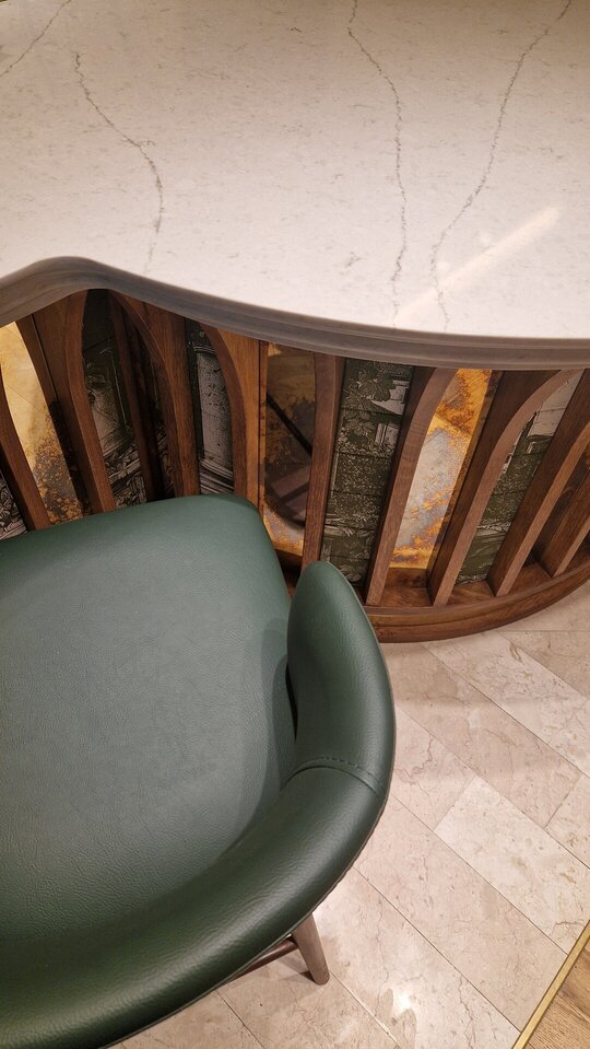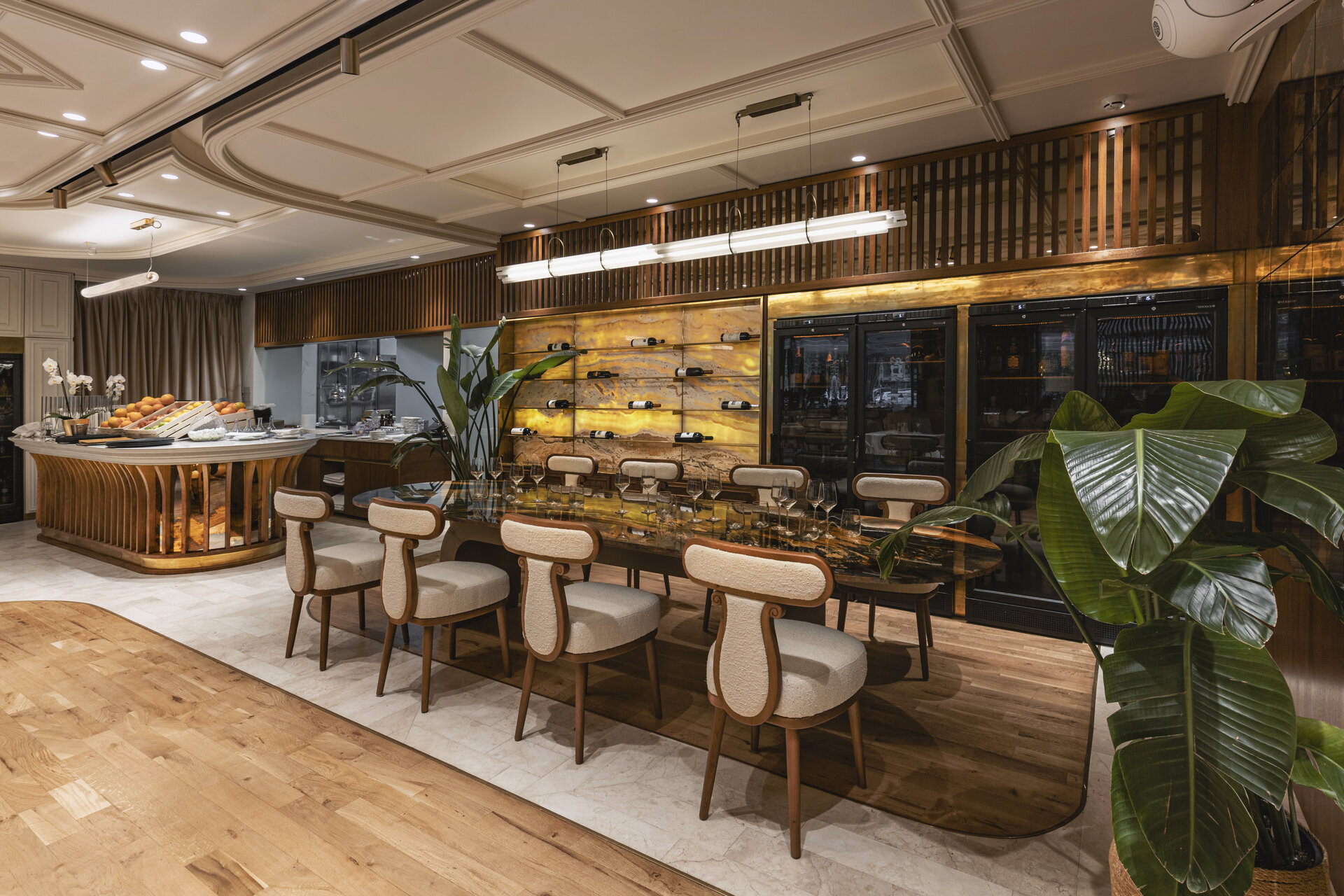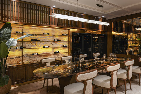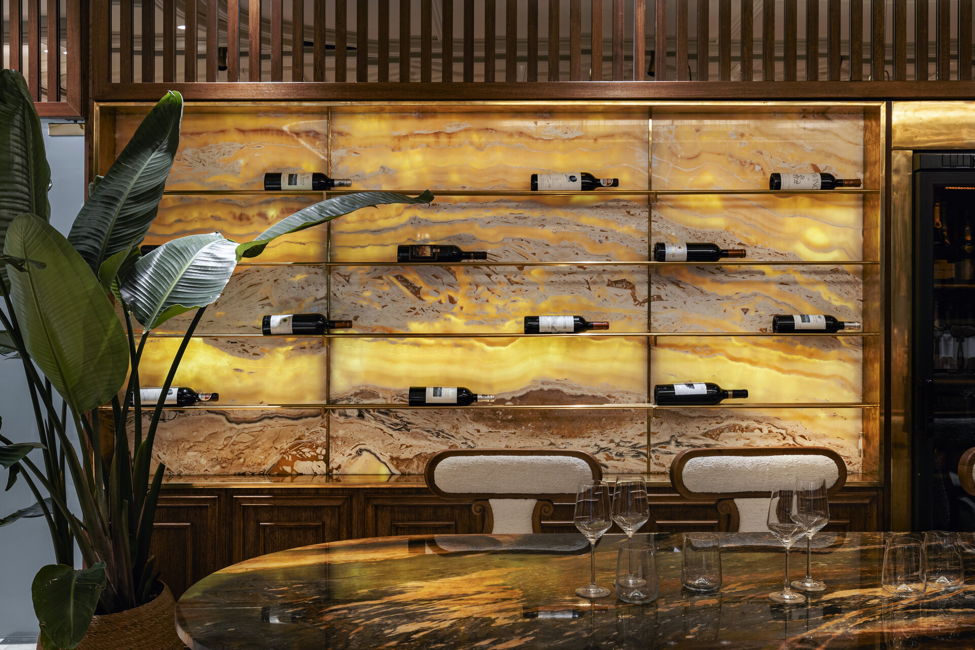 În zona "chef's table", am ales o marmură spectaculoasă, realizând o masă open book de 4 metri lungime. În spatele acesteia, un panou din onix iluminat completează decorul, în timp ce un suport de vinuri expune selecția de vinuri premium ale restaurantului.