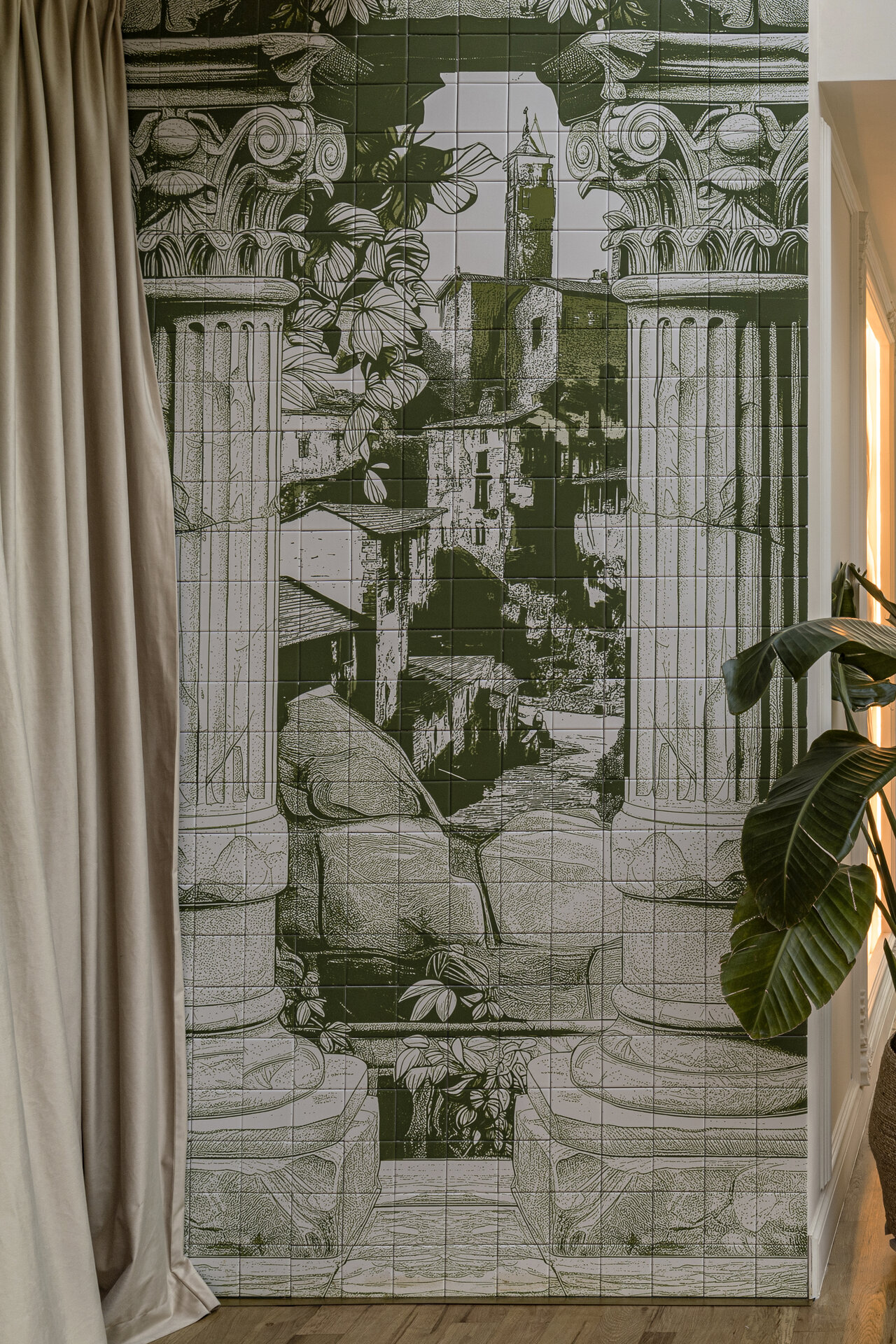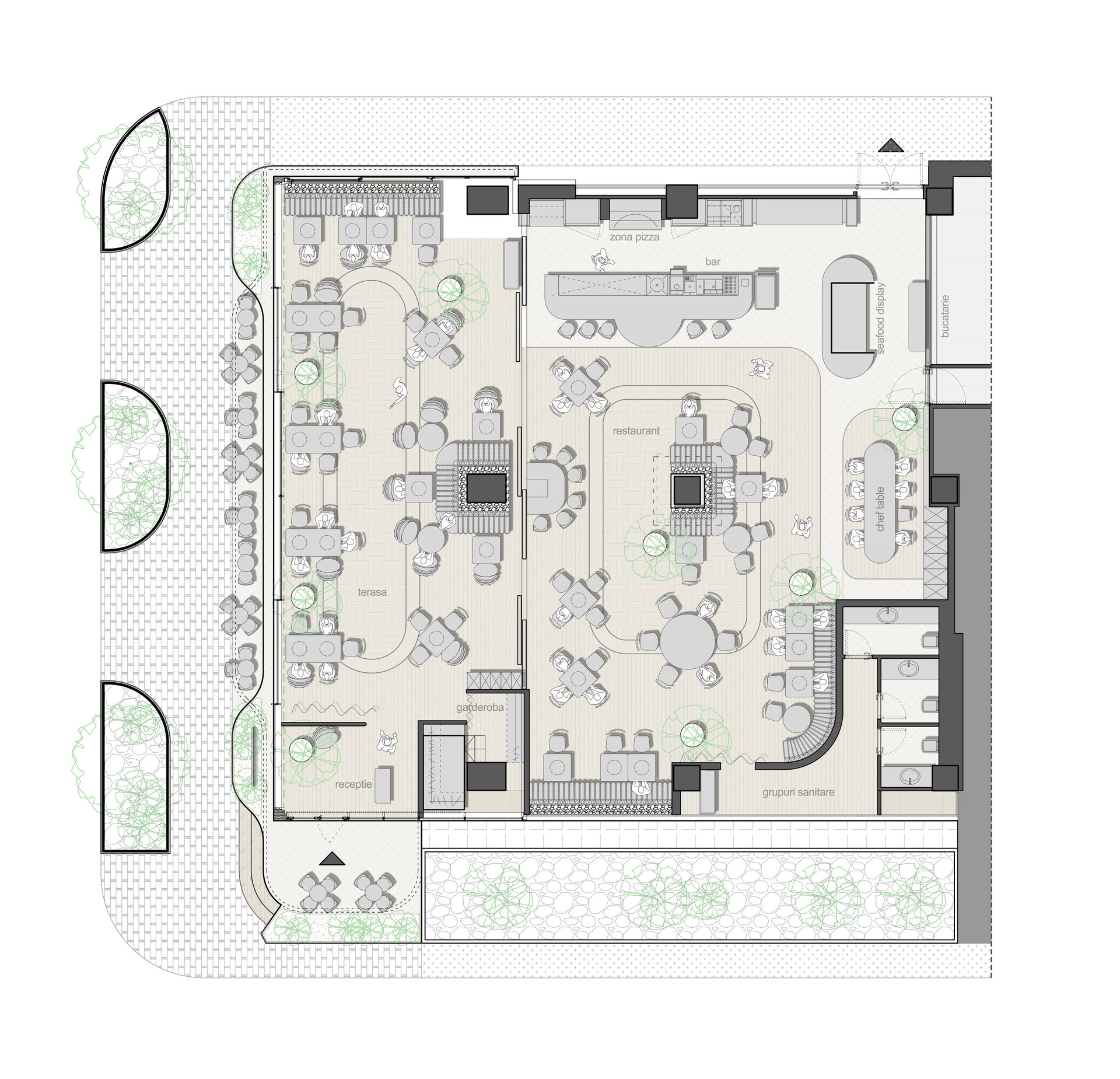 Materialele naturale joacă un rol esențial în definirea spațiului – lemnul masiv, folosit pentru bar, riflaje și vitrina de pește, oferă o senzație de autenticitate și căldură. Mozaicul ceramic printat, personalizat după desenele noastre, evocă peisaje mediteraneene și completează subtil spațiul cu reminiscențe ale tradițiilor portugheze de azulejo, inserate strategic în puncte cheie – bar, retrobar, recepție, dar și pe terasa deschisă.