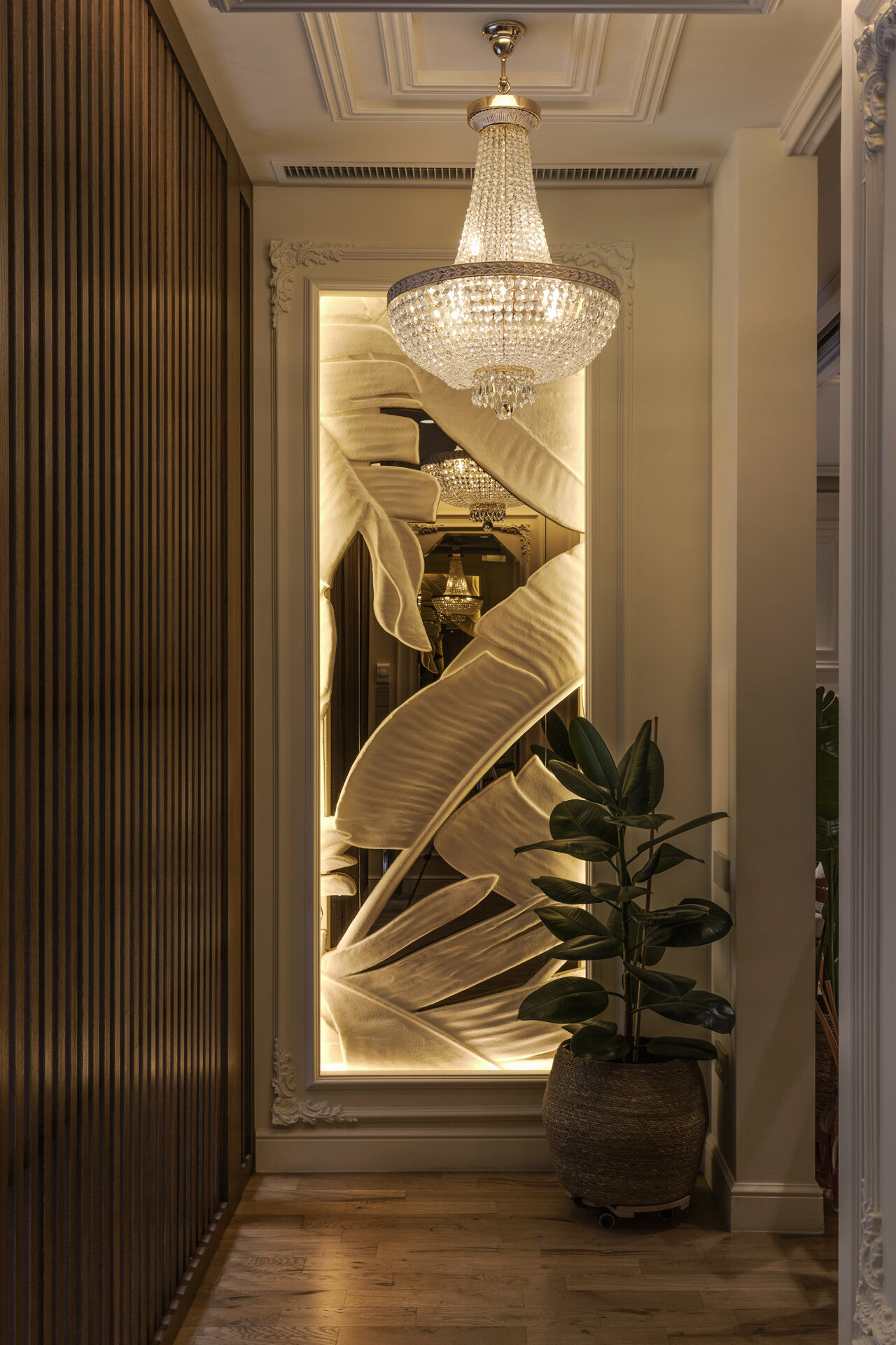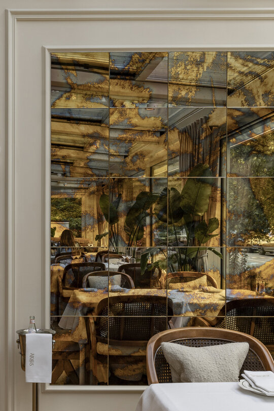 Punctul focal al restaurantului este o instalație suspendată din oglinzi antichizate și intarsii din alamă patinată, plasată în centrul spațiului. Aceasta adaugă un strat de mister și strălucire caldă, în timp ce îndeplinește și un rol funcțional, ascunzând un stâlp de beton și o grindă existentă. Instalația nu este doar un element decorativ, ci o metaforă a trecerii timpului, oglinzile antichizate reflectând eleganța uzurii nobile.