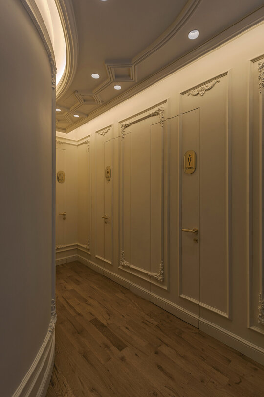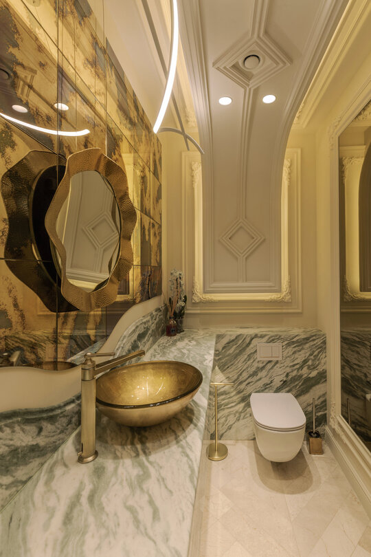 Liniile fluide sunt continuate și în zona grupurilor sanitare, ascunse discret de un perete curbat. Aici, am adus o notă de eleganță prin folosirea marmurei și a obiectelor sanitare de înaltă calitate, completate de oglinzi și iluminat cald, menit să sublinieze atmosfera intimă și rafinată a spațiului.