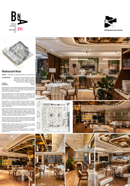 Restaurantul Akos, un fusion mediteranean, propune o experiență arhitecturală fluidă, inspirată de forme naturale și elemente istorice reinterpretate. Proiectul reflectă o viziune holistică asupra spațiului, unde funcționalitatea și estetica se întâlnesc într-o coregrafie subtilă de curbe și materiale rafinate.