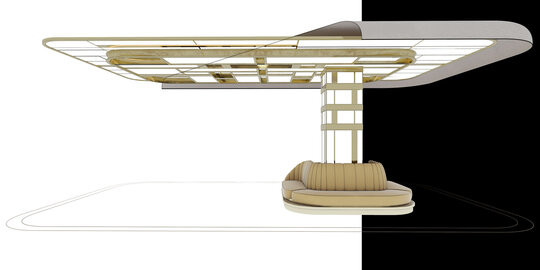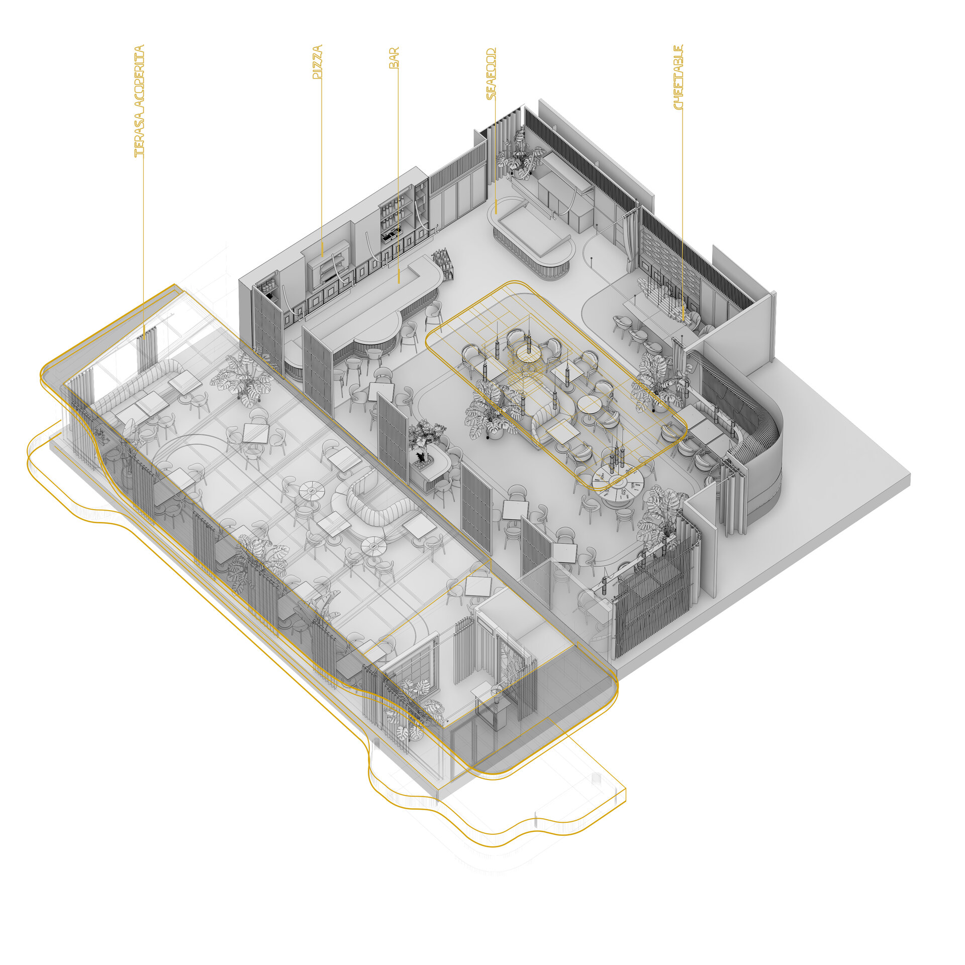 Barul devine un element multifuncțional, cu un detaliu surprinzător – un nucleu unde se poate coace aluat, completând astfel experiența senzorială a oaspeților. Terasa, echipată cu un sistem sofisticat de acoperiș retractabil și panouri de sticlă mobile, se transformă într-un spațiu semi-privat care poate interacționa direct cu natura, lăsând cerul să devină o parte din decor.