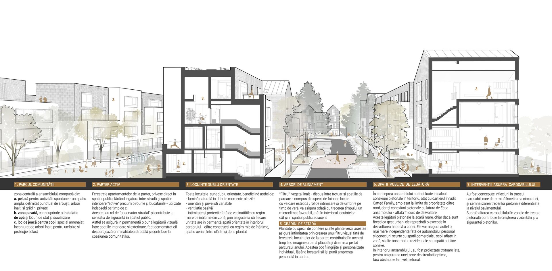 Proiectul propune o alternativă necesară pentru dezvoltarea locuirii colective în suburbii: un model în care accentul nu cade pe detalii, rigoare arhitecturală sau materialite, ci pe fundamente solide – sănătatea fizică și mentală a locuitorilor, grija față de mediu și valoarea interacțiunii umane.