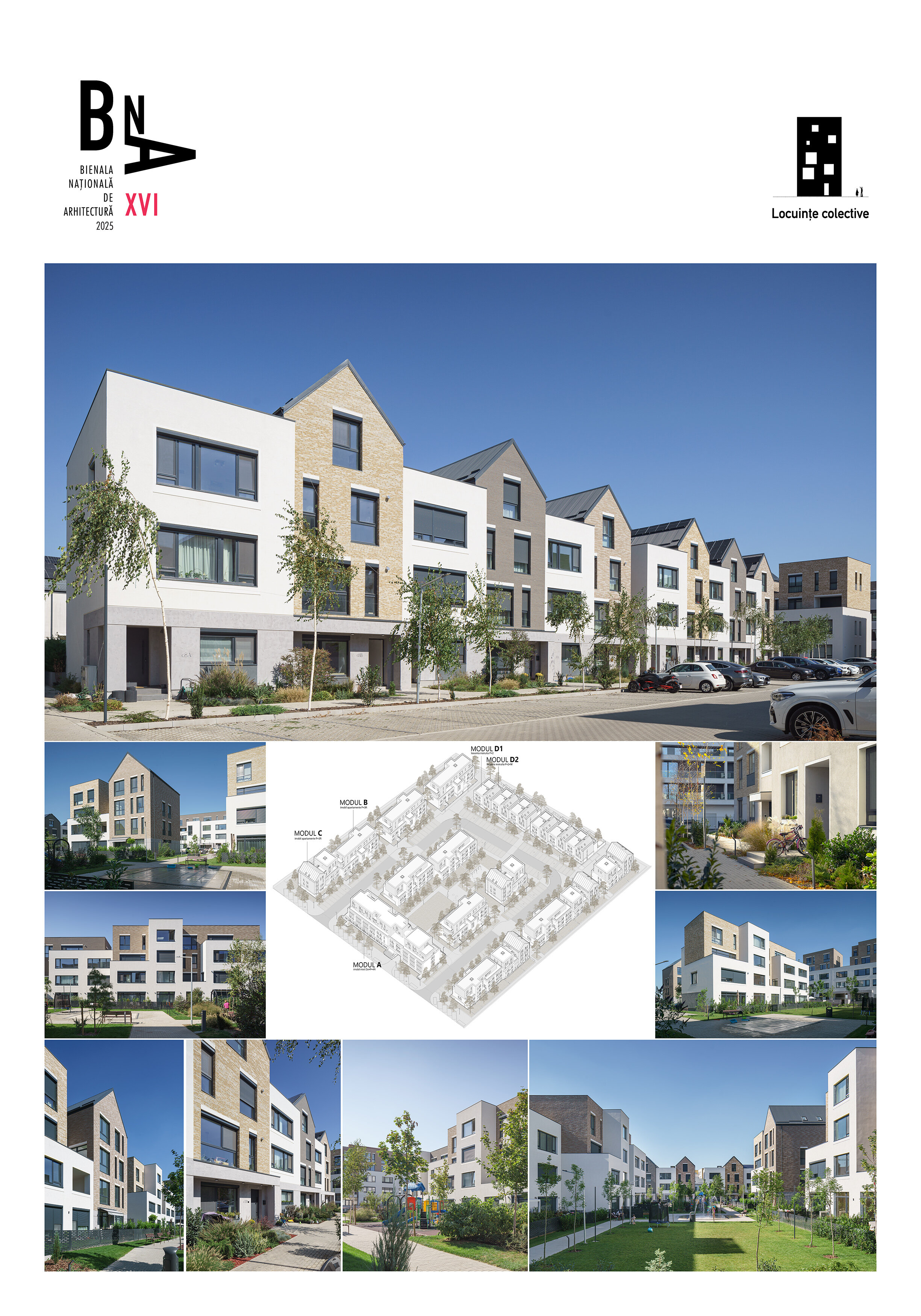 Ansamblul este compus din trei module de locuințe colective și un modul de locuințe înșiruite, replicate în mai multe instanțe și dispuse variat pe lot. Diversitatea tipologiilor locative răspunde unor nevoi și profiluri diferite asigurând varietate socială, iar organizarea atentă a spațiilor comune – la nivelul fiecărui corp de clădire, dar și la nivel de cartier – susține formarea unui mediu propice interacțiunii.