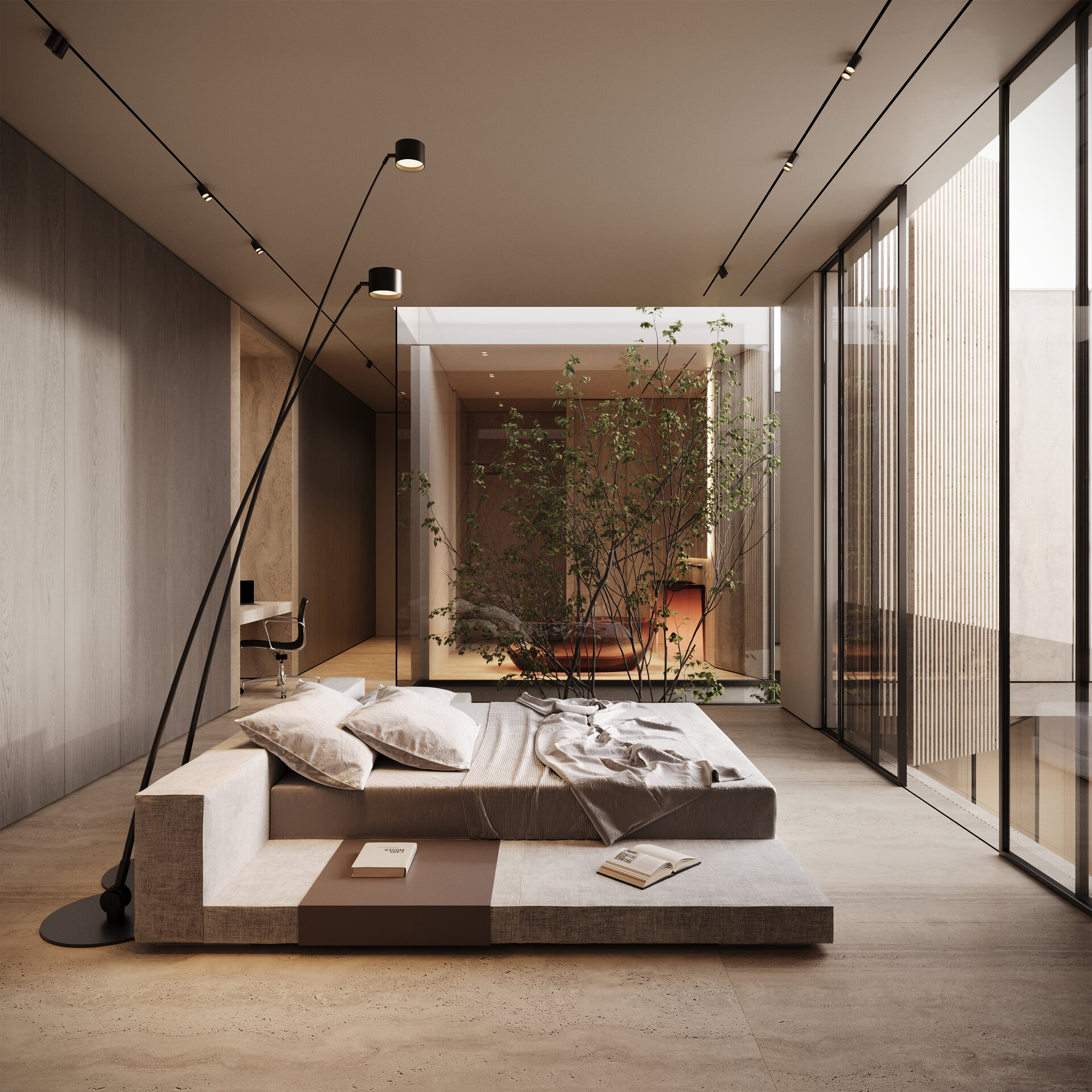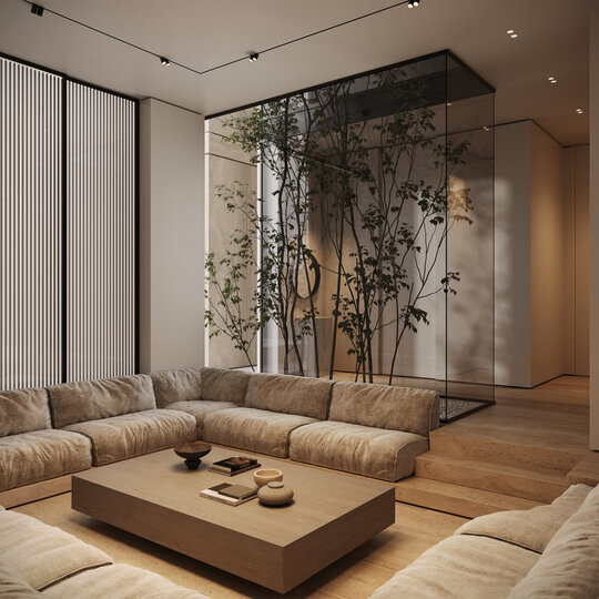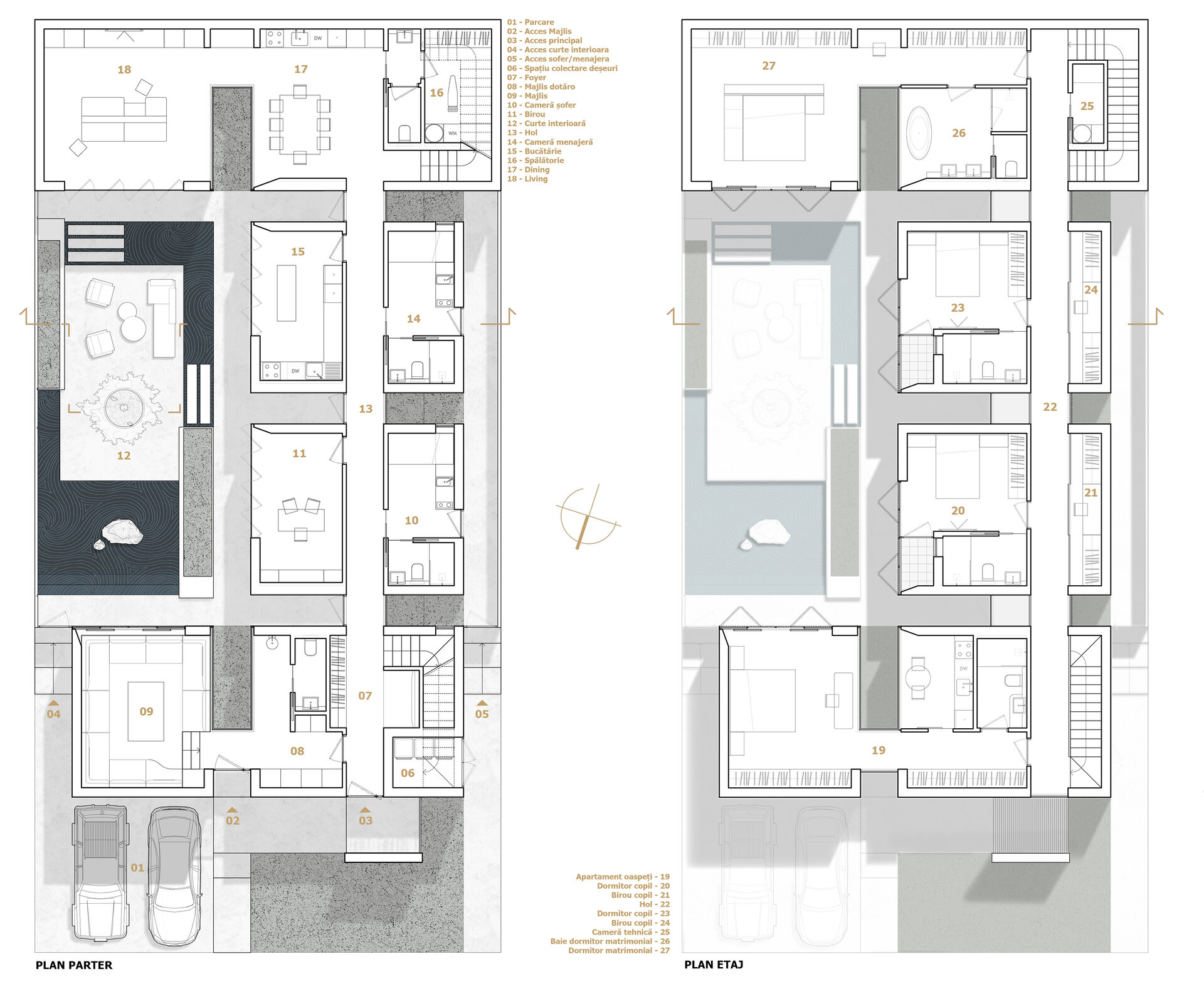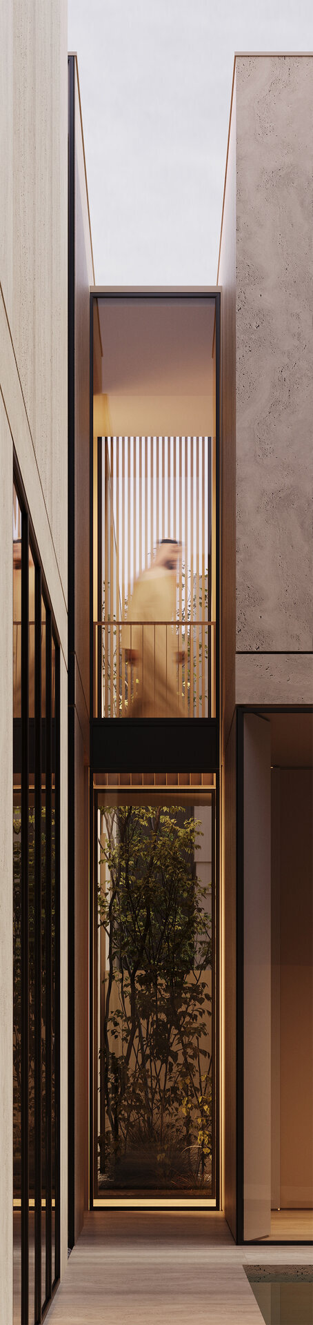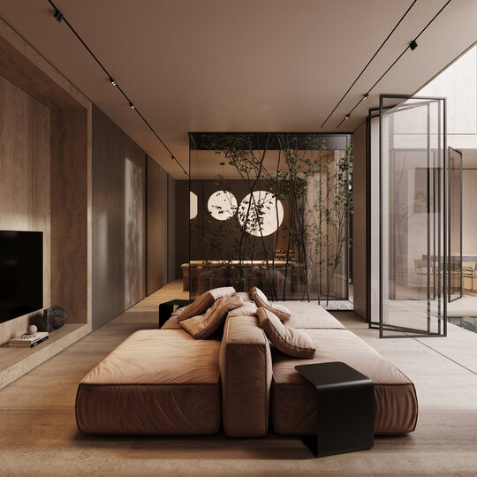 Orientată spre interior, casa generează un cadru intim și protejat. Curțile și terasele umbrite devin extensii ale spațiului interior, definind tranziții confortabile între interior și exterior și contribuind la controlul climatic pasiv.