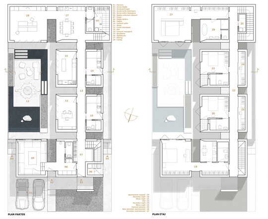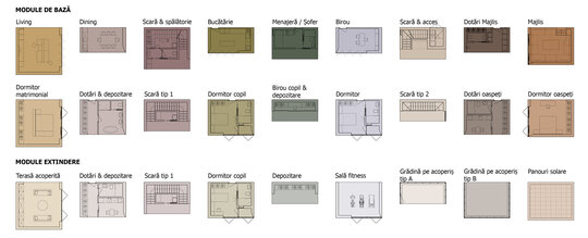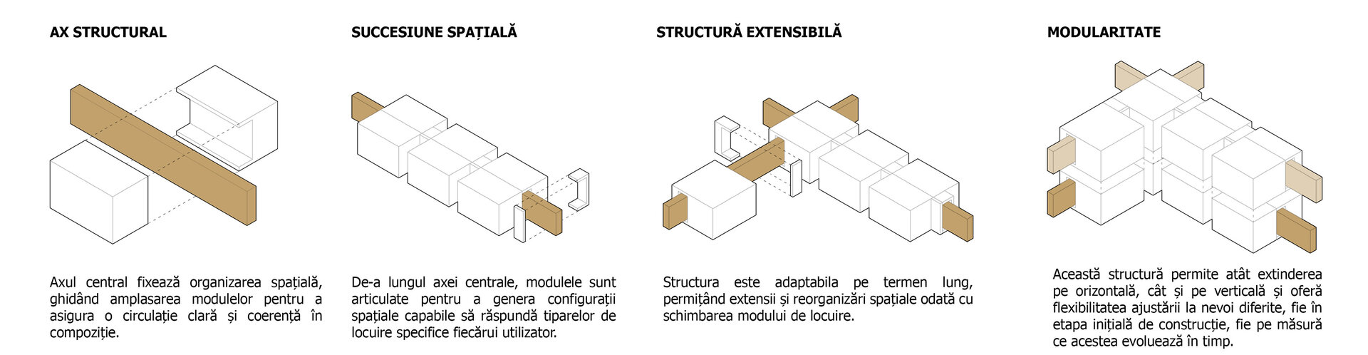 Strategia de dezvoltare este etapizată, având în centru un ax structural care ghidează circulațiile și susține o logică organizațională clară. Modulele sunt articulate secvențial, creând legături fluide între zonele private și cele comune. Sistemul locuinței este pregătit pentru extinderi atât pe orizontală, cât și pe verticală.