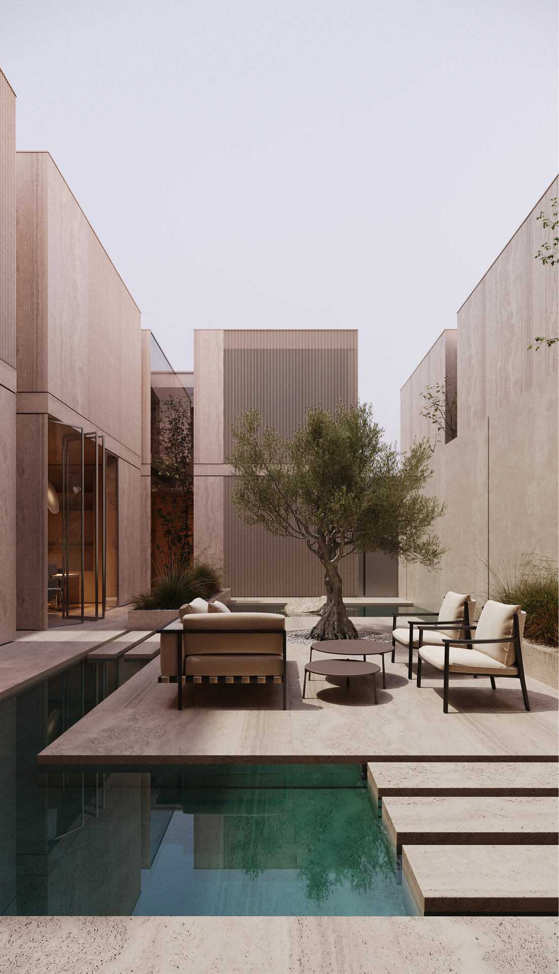 Casa nu mai este gândită ca o structură rigidă, ci ca un cadru adaptabil la context și în timp. Tipologia se inspiră din tradițiile vernaculare ale EAU, unde organizarea orientată spre interior și curțile oferă confort termic și intimitate. Terasele umbrite și spațiile ierarhizate susțin un mod de locuire ce ține cont de aspectele climatice specifice și valorile culturale ce se impun.