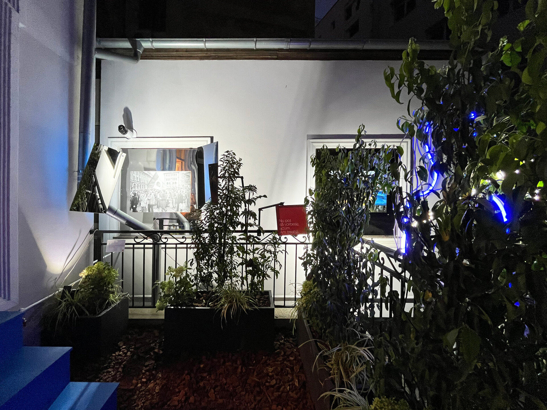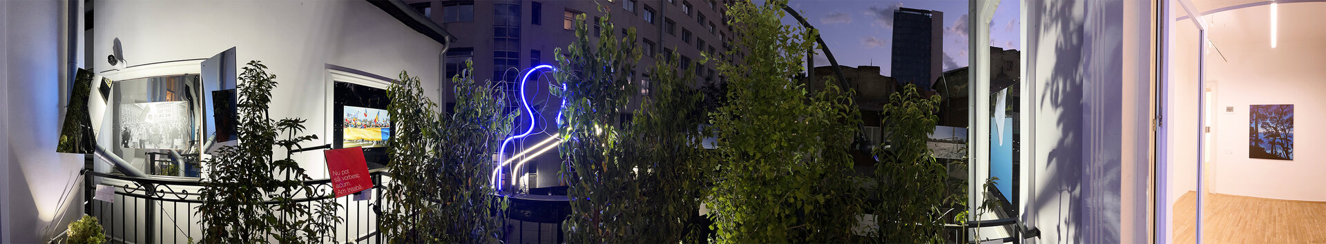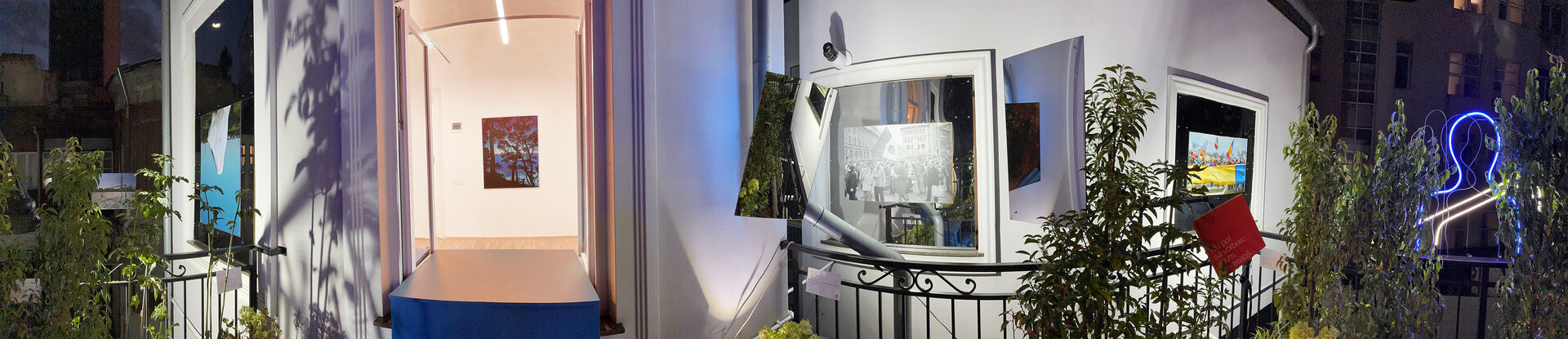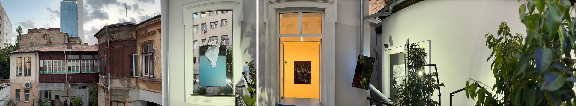 Înstalația constă în proiectarea unei scări demontabile din lemn vopsit, care facilitează circulația din galerie către terasă, extinzând spațiul expozițional cu o galerie exterioară de fotografie. 3 goluri de geam cu dimensiuni variabile și parapetul din fier forjat devin spații de expunere. Sunt generate unghiuri de vizibilitate asupra instalației din interiorul expoziției, de pe terasă cât și din curtea interioara. La sfârșitul programului, podestul se demontează și fereastra se poate închide. Intervenția folosește galeriei și după încheierea expoziției.