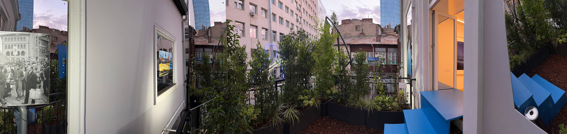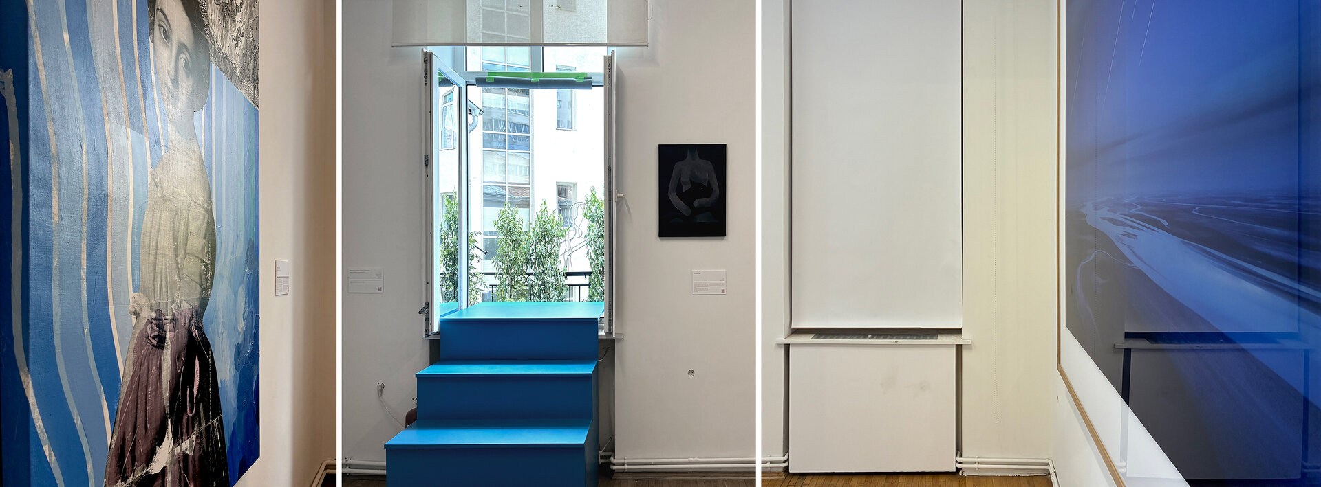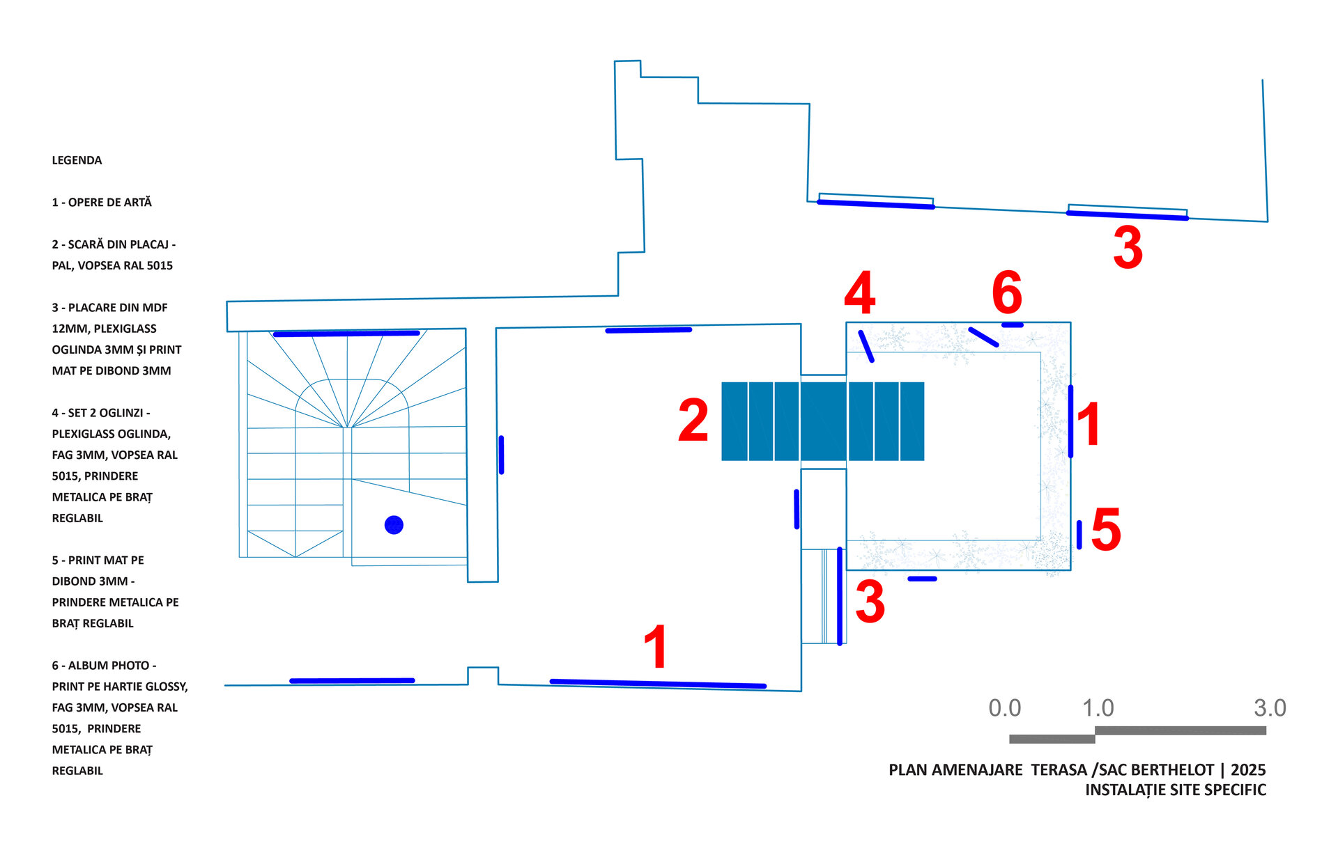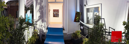 Înstalația constă în proiectarea unei scări demontabile din lemn vopsit, care facilitează circulația din galerie către terasă, extinzând spațiul expozițional cu o galerie exterioară de fotografie. 3 goluri de geam cu dimensiuni variabile și parapetul din fier forjat devin spații de expunere. Sunt generate unghiuri de vizibilitate asupra instalației din interiorul expoziției, de pe terasă cât și din curtea interioara. La sfârșitul programului, podestul se demontează și fereastra se poate închide. Intervenția folosește galeriei și după încheierea expoziției.