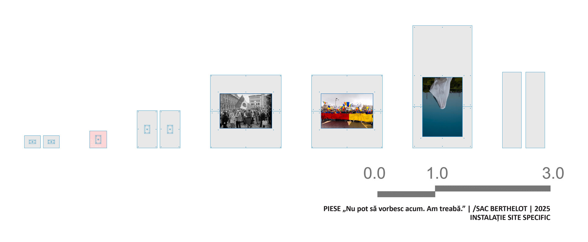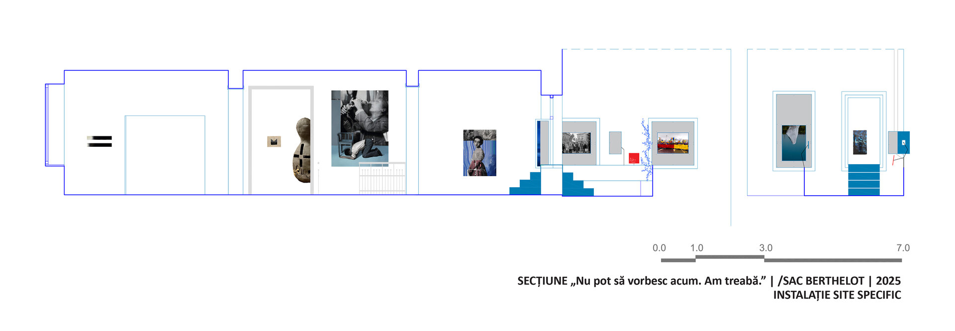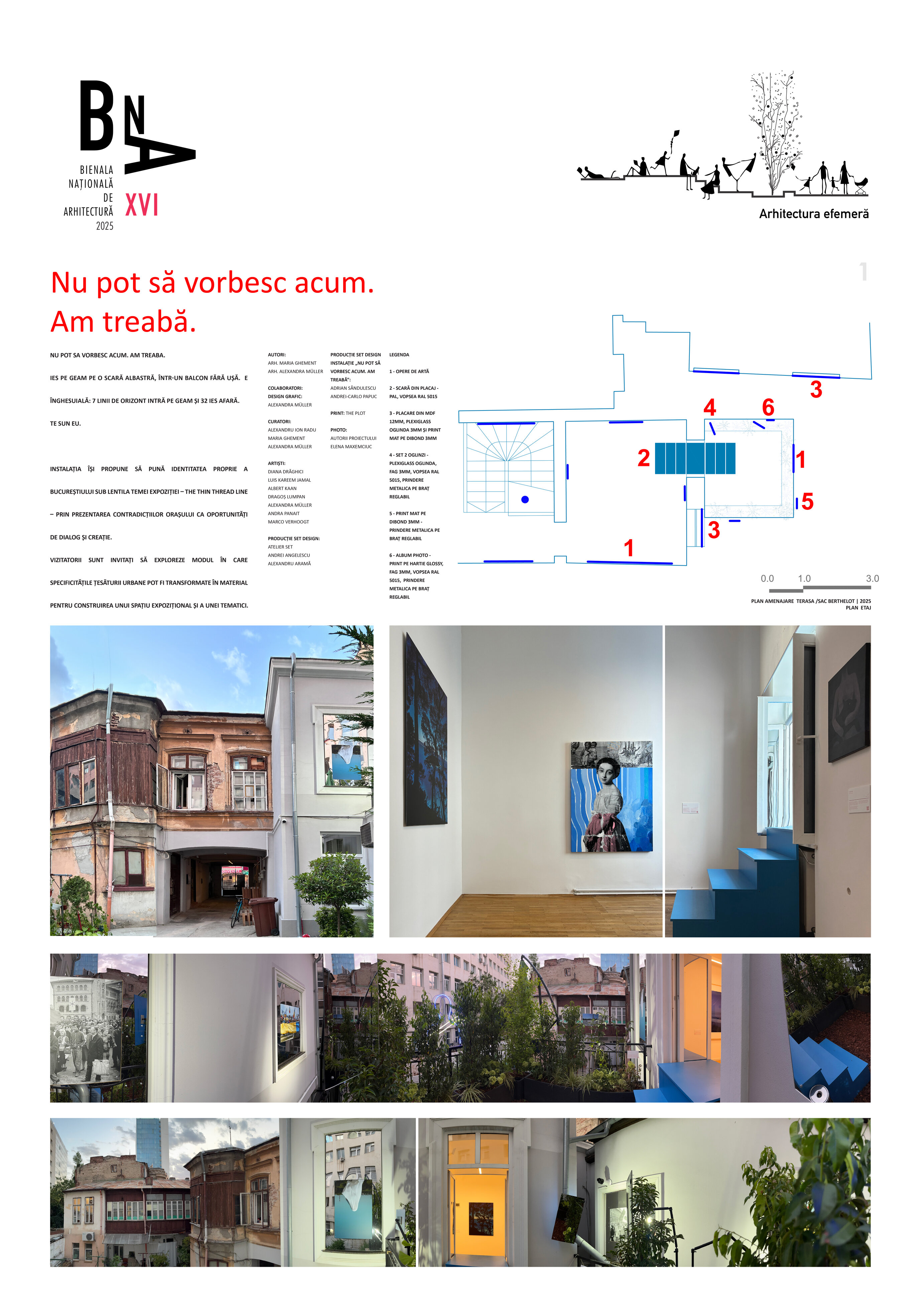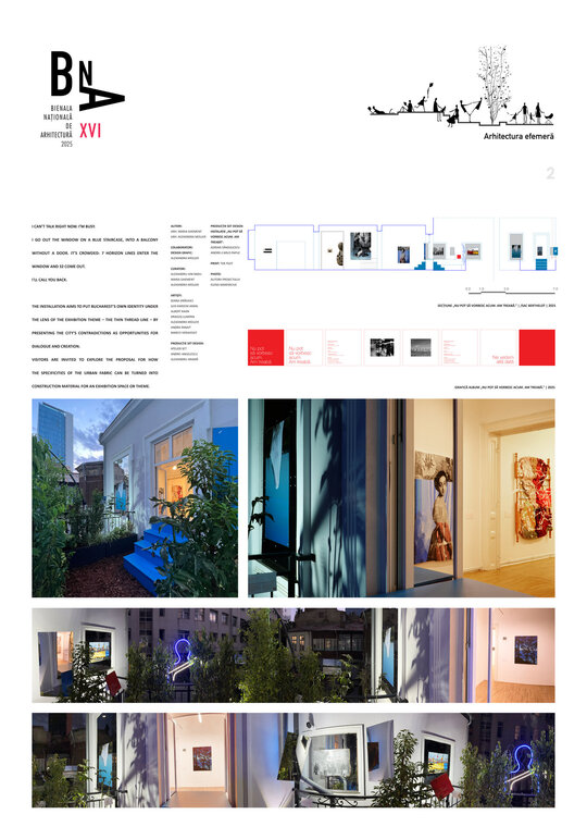 Vizitatorii sunt invitați să exploreze modul în care specificitățile țesăturii urbane pot fi transformate în material pentru construirea unui spațiu expozițional și a unei tematici.