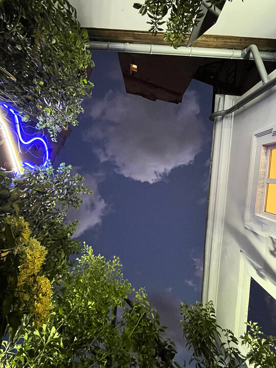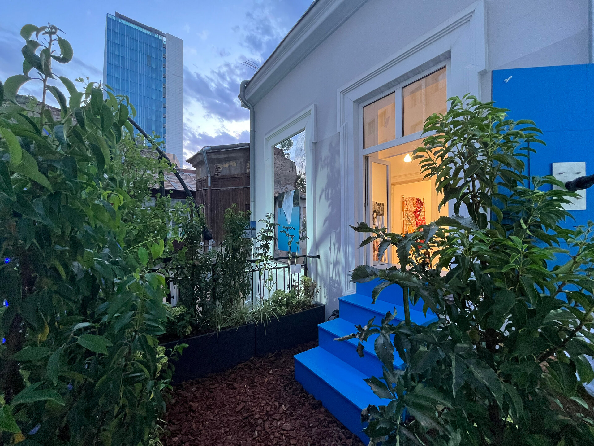 Ies pe geam pe o scară albastră, într-un balcon fără ușă. E înghesuială: 7 Linii de orizont intră pe geam și 32 ies afară.