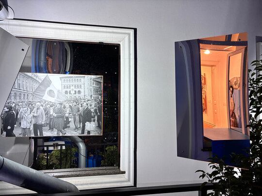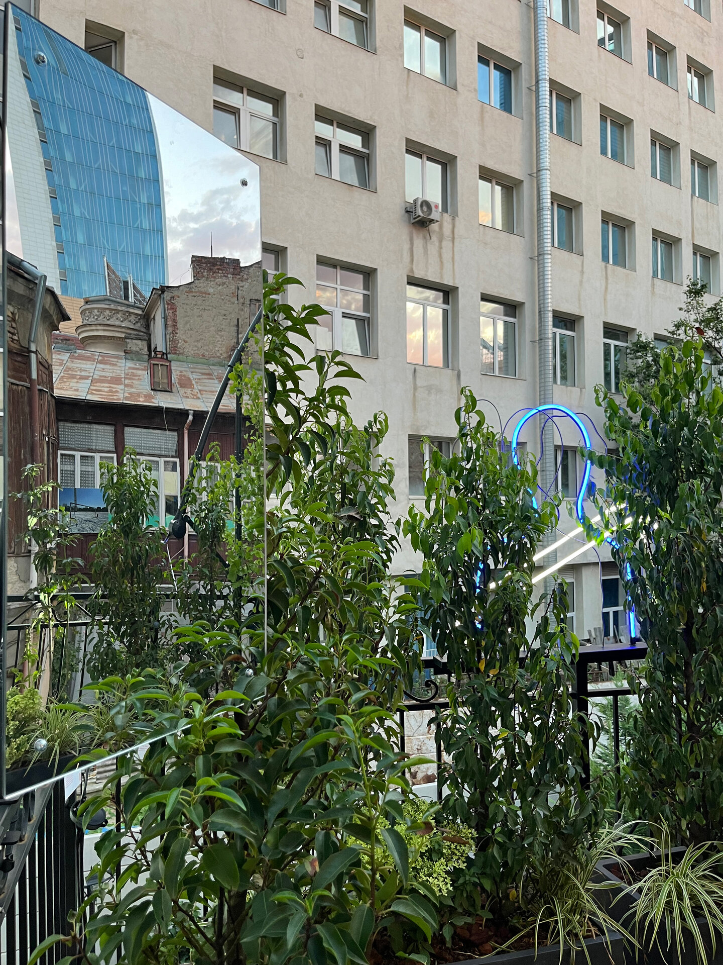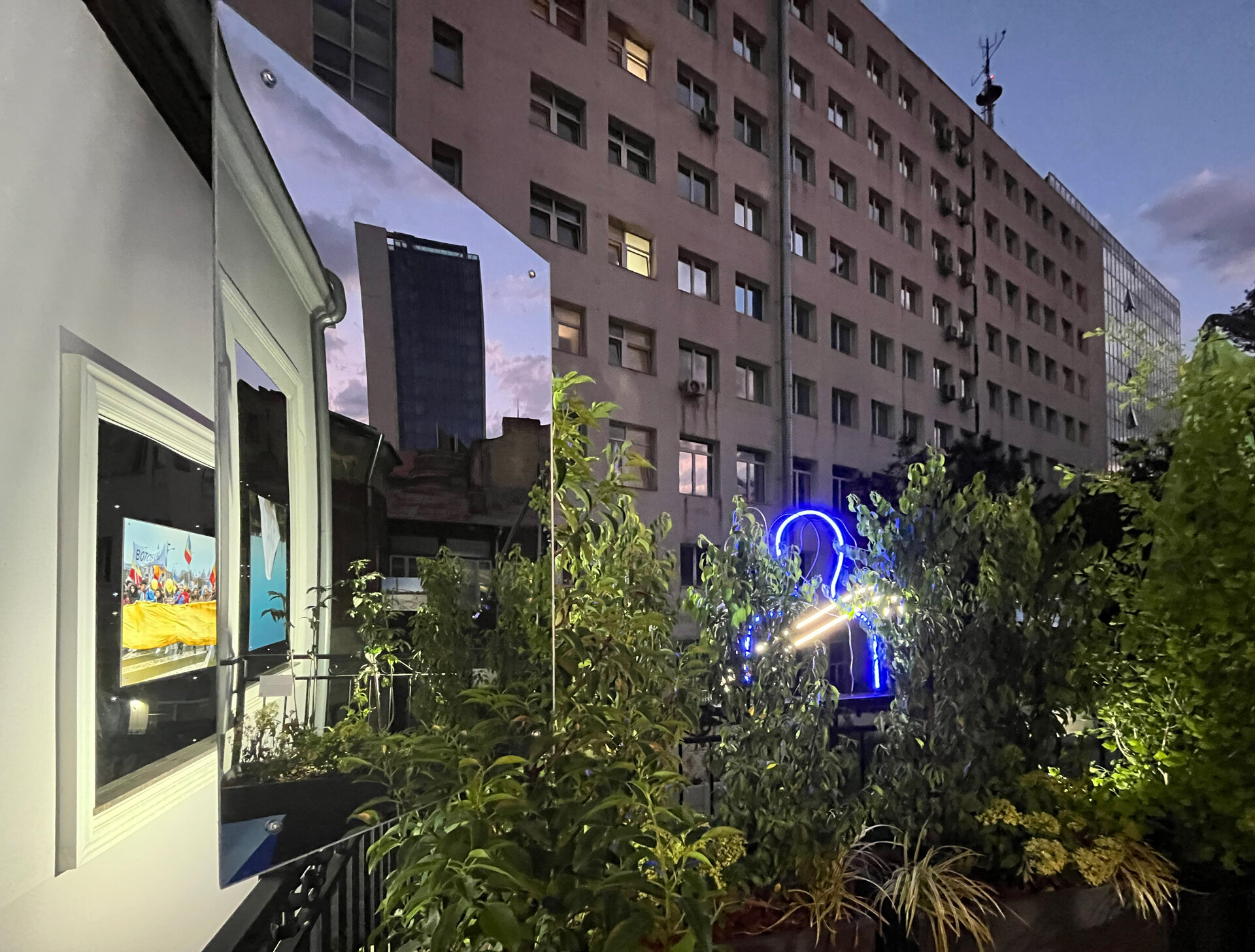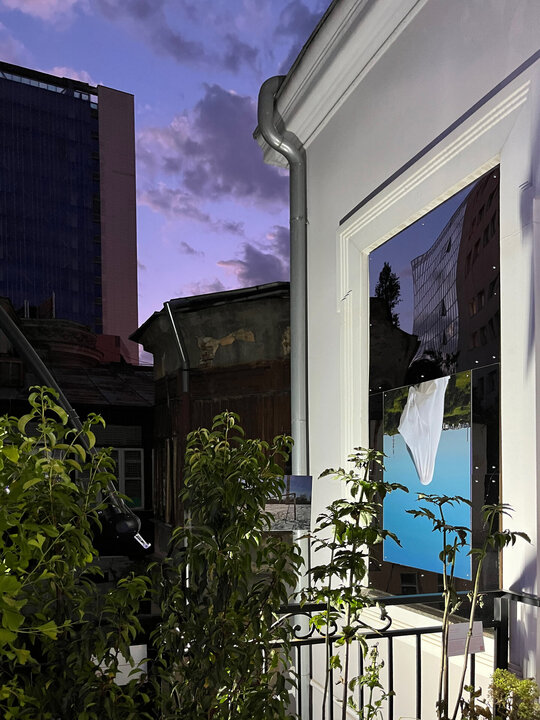 Oglinda devine aici un instrument: reflectă cerul și pereții, dar și pe vizitatorul prins între interior și exterior. Ea nu arată doar imaginea, ci și ruptura – distanța dintre ce promite orașul și ce oferă de fapt. Folosită ca material principal, captează fragmente din București și le suprapune peste figura celui care privește, transformând terasa absurdă într-un cadru de dialog despre condiția de a trăi în orasul de azi, unde fiecare pas înainte este simultan o confruntare cu un obstacol. Perspectivele marchează granițe fragile, dar și posibile legături, punând în evidență firul subțire, iar reflecțiile se transformă într-o mediere: ce ne mai leagă de oraș, ce ne respinge, ce putem încă regăsi ca punct comun.