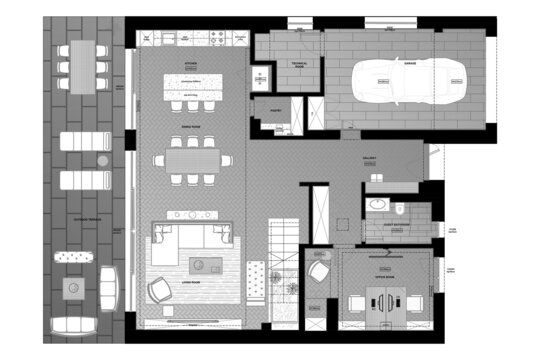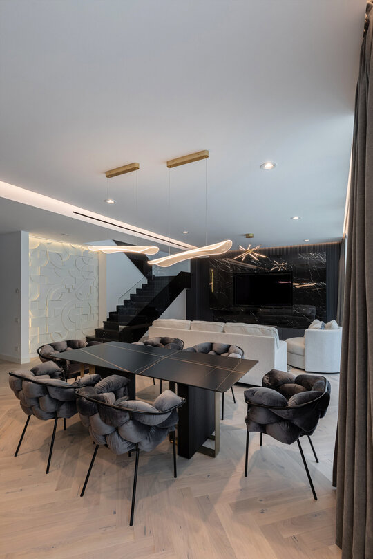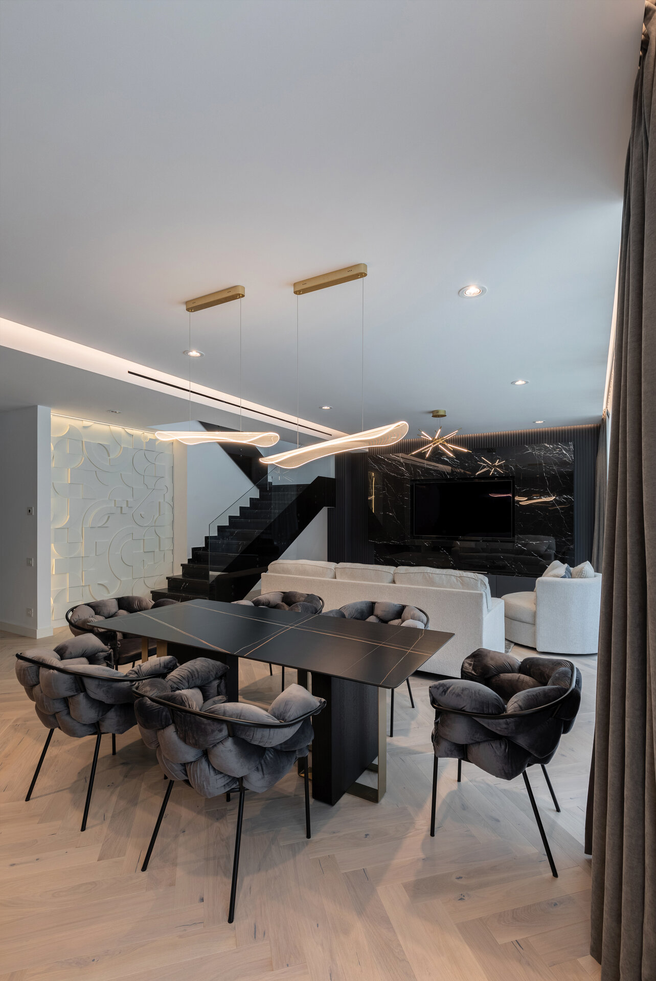 Parcurgând nivelurile casei descoperim o poveste care se adaptează fiecărui spațiu, trecând de la estetica eleganței contemporane la cea cu caracter industrial. Liniile geometrice, materialele prețioase și iluminatul strategic contribuie la crearea unui cămin primitor, iar elementele funcționale perfect integrate și mobilierul personalizat asigură un echilibru armonios între confort și estetică.