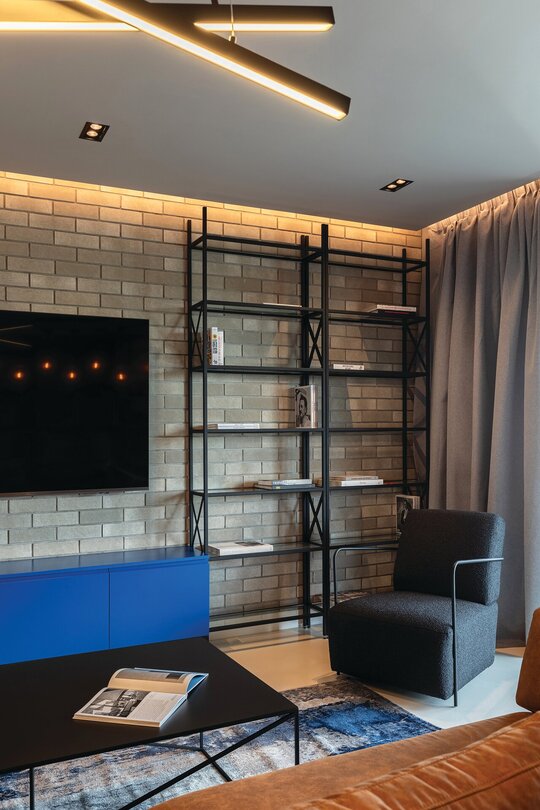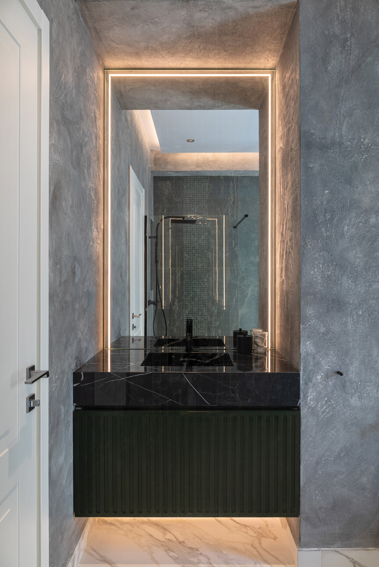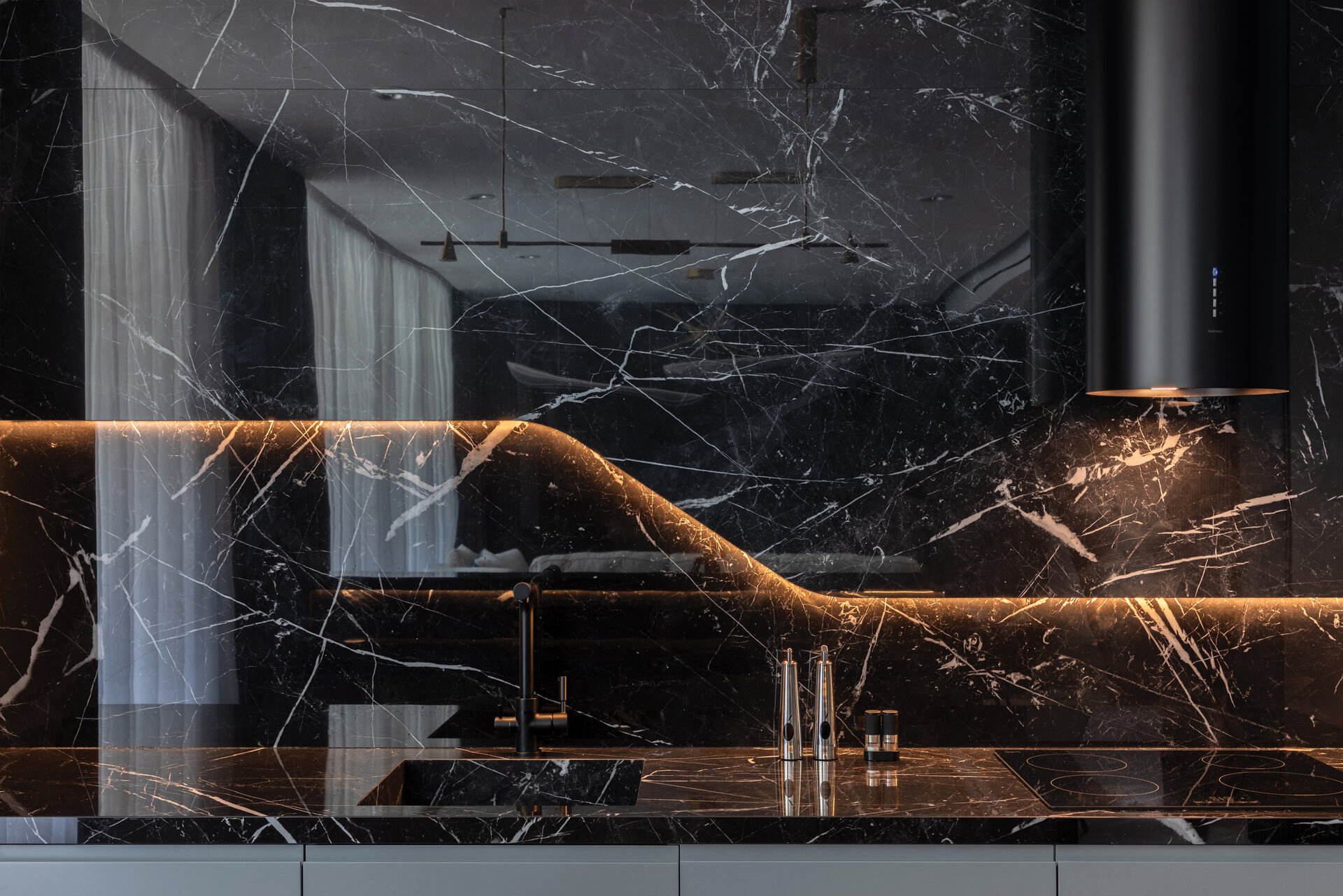 Fiecare spațiu a beneficiat de o atenție sporită, totodată fiind gândit ca parte componentă a aceluiași ansamblu. Placările extinse de ceramică, nuanțele închise, corpurile de iluminat și piesele de mobilier statement creează un impact puternic, fără a compromite confortul locuinței. Placarea peretelui din bucătărie o oglindește pe cea a peretelui din living, iar insula, pe lângă rolurile ei funcționale – loc de luat masa, suprafață de lucru, depozitare – acționează ca factor coeziv și demarcativ deopotrivă între bucătărie și dining.
