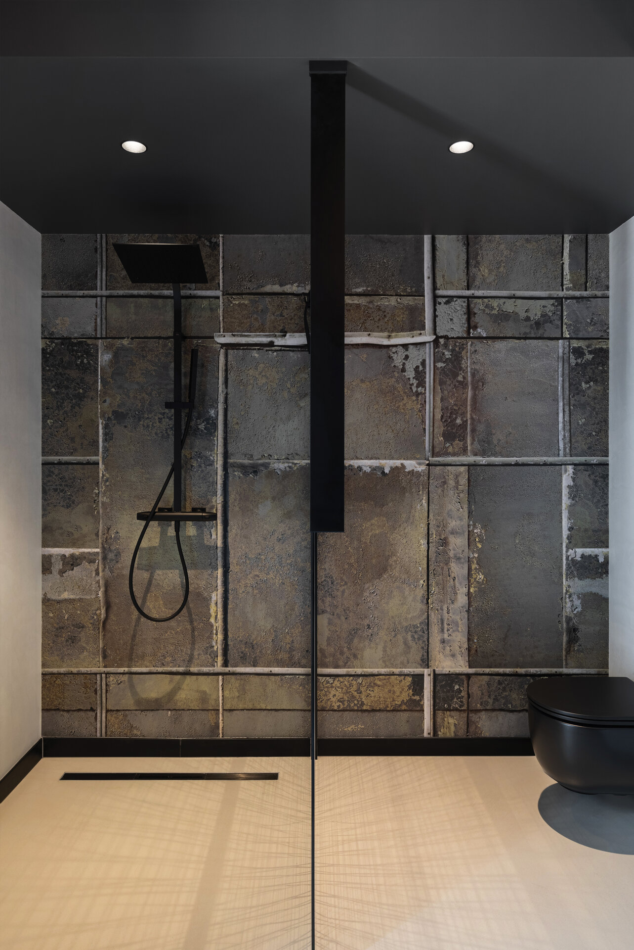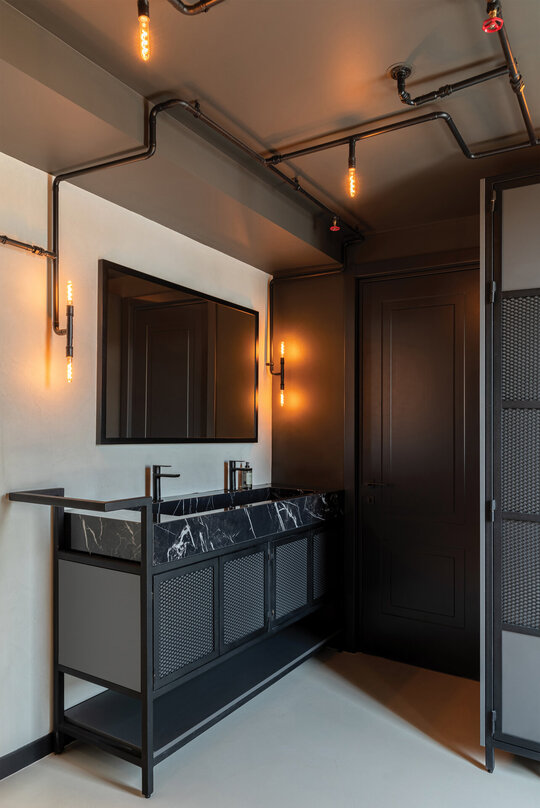 Dormitorul matrimonial este caracterizat de o atmosferă ce invită la relaxare, prin paleta cromatică unitară, temperată și detaliile discrete. Cele două laturi ale dressingului au fost realizate cu frezări delicate și detalii prețioase ale mânerelor placate cu ceramică. Latura cu oglindă asigură accesul spre baia matrimonială, unde mobilierul personalizat, în nuanță deschisă, echilibrează vizual placajele și obiectele sanitare negre, în timp ce iluminatul adaugă profunzime volumelor și texturilor. Etajul al doilea ne rezervă un open-space pentru petrecerea timpului liber, unde influențele industriale și accentele de culoare creează o atmosferă relaxată, fără a pierde complet conexiunea estetică cu celelalte niveluri.