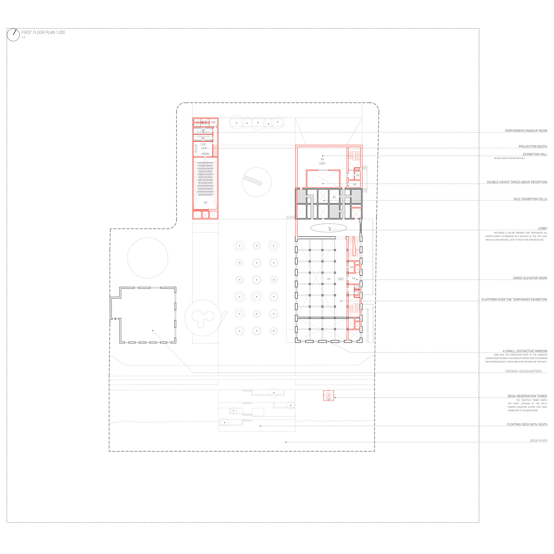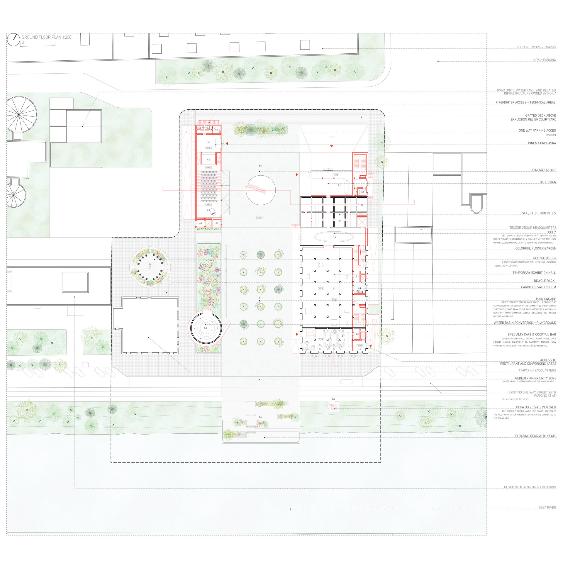 Transformarea propusă include funcțiuni diverse: spații de coworking, săli de expoziție, un cinema multifuncțional, o cafenea, o biblioteca și un restaurant cu vedere panoramică asupra canalului Bega și a orașului Timișoara. Organizarea planului propune deschiderea spațiilor principale către zona de piațetă, oraș și apă, grupând anexele spre limita de proprietate. Cinematograful este amplasat strategic, conturând împreună cu moara, bazinul de apă și perdeaua vegetală din fundal o incintă clară, deschisă spre râu pe a patra latură. Curtea interioară, piațeta, grădinile, turnul și gradenele către Bega devin spații publice accesibile tuturor, nu doar vizitatorilor centrului.