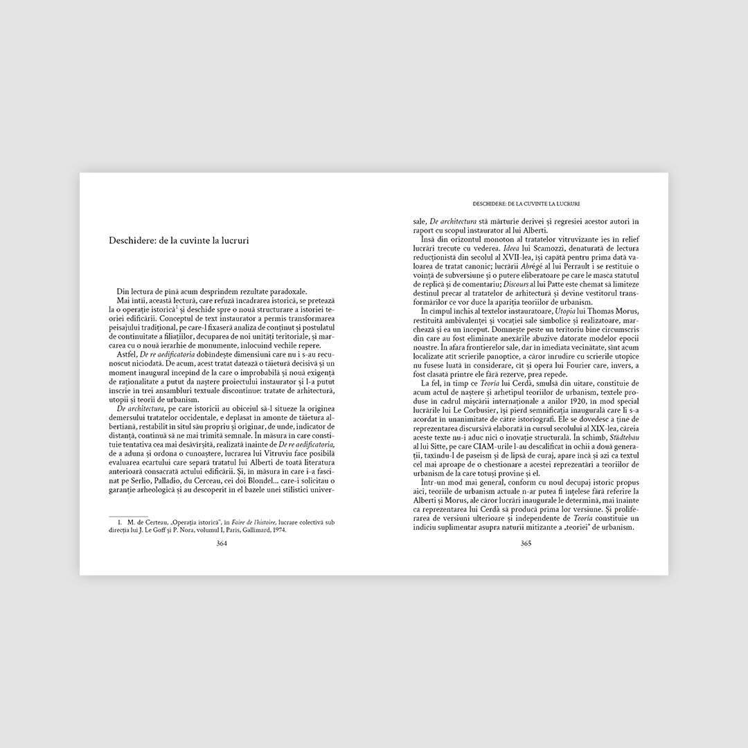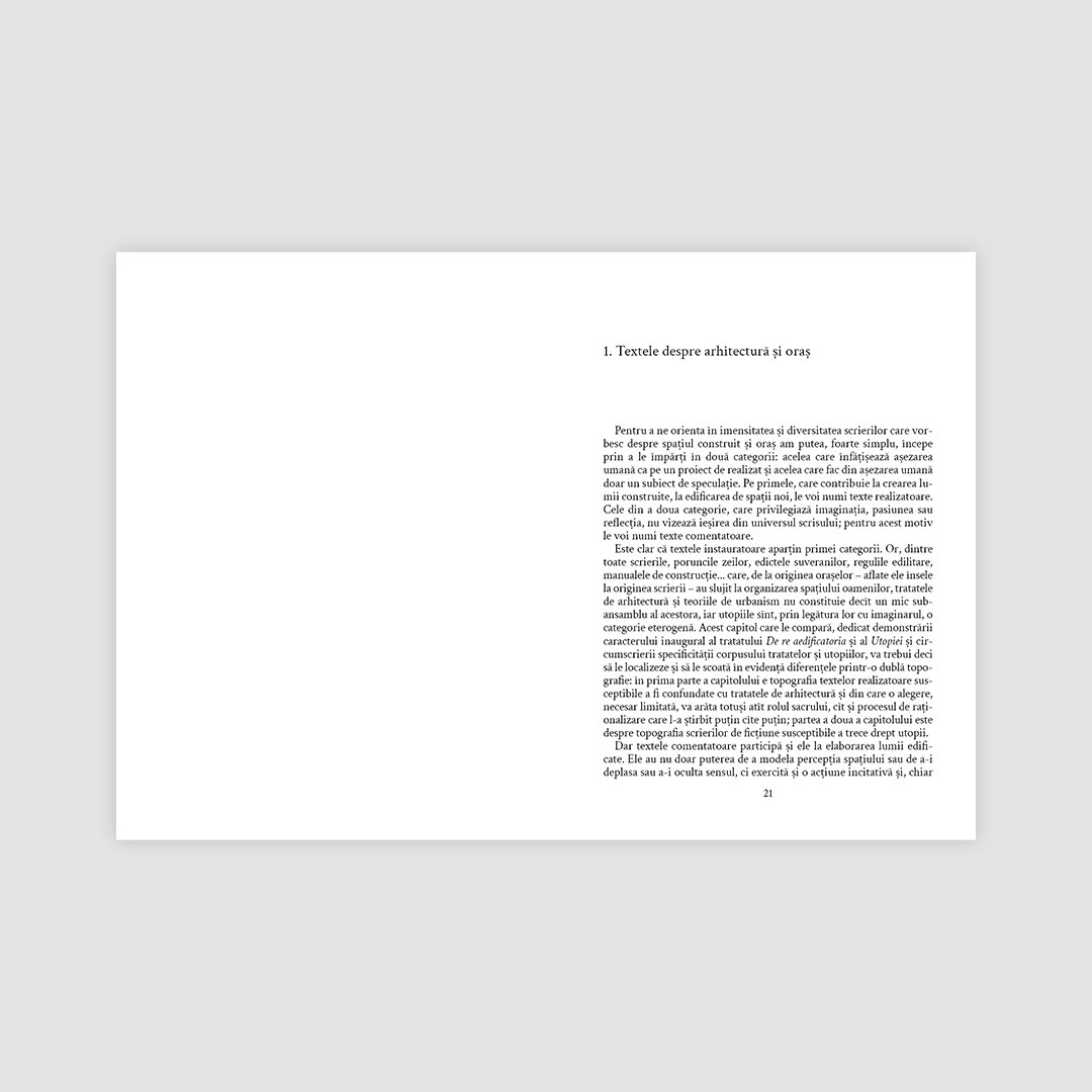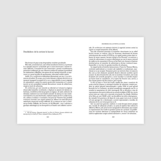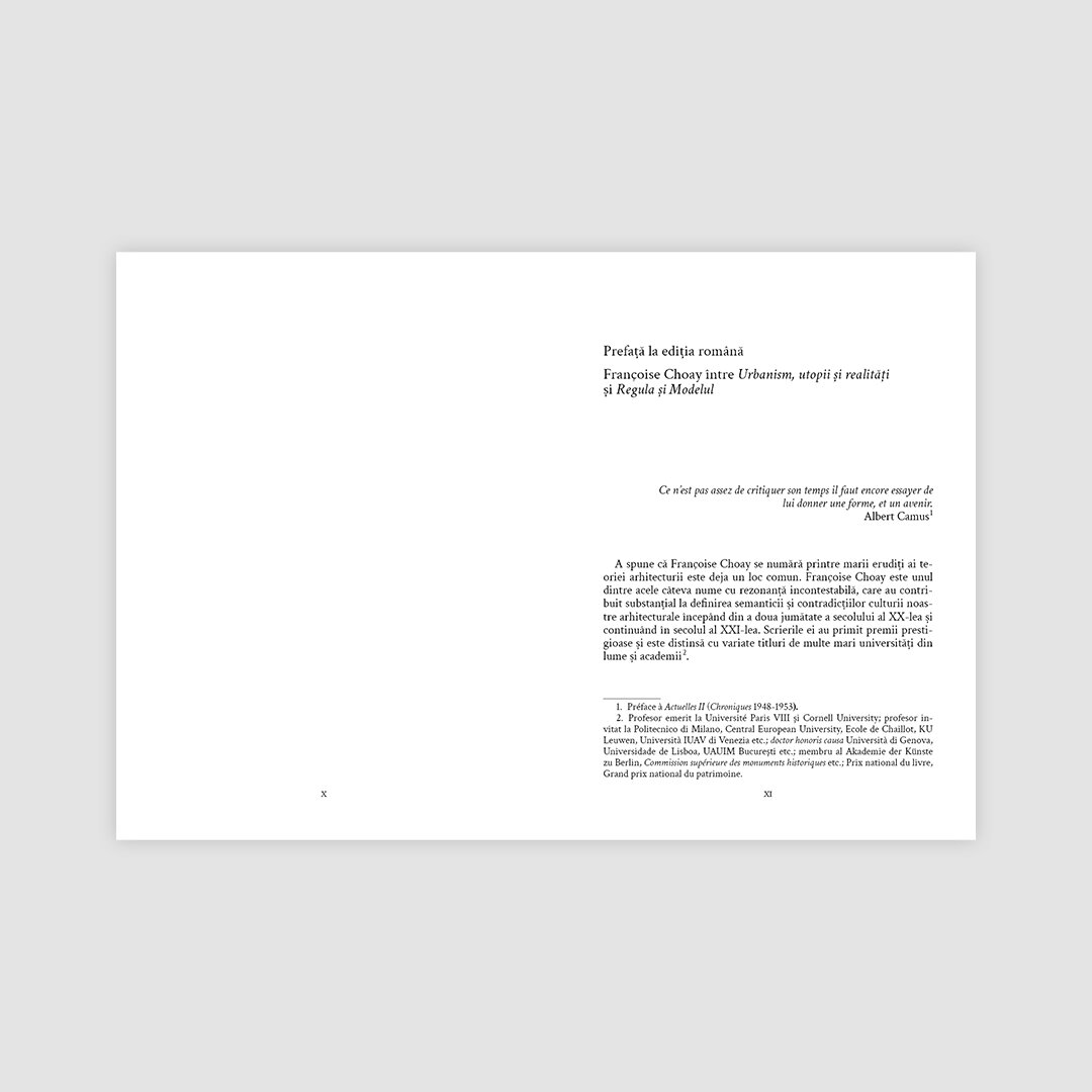 Traducerea în română pe care o semnează Kázmér Kovács este făcută după ultima ediție, actualizată, a cărții. Știu că nu e o carte ușor de tradus și trebuie să spun din capul locului că îl admir și felicit pe traducător pentru această realizare. Dar mai ales, îl invidiez pentru momentele de încântătoare trudă pe care le-a petrecut cu textul lui Françoise Choay.” — Ana Maria Zahariade
