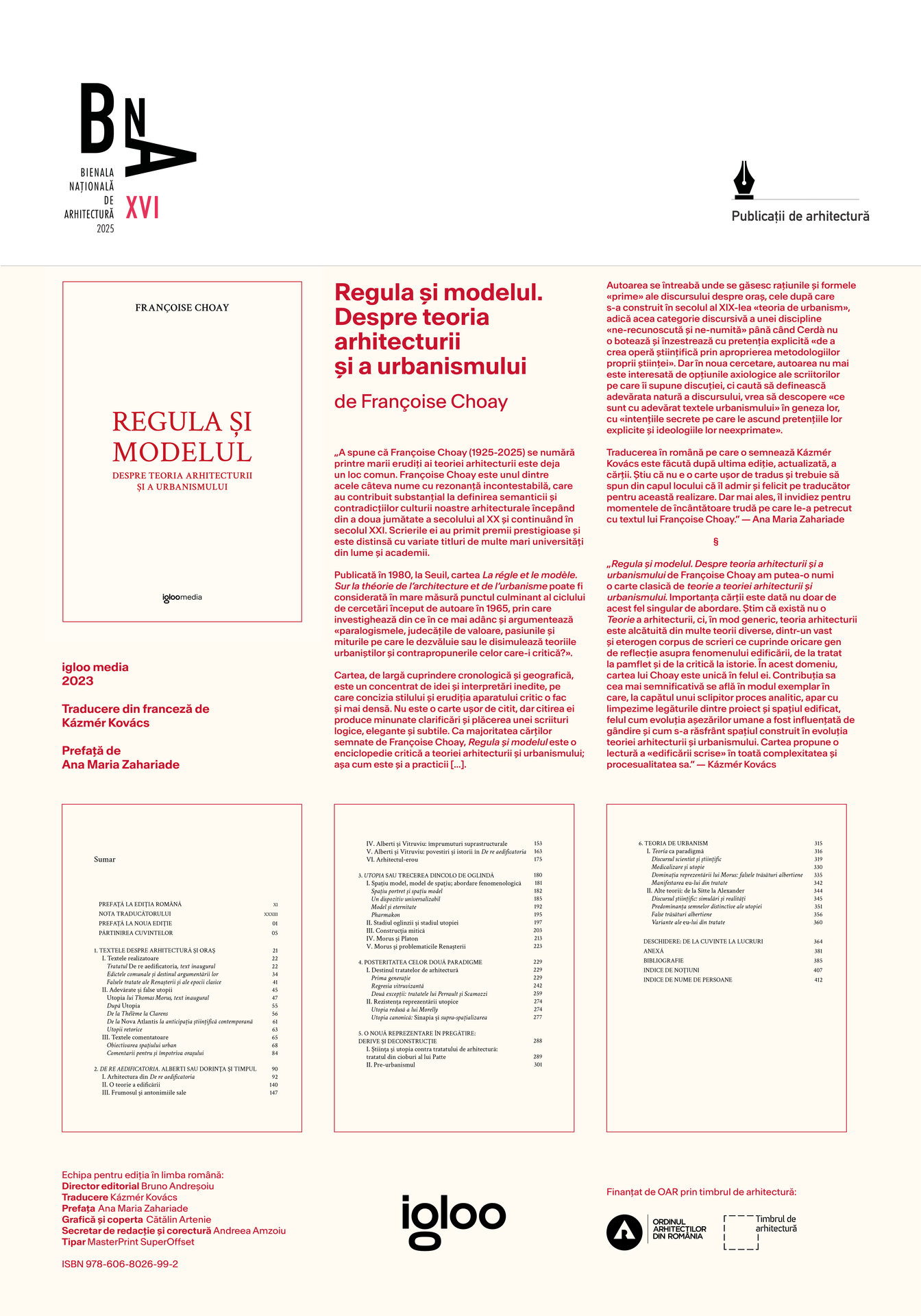 Prin apariția volumului „Regula și modelul. Despre teoria arhitecturii și a urbanismului” de Françoise Choay, igloo media continuă inițiativa de a traduce lucrări fundamentale din domeniul arhitecturii, urbanismului și designului, indispensabile în primul rând formării viitorilor arhitecți.