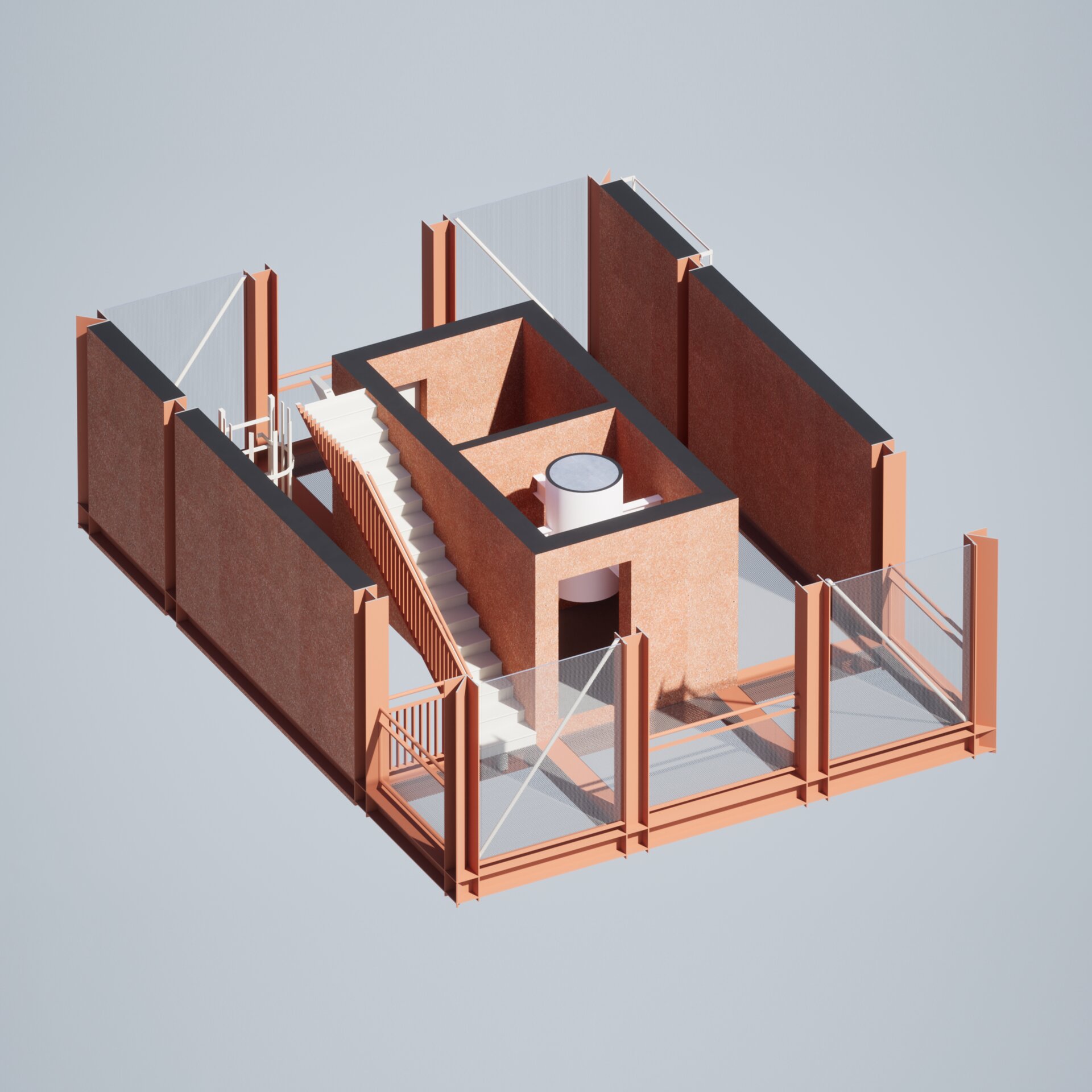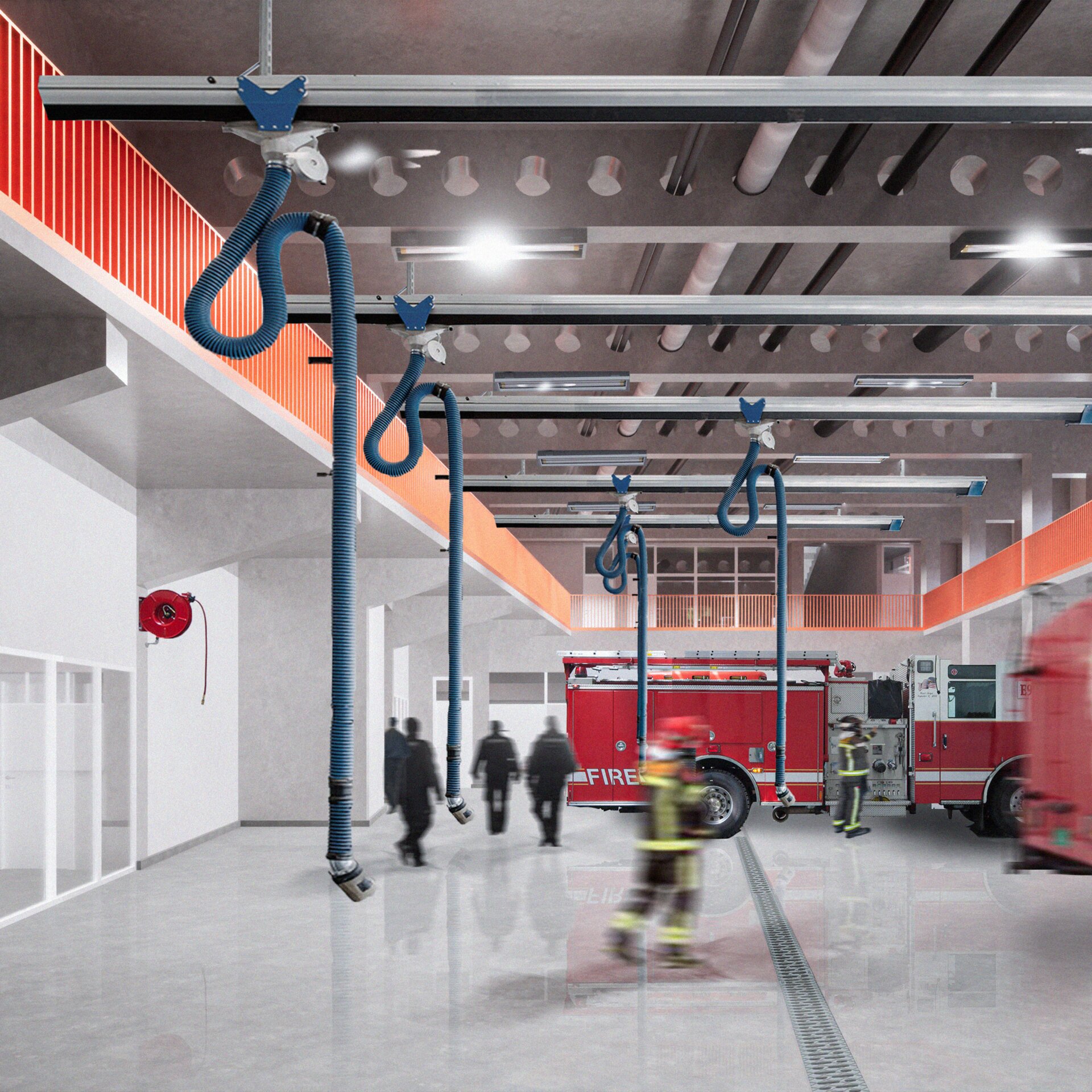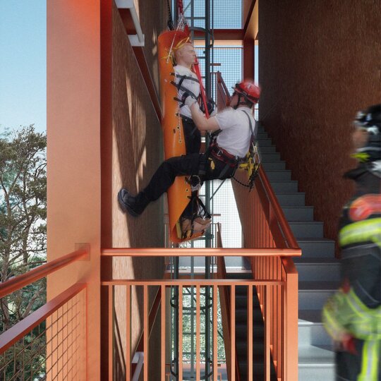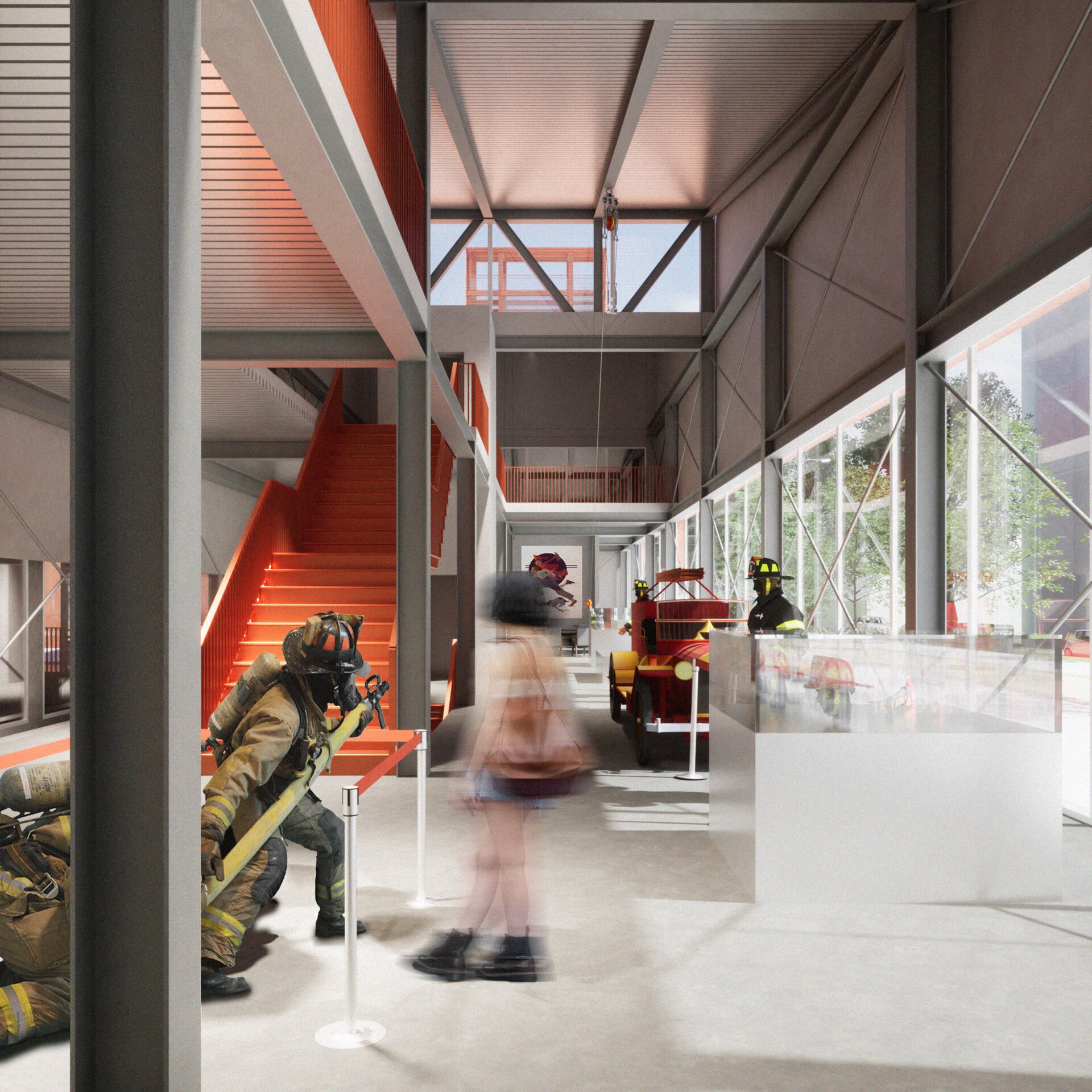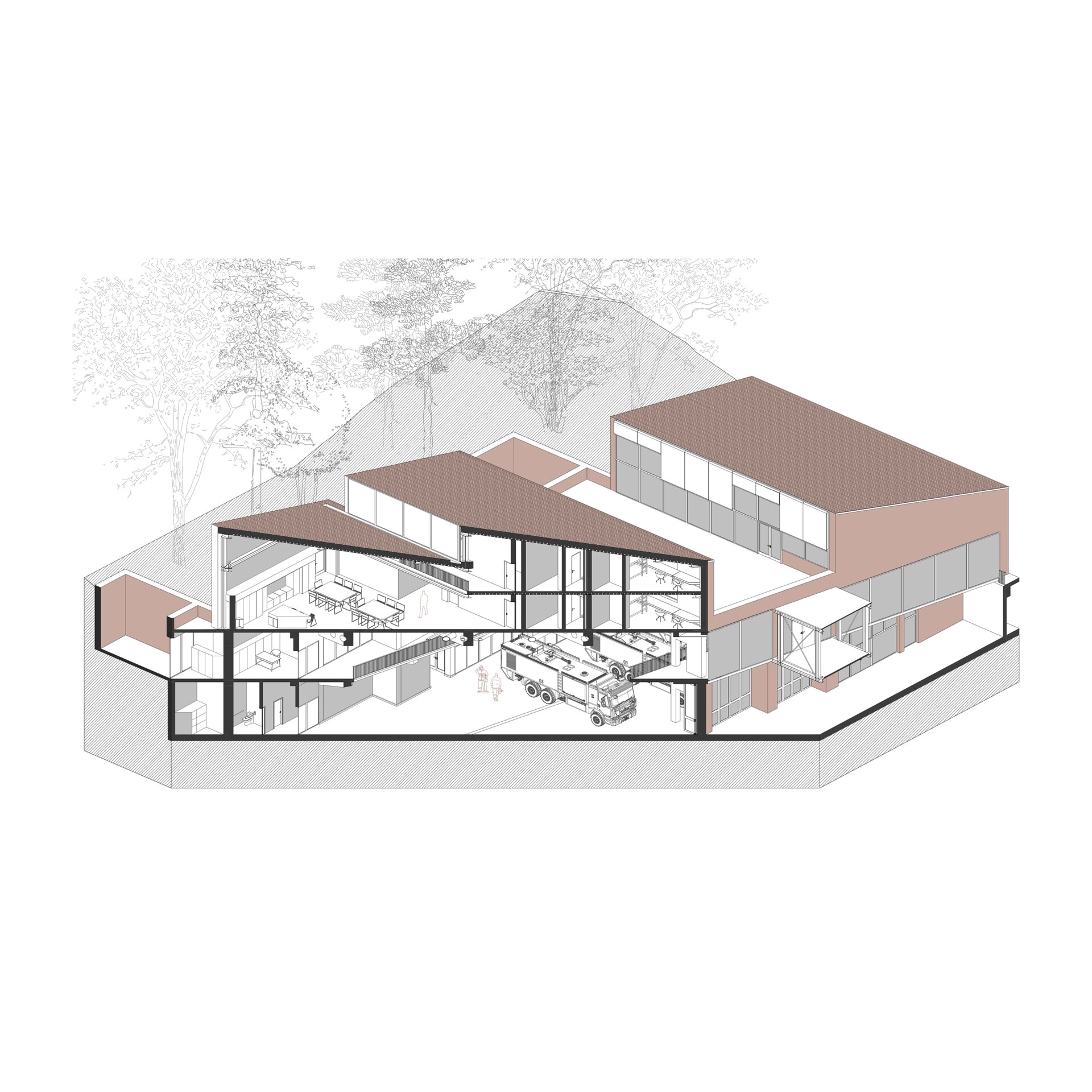 Spațial, propunerea lucrează cu spații de dublă înălțime. Garajul, cel mai amplu ca dimensiune, este vizibil de sus datorită unei circulații perimetrale care leagă spațiile administrative. Volumele destinate pompierilor primesc două etaje de dormitoare cu vedere spre zonele de zi și în relație cu spațiul verde exterior, pentru a creea un mediu orihnitor.