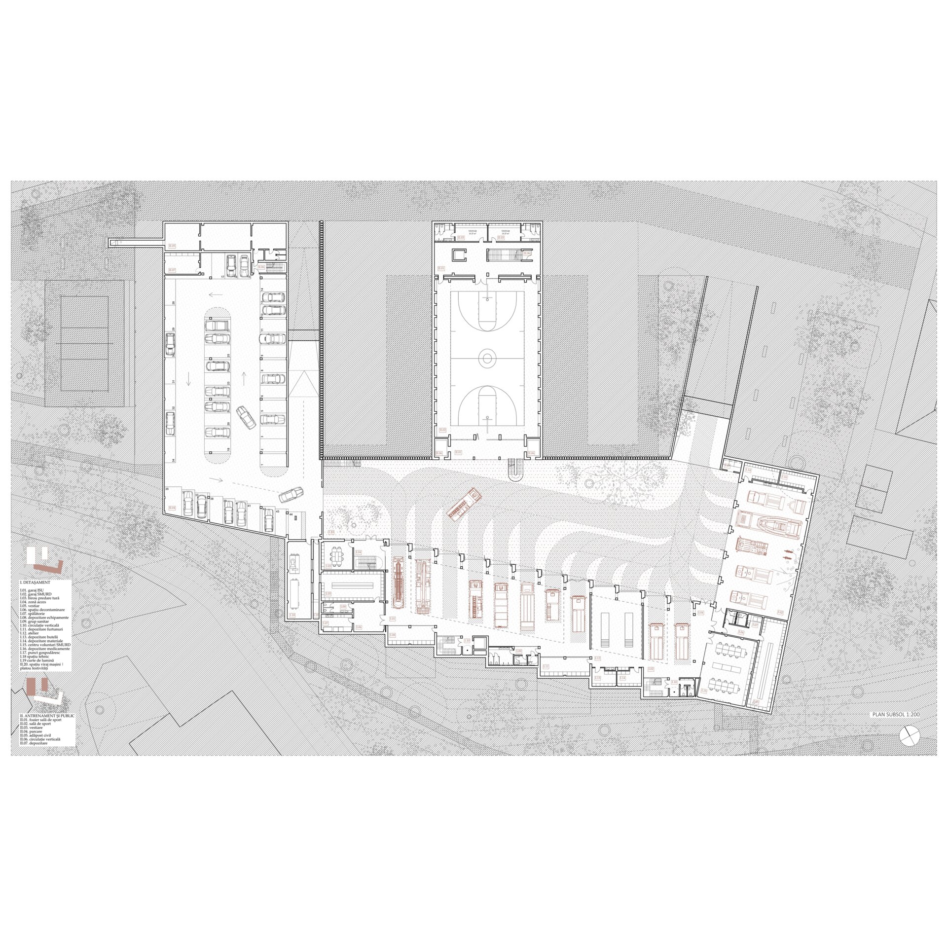 Programul este compus din două zone ample - ISU (destinat stingerii de incendii și descarcerare) și SMURD (intervenția pentru ajutorarea victimelor). Deși dependente una de cealaltă, cele două au caracteristici diferite, astfel, garajul este împărțit în două zone - pentru autospeciale de gabarit mare și cele de ambulanță. Pe langa fragmentarea acestuia, garajul vine parțial îngropat pentru a reduce vizual din gabaritul clădirii.