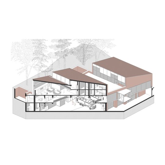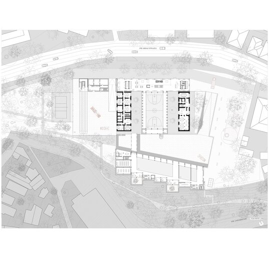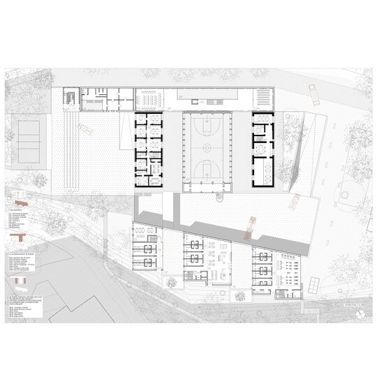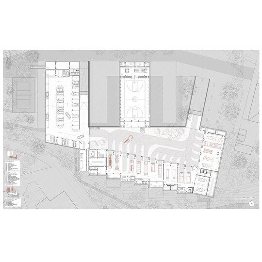 Pentru tranziția public-privat, între stradă și garaj este amplasată sala de sport care poate primi spectatori în timpul evenimentelor. Garajul și zona pompierilor este privată dar datorită curții îngropate, spațiul devine vizibil pentru pieton.