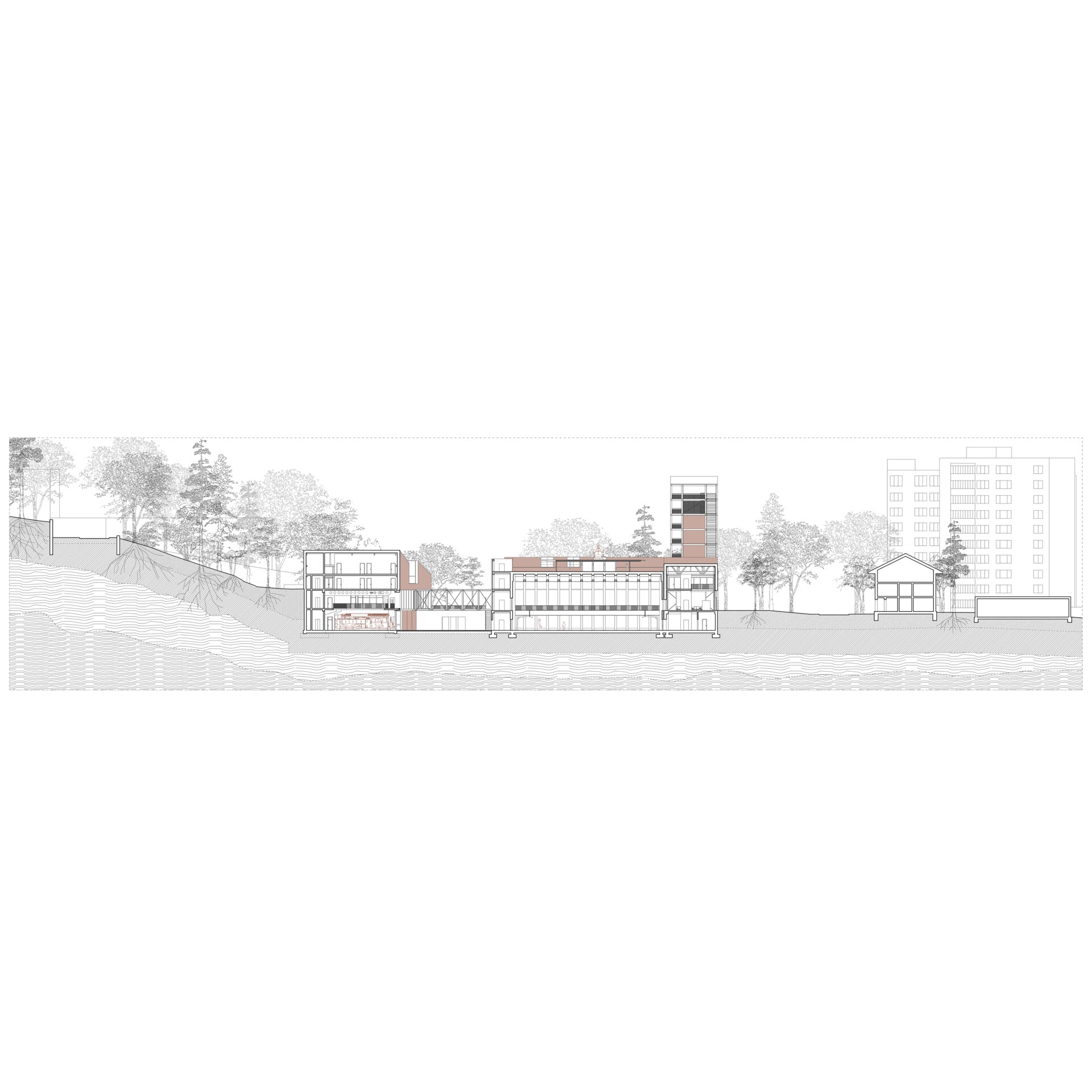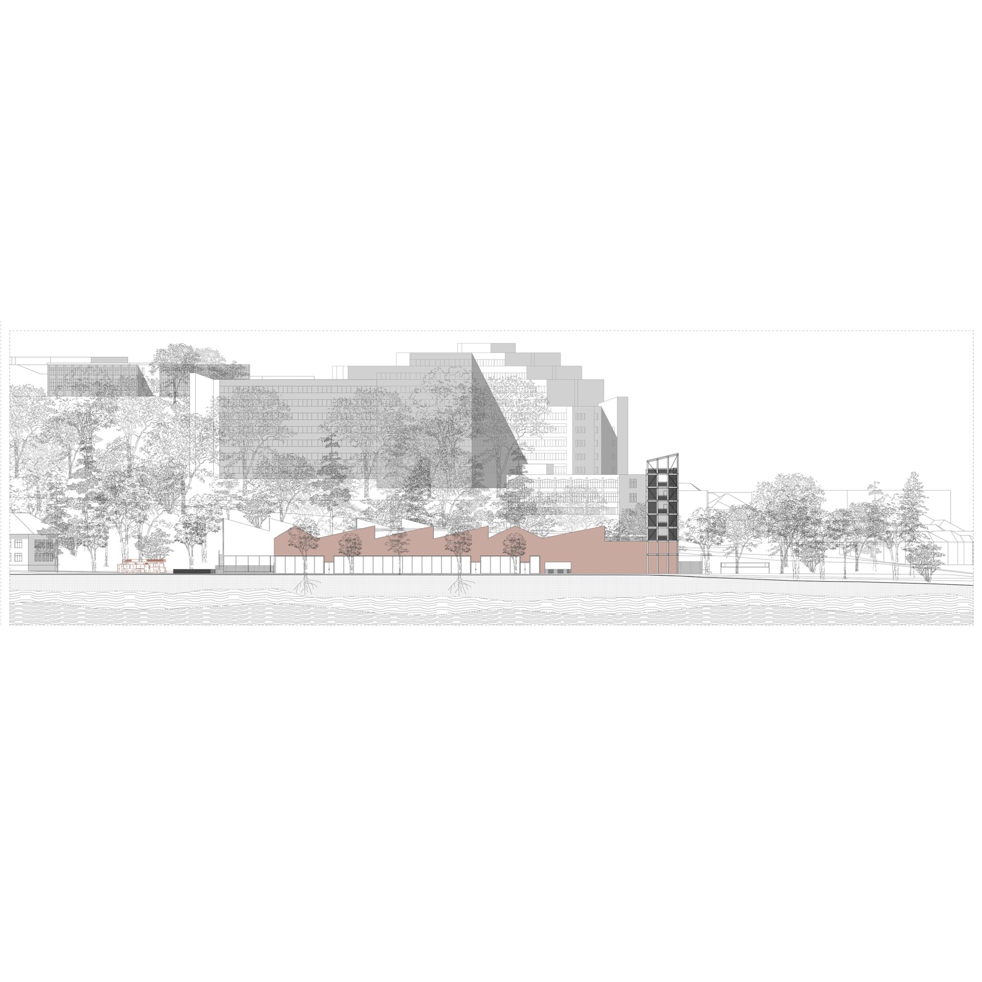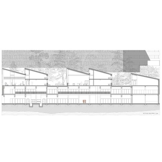Un nou front anunță clădirea în spațiul public. O bară lungă cu șarpante care culminează cu un accent vertical, este răspunsul unitar la un context urban incert. Vitrajul mare spre stradă, cu vedere spre spațiul muzeal oferă la nivelul pietonului o scurtă interacțiune cu interiorul instituției.