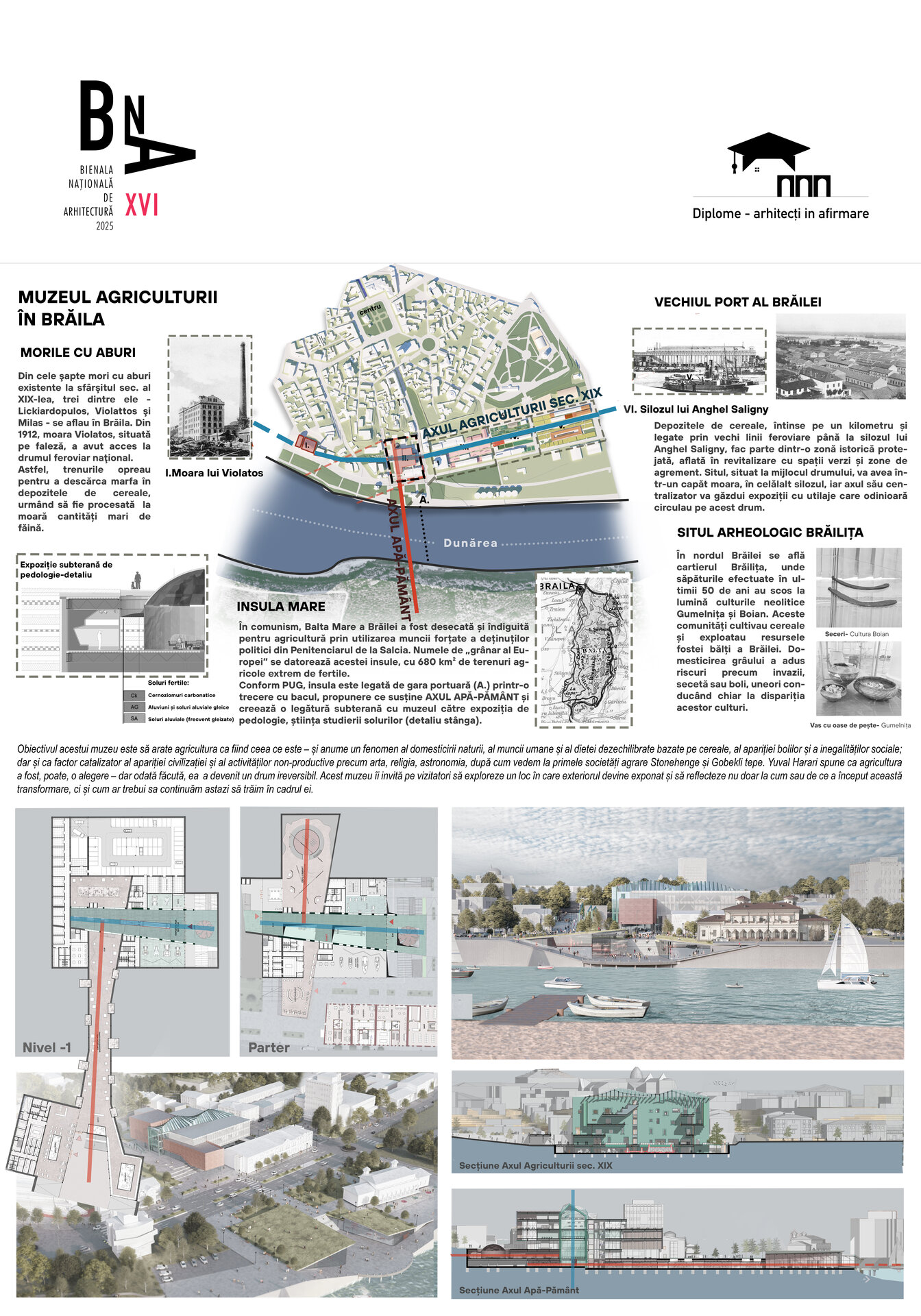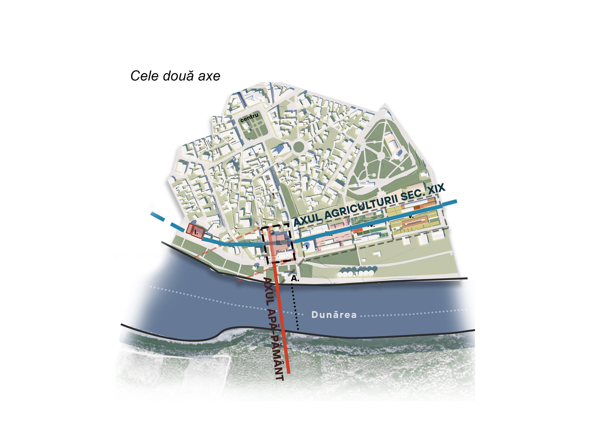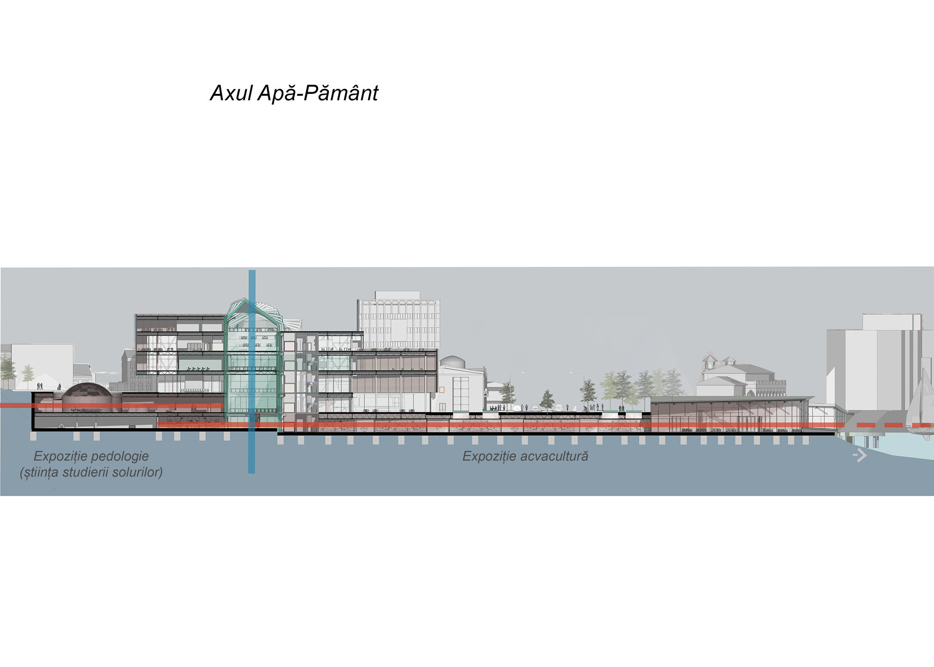 Situl ales se află la intersecția a două axe importante: unul unește halele cu moara Violattos, traversând o expoziție cu utilaje ce obisnuiau să circule pe acest drum. Acest ax se materializează și la suprafață, devenind un corp rosiatic cu o zonă expozițională dedicată morii Violattos și Insulei Mari, fiind un volum care priveste spre acestea. Celălalt ax, axul ,,apă-pământ", leagă centrul Brăilei de faleză, intersectând axul agriculturii sec. XIX și, prin trecerea cu bacul a propunerii PUG, axul continuă până pe Insula Mare. De-a lungul său se desfășoară în subteran o expoziție de acvacultură și pedologie, studiul solurilor fertile. Expozitiile etajelor superioare sunt orientate către moară, port și Strada Mare, astfel exteriorul devine el însuși exponat, parte integrantă a parcursului muzeal.