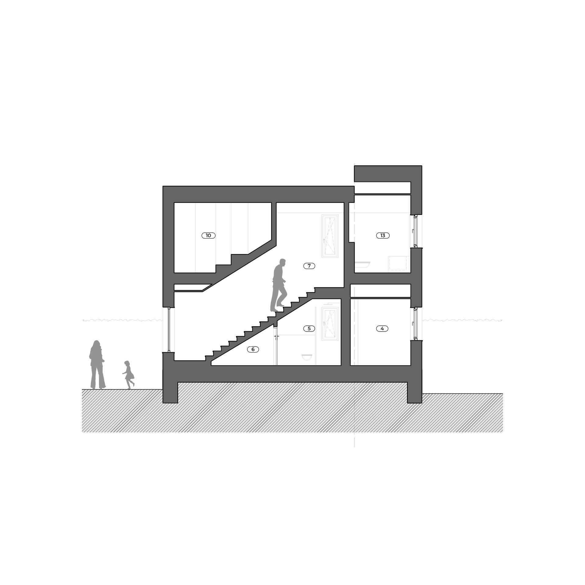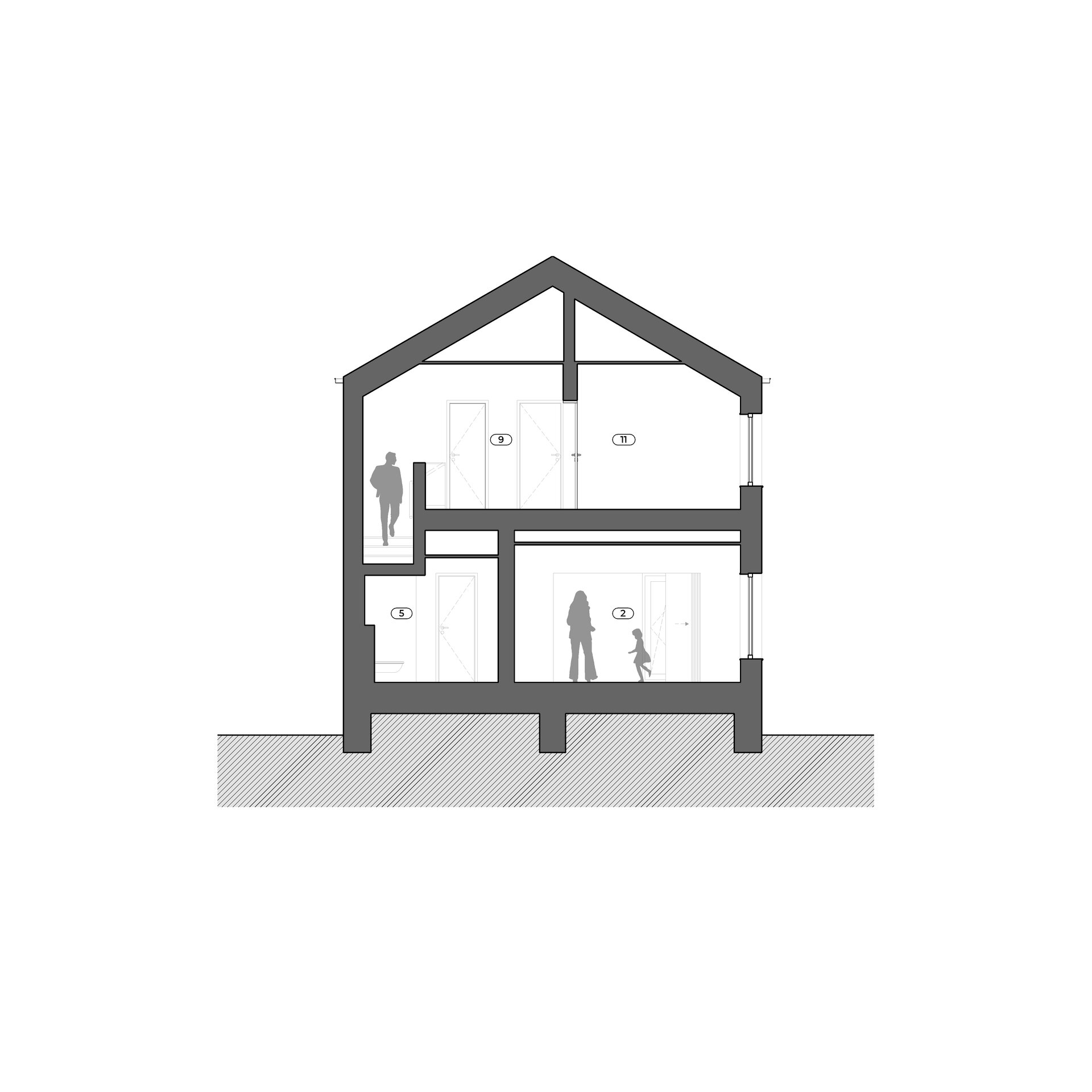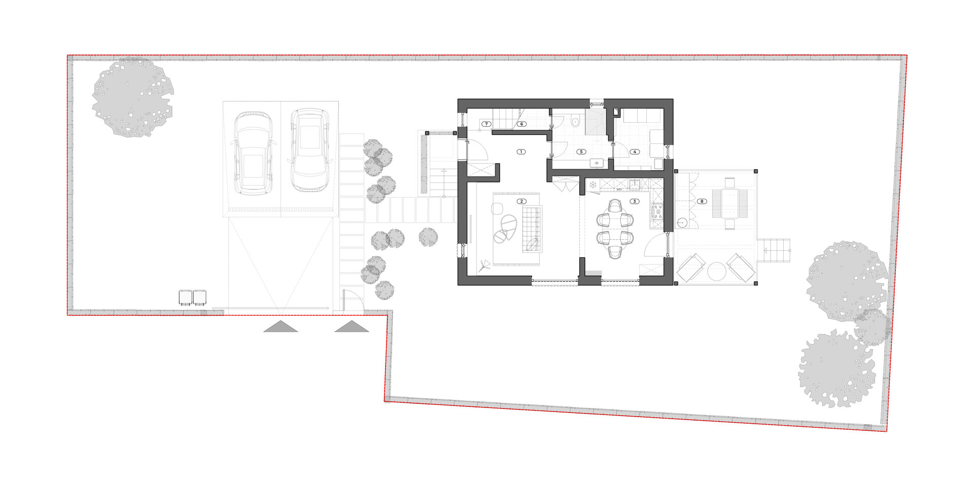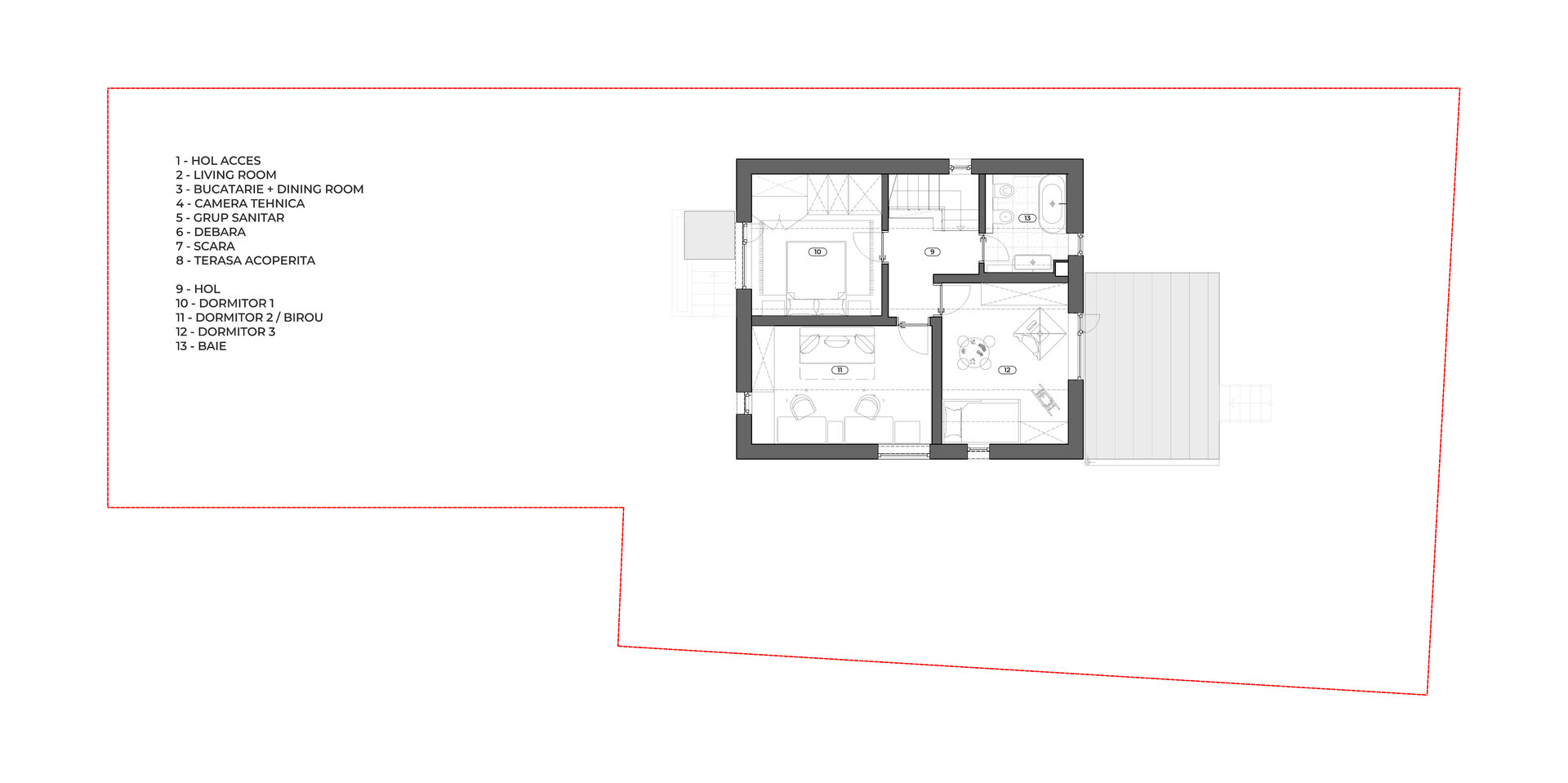 Pornind de la aceste cerințe, a fost concepută o locuință compactă, dar în același timp spațioasă, dezvoltată pe două niveluri – parter și mansardă – cu o suprafață construită de circa 175 mp. Proiectul include o terasă generoasă de aproximativ 18 mp, două locuri de parcare la sol și o curte de circa 340 mp, care permite atât amenajarea unui spațiu verde relaxant, cât și integrarea unor zone de grădină sau loc de joacă pentru copii. Amplasarea locuinței a fost gândită astfel încât să ofere un echilibru între amprenta la sol și suprafața liberă, păstrând totodată intimitatea prin retragerile față de vecinătate.