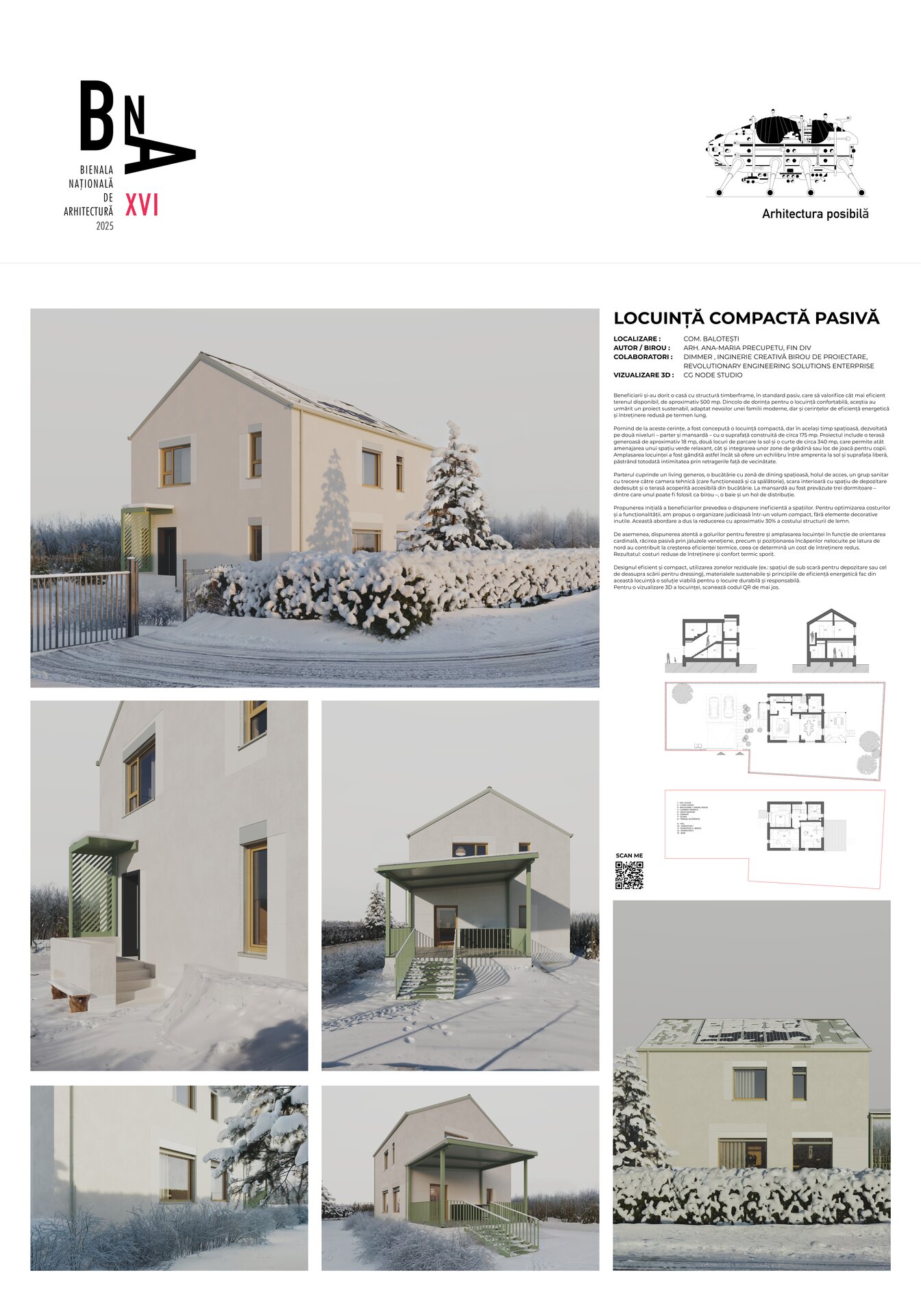 Pentru cei interesați să descopere în detaliu organizarea și aspectul final al locuinței, există și o vizualizare 3D interactivă. Aceasta poate fi accesată simplu, prin scanarea codului QR de pe panou, oferind o perspectivă realistă asupra spațiilor interioare, dar și asupra modului în care casa se integrează pe terenul de 500 mp.
