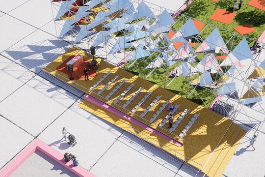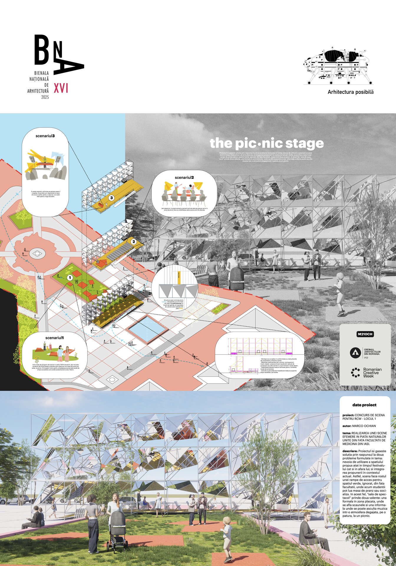 Proiectul isi gaseste solutia prin raspunsul la doua probleme formulate in tema: nevoia de utilizare a spatiului propus atat in timpul festivalului cat si in afara lui; si integrarea propunerii in contextul actual. Astfel, scena face rostul unei rampe de acces pentru spatiul verde, ignorat, din fata facultatii, unde acum studentii pot lua masa de pranz sau socializa. In acest fel, “sala de spectacol” prinde doua valente: una formala in zona placata, unde se afla scaunele si una informala unde se poate asculta muzica intr-o atmosfera degajata, pe o patura, la un picnic.
