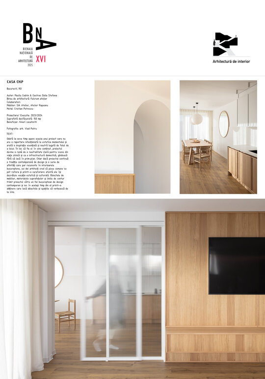 Odată la ceva timp apare ocazia unui proiect care nu are o raportare intenționată la estetica momentului și arată o inspirație esențială și neutră legată de felul de a locui. În loc să fie el în sine conținut, proiectul devine o ramă de o neutralitate clară pentru scene din viața zilnică și ca o infrastructură domestică, ghidează fără să iasă în prim-plan. Chiar dacă proiectul continuă o tradiție contemporană de design și o serie de afinități care par recurente în interioarele bucureștene, cei doi arhitecți cred că piese comune se pot reitera și printr-o curatoriere atentă ele își dezvăluie vocația estetică și culturală. Obiectele de mobilier, materialele suprafețelor și liniile de contur trimit proiectul către un fel bucureștean de design contemporan și ies în același timp din el printr-o abținere care lasă obiectele și spațiile să vorbească de la sine. Spațiul a avut de la început niște calități care meritau să fie scoase la lumină iar proiectul le-a folosit prin forme și sensibilități regăsite în interioare bucureștene începând din perioada Art-Deco și până în prezent, epurate, păstrate ca formă și intenție dar eliberate de conținut. În același timp lemnul și nuanțele confortabile pentru ochi devin legătura cu un fel de a locui și cu un mediu domestic ce nu depinde de condiții locale pentru a fi confortabil și funcțional. Prin elemente ca scara de mozaic cu balustradă albă sau spațiile lăsate libere pentru circulație, aer și lumină, interiorul are, în contrast cu textilele moi, o senzație aproape publică în multe dintre spații. Și pentru că unele materiale sunt alese tocmai din dorința unei durabilități dar și pentru că spațiile aerisite așteaptă să primească o diversitate mare de invitați și activități, proiectul vine cu o temă de design aproape critică față de spațiul domestic. Încă de la început, proiectul a fost gândit cu o atenție firească față de spațiul alb și gol inițial, care de multe ori vine cu resurse ce în loc să fie schimbate, merită potențate.