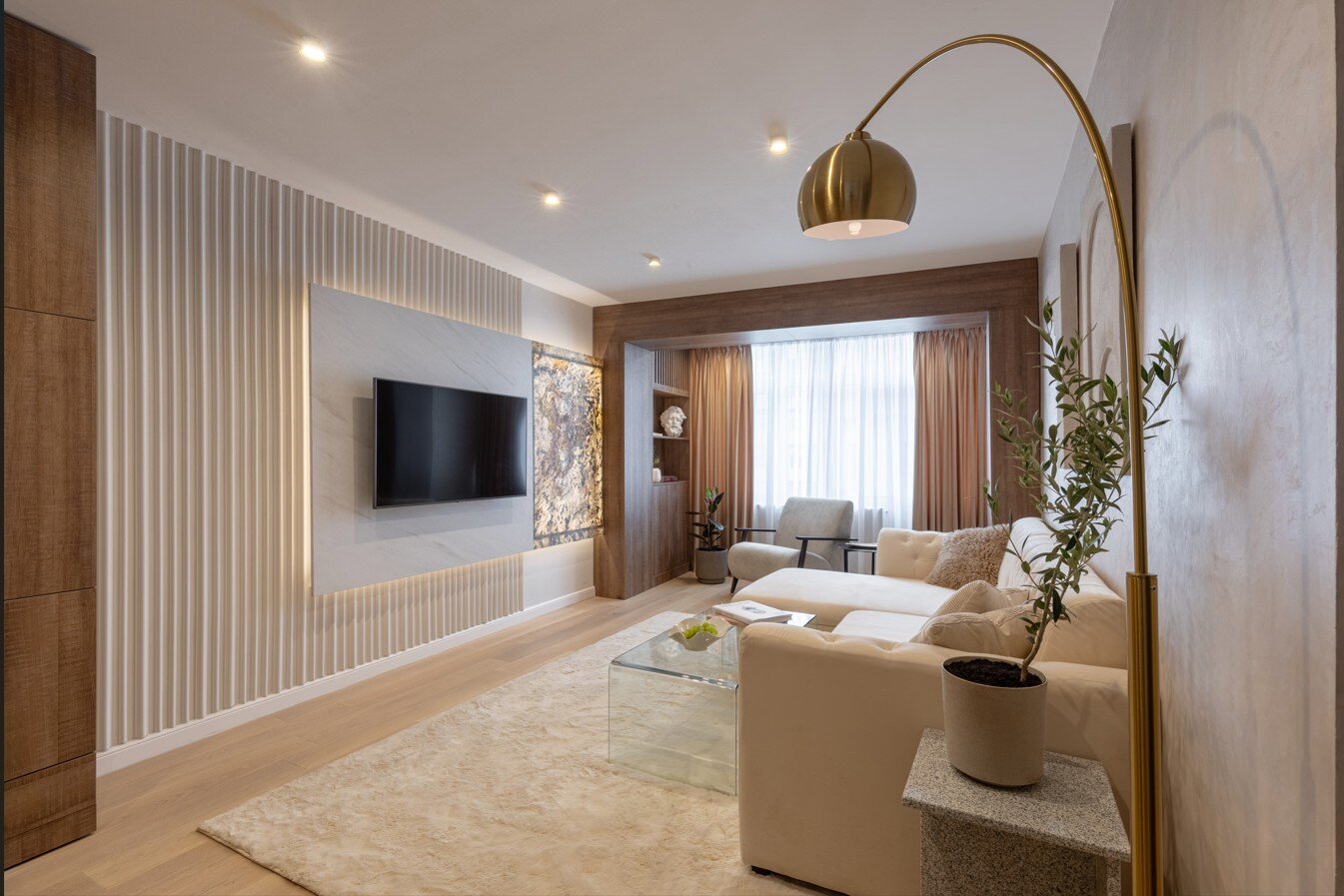 Livingul, spațiul central al apartamentului, a fost gândit ca un loc multifuncțional, capabil să răspundă atât nevoii de socializare și relaxare, cât și celei de retragere individuală. Întreaga încăpere este împărțită în trei zone distincte. În centru se află peretele media, ce integrează elementul definitoriu al amenajării: panoul TV din ardezie translucidă, care filtrează lumina într-un mod subtil și conferă eleganță decorului. Lateral, se dispun zona de dining și cea de lectură, ambele marcate prin placaje decorative din lemn și iluminat individual.