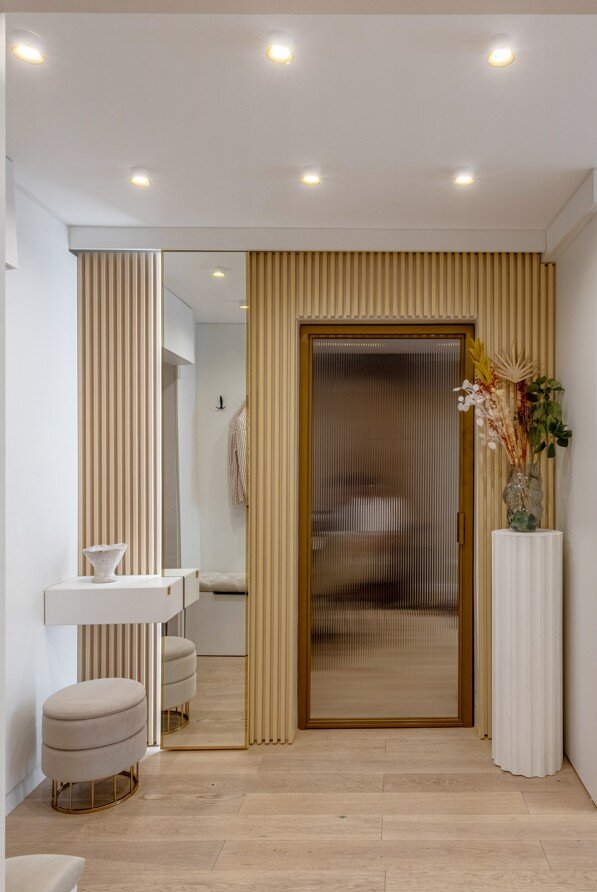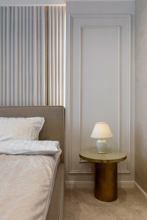Zona de noapte a ridicat mai multe provocări: compartimentarea rigidă a blocurilor anilor ’70, prezența grinzilor structurale vizibile, suprafețele reduse ale dormitoarelor, dar și cerințele legate de depozitare. Soluția a fost mutarea depozitării pe hol, prin integrarea unor dulapuri continue pe toată lungimea acestuia. Această abordare asigură spațiu generos fără a fragmenta vizual zona de tranzit și creează unitate. Grinzile structurale, în loc să fie mascate, au fost placate și transformate în elemente decorative, devenind parte din limbajul estetic al întregii locuințe.