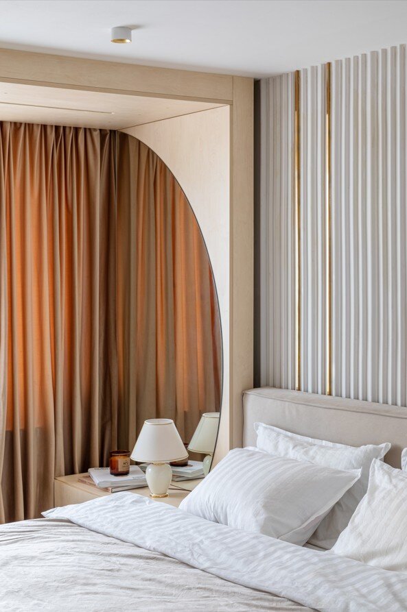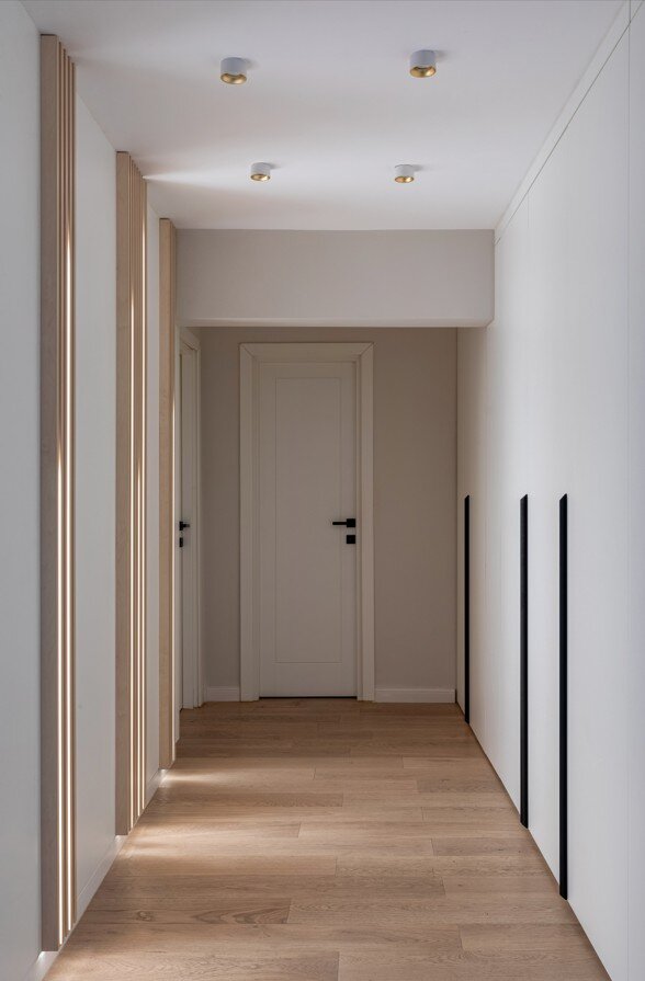 Paleta cromatică urmează tonuri neutre – alb, bej, crem – dinamizate de accente de maro închis, inserții metalice aurii și note de culoare în camera copiilor. Lumina a jucat un rol esențial în construcția atmosferei. Au fost utilizate atât surse de iluminat directe, cât și soluții ambientale care filtrează lumina și modulează spațiul, creând scenarii luminoase adaptabile diferitelor momente ale zilei și activităților. În acest fel, apartamentul devine un mediu viu, în permanent dialog cu utilizatorii săi.