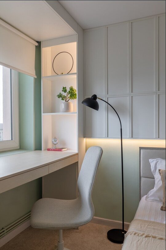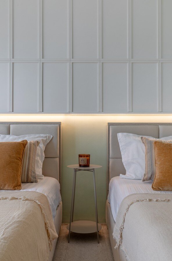 Dormitorul matrimonial a fost tratat minimalist, reducând mobilierul la strictul necesar. Camera copiilor, destinată unui băiat și unei fete, a fost concepută ca un spațiu funcțional și flexibil. Au fost integrate două paturi separate și un birou dublu, permițând fiecărui copil să aibă propria zonă de lucru și intimitate.