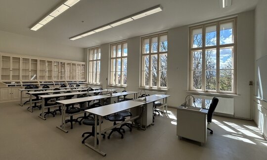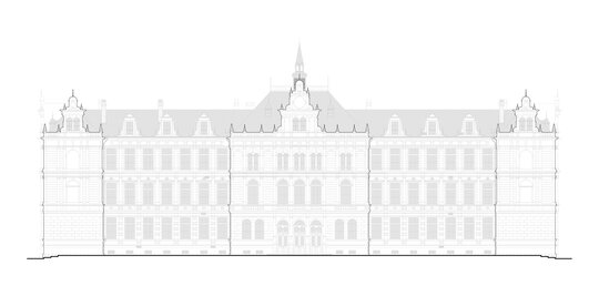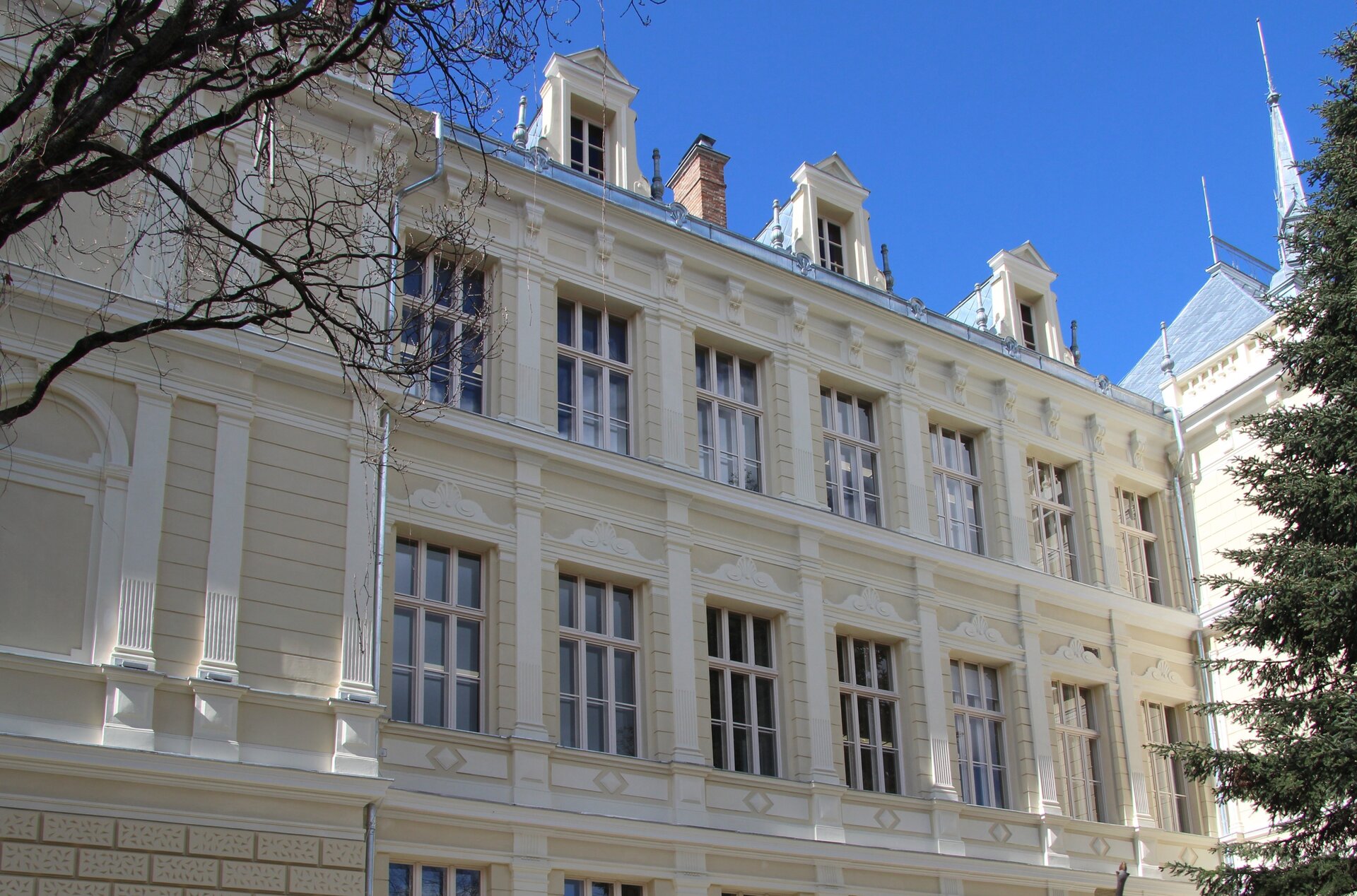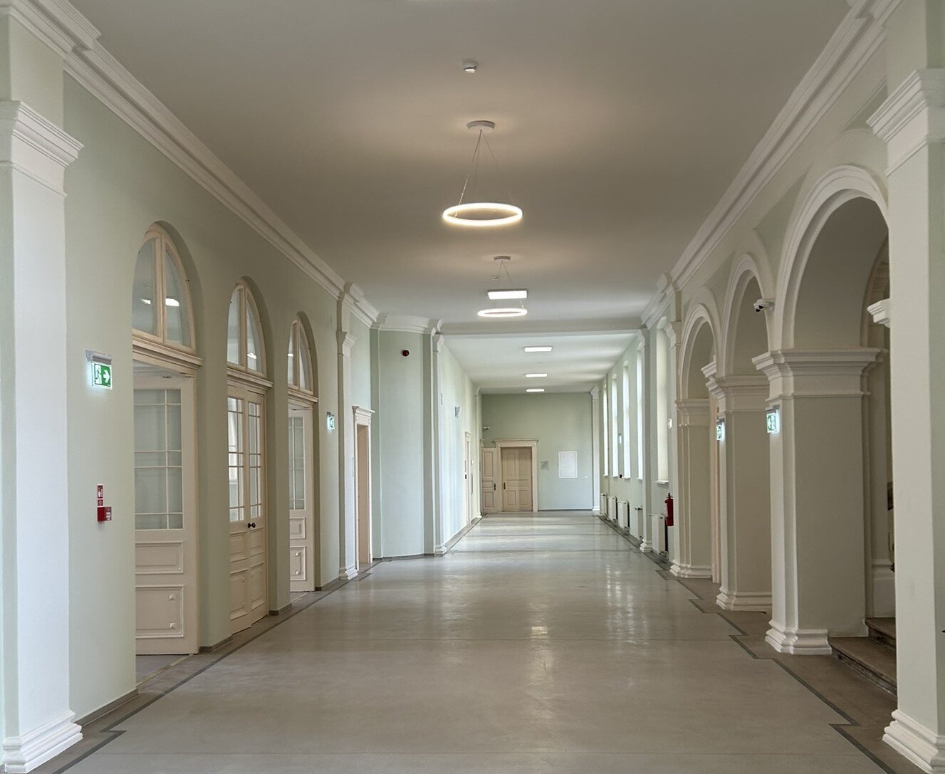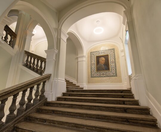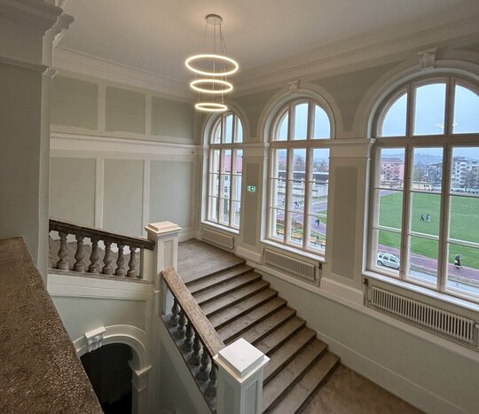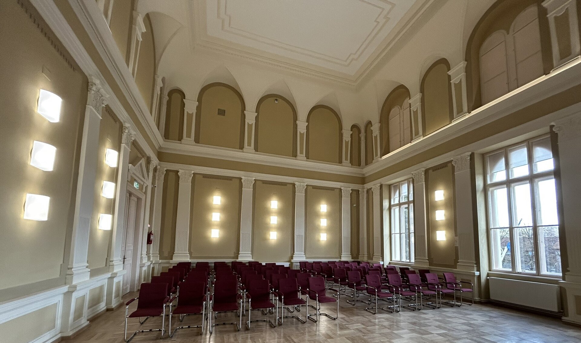Principalele spații reprezentative – holul principal de acces, casa scării monumentale și sala festivă – au fost atent restaurate astfel încât să fie redată ambianța istorică.