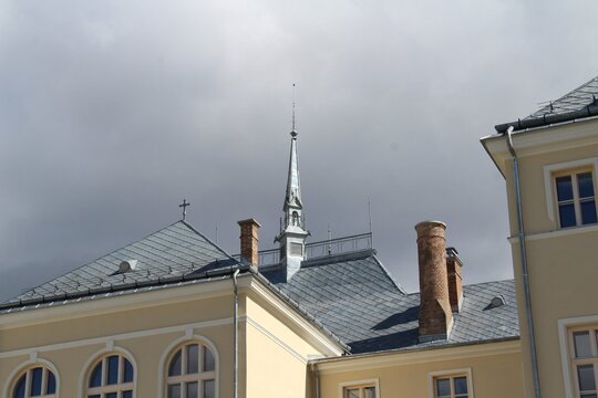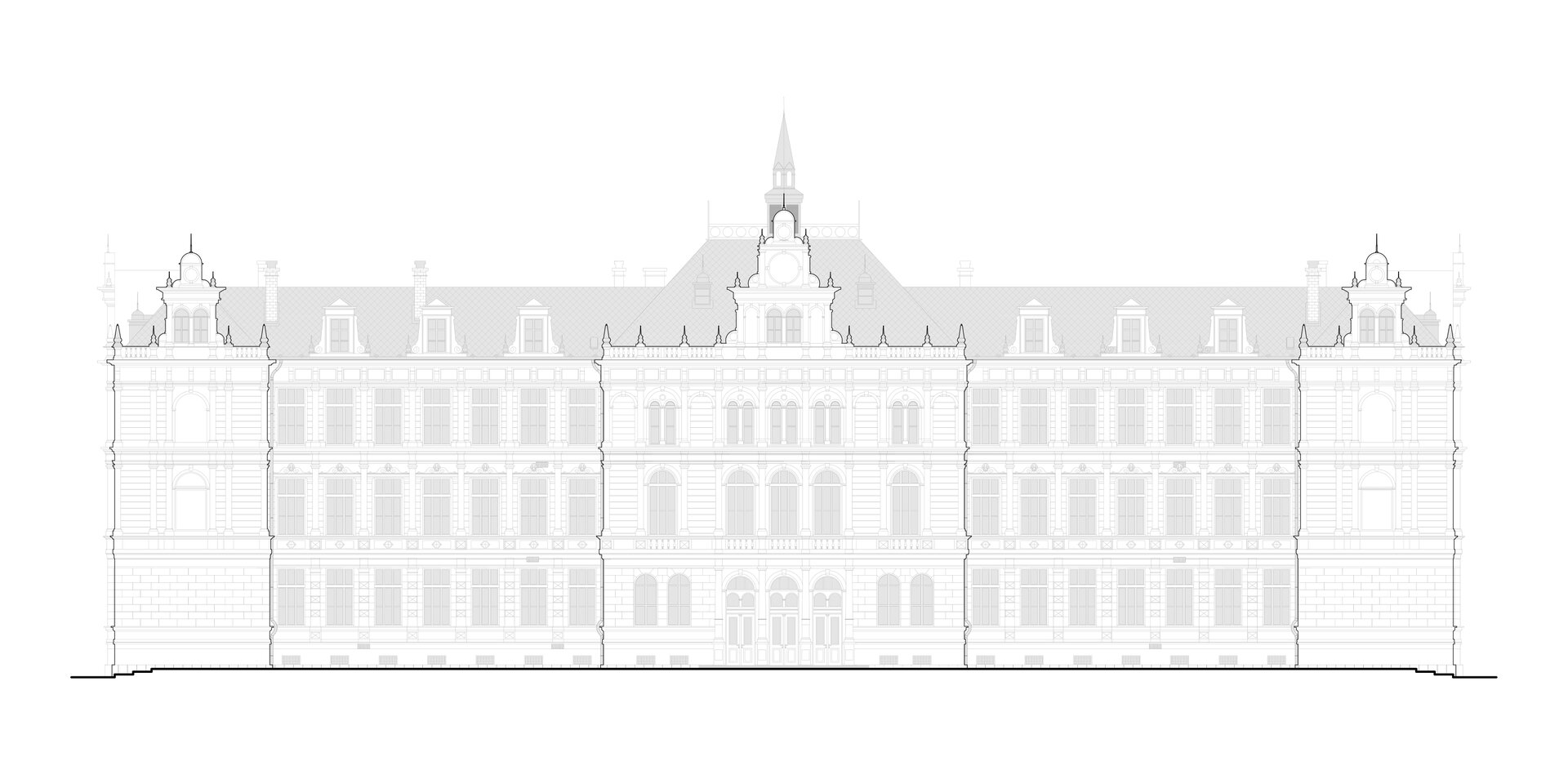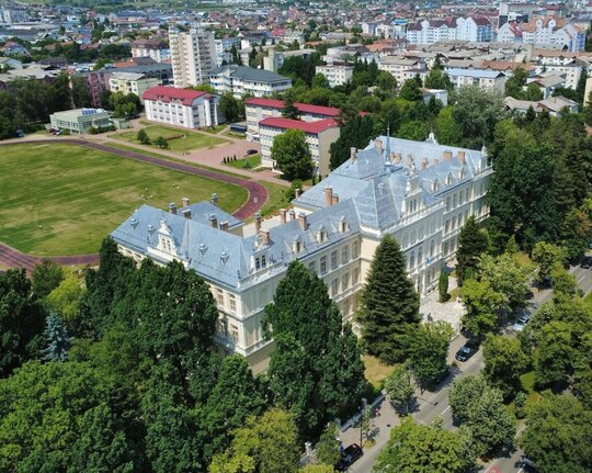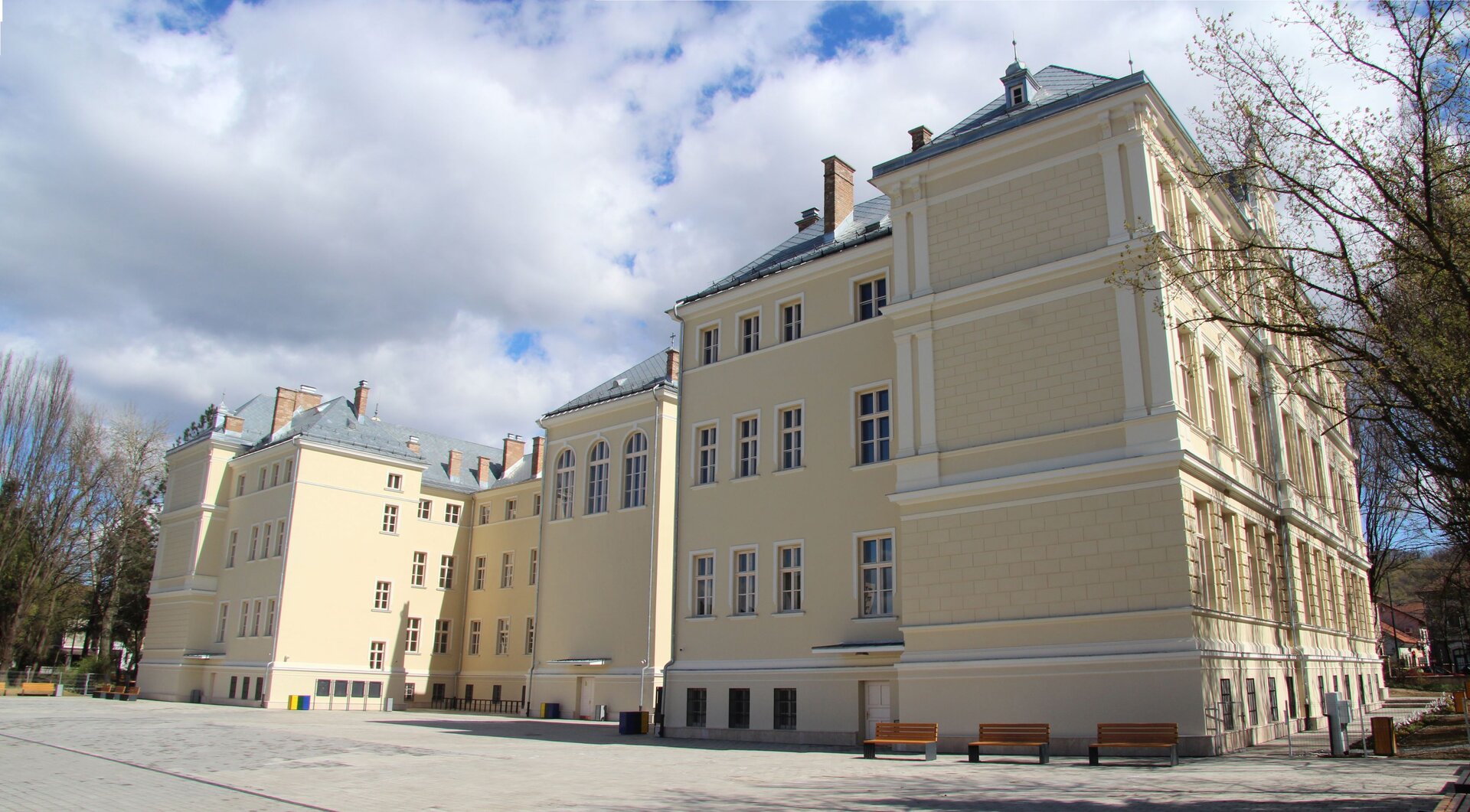 Clădirea principală s-a construit paralel cu frontul stradal, cu o retragere de circa 20 m. Clădirea prezintă simetrie faţă de axa perpendiculară pe frontul stradal, dispune de rezalit central pe faţada principală orientată sud-est şi alte trei rezalituri înspre curtea interioară, unul central şi două amplasate perpendicular pe braţele “E”-ului. Rezalitul central serveşte intrării principale printr-un hol monumental generos la parter, respectiv găzduiește grandioasa sală de festivităţi cu acces de la etajul întâi, care ocupă spaţiul ambelor etaje.