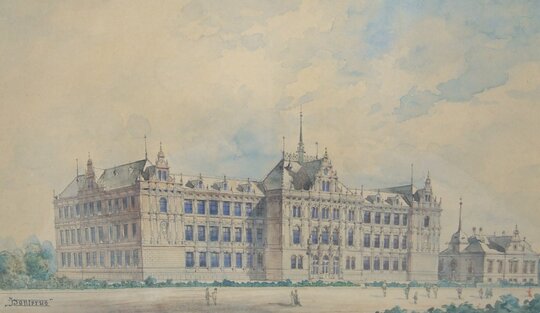 Iniţiatorul edificării unei noi şcoli pe lângă biserica evanghelică a fost Georg Fischer, directorul gimnaziului, iar proiectul câștigător a fost desemnat în urma unui concurs de proiecte, acesta aparținând arhitectului Peter Paul Brang (1852–1925), originar din Transilvania, format ca arhitect la Viena. La vremea aceea, noul gimnaziu a fost considerat cel mai modern şi spaţios edificiu de învăţământ din zonă.