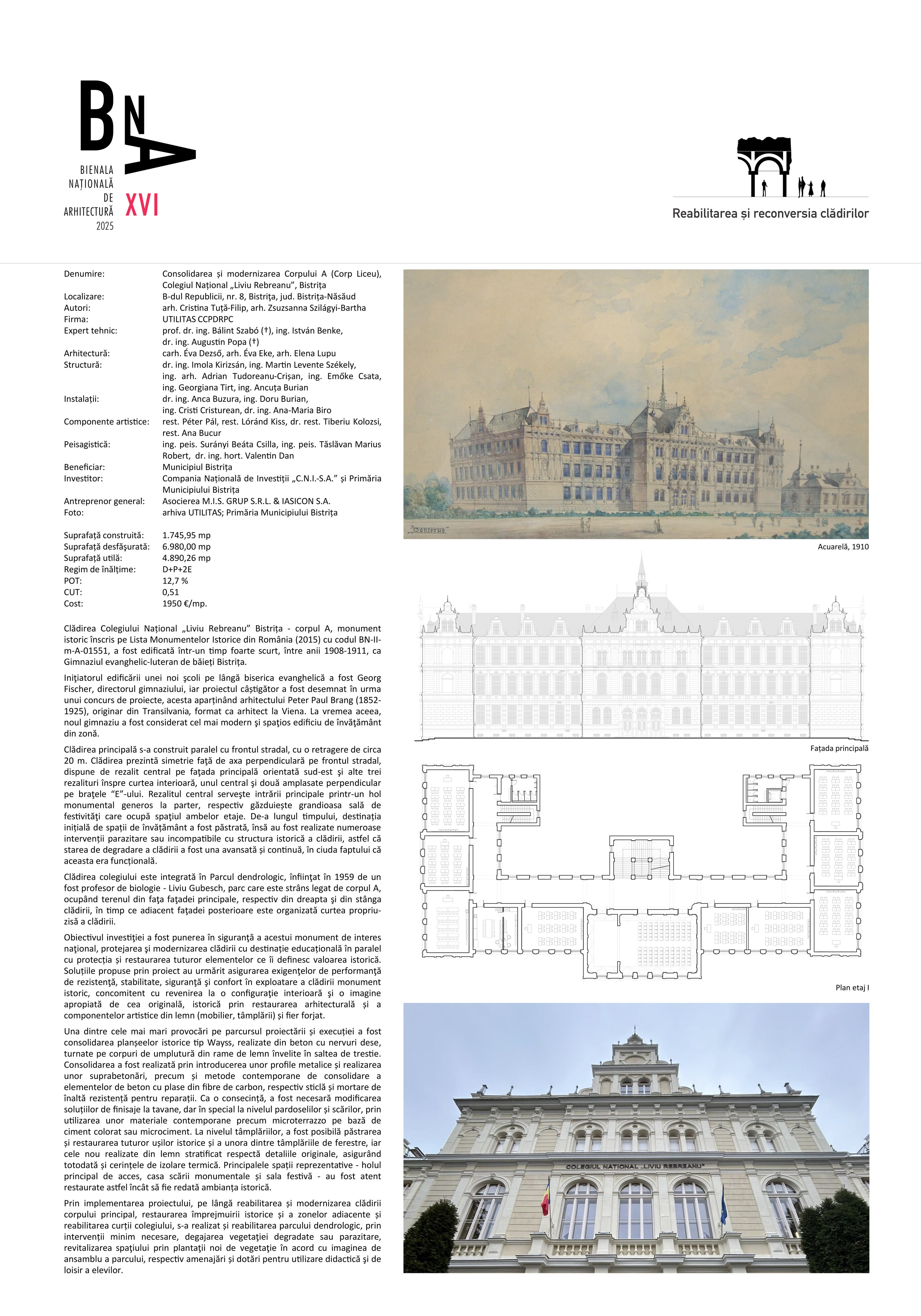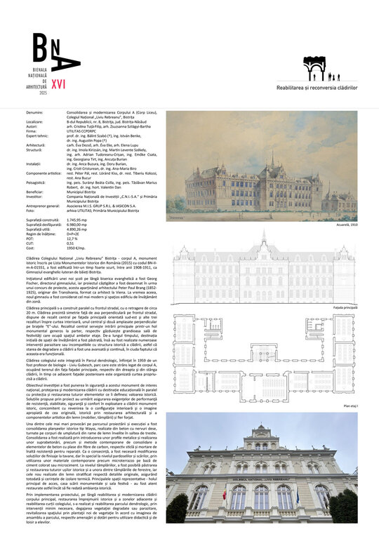 Obiectivul investiţiei a fost punerea în siguranţă a acestui monument de interes naţional, protejarea şi modernizarea clădirii cu destinație educațională în paralel cu protecția și restaurarea tuturor elementelor ce îi definesc valoarea istorică. Soluțiile propuse prin proiect au urmărit asigurarea exigenţelor de performanţă de rezistenţă, stabilitate, siguranţă şi confort în exploatare a clădirii monument istoric, concomitent cu revenirea la o configuraţie interioară şi o imagine apropiată de cea originală, istorică prin restaurarea arhitecturală și a componentelor artistice din lemn (mobilier, tâmplării) și fier forjat.
