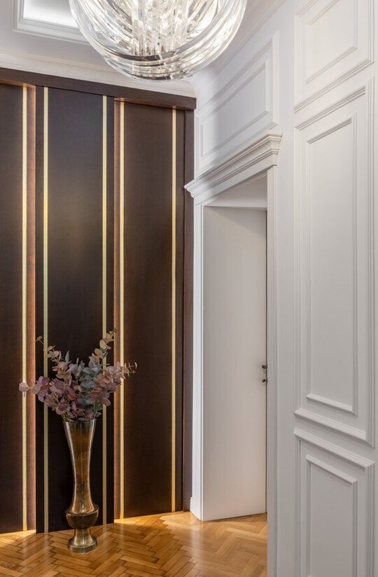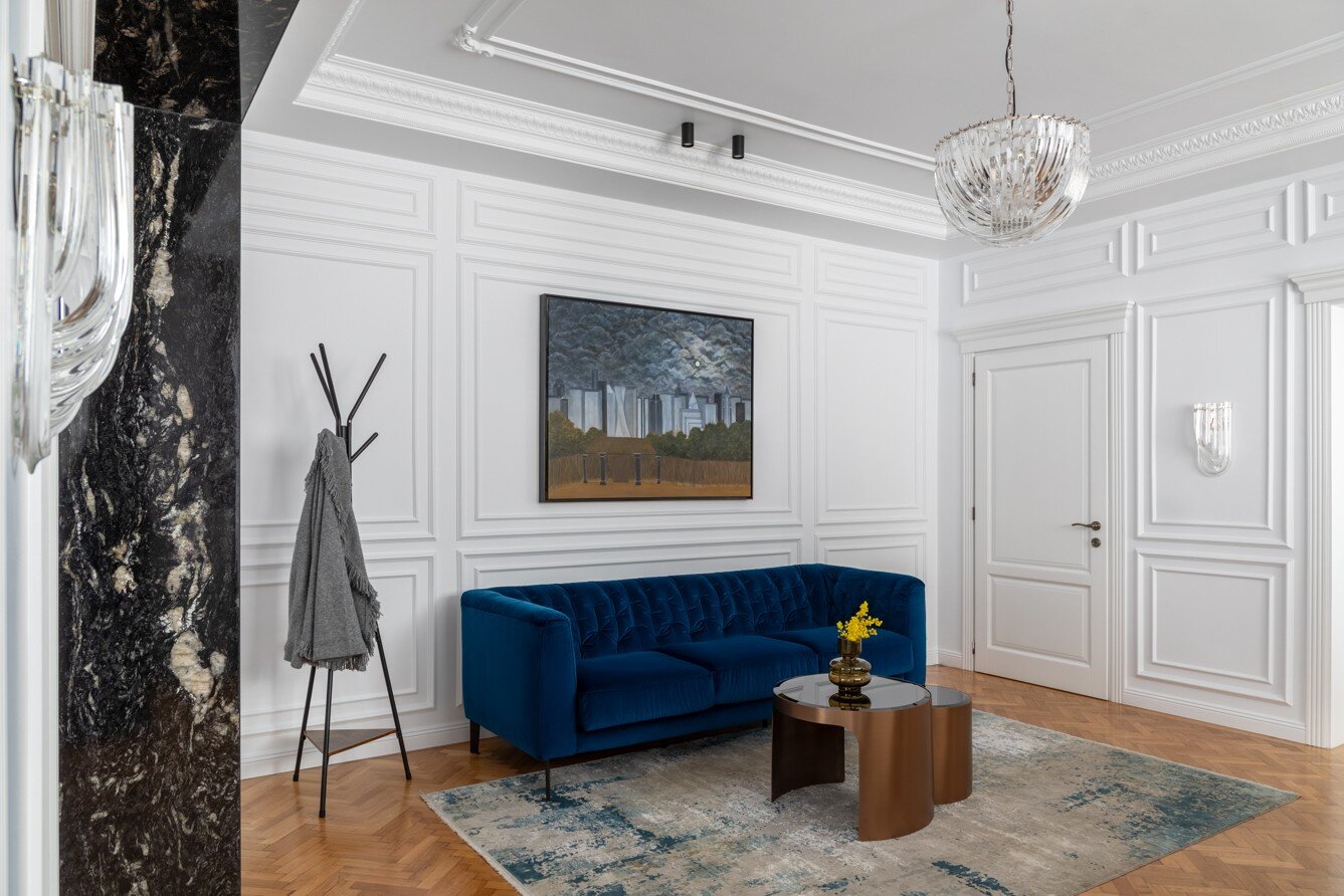 Tratamentul pereților include și chenare decorative, menite să sublinieze volumetria și ritmul interior. Aceste detalii arhitecturale sunt completate de lucrări de artă cu expresie contemporană, care echilibrează sobrietatea formală clasică. La nivelul tavanului regăsim aceleași elemente decorative, dispuse de această dată perimetral.