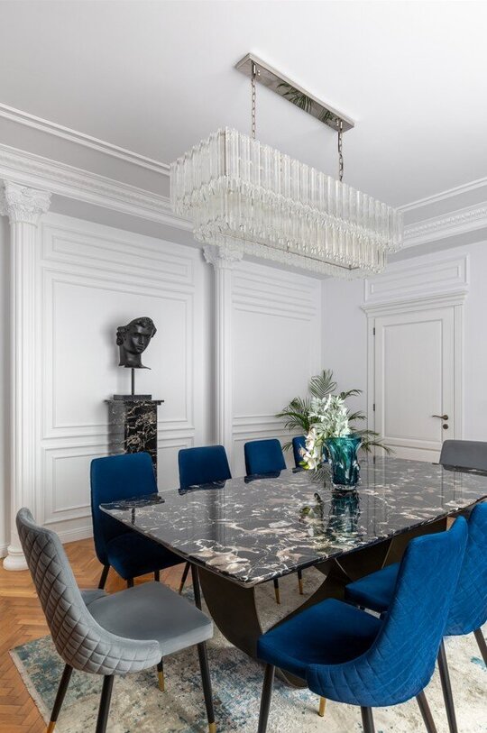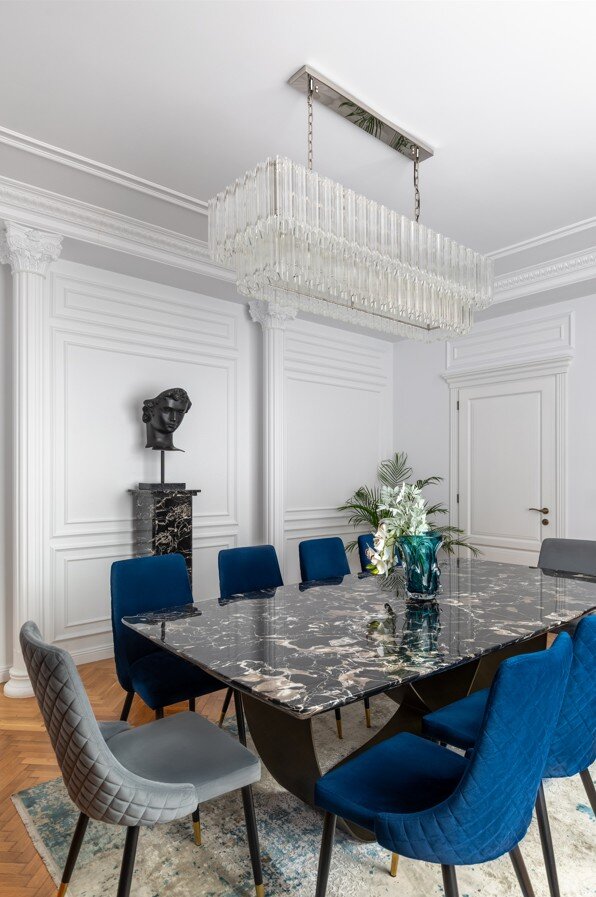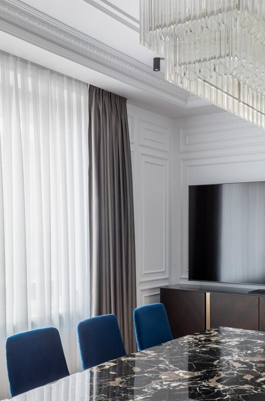 Iluminatul a fost configurat pentru a susține funcționalitatea spațiului, dar și pentru a aduce un plus estetic. Astfel, am optat pentru a îmbina corpurile de iluminat arhitecturale, minimaliste, cu cele decorative, clasice, din cristal. În felul acesta, s-au creat mai multe scenarii de iluminat care pot fi selectate în funcție de momentul zilei și de tipul activității, oferind flexibilitate și adaptabilitate.