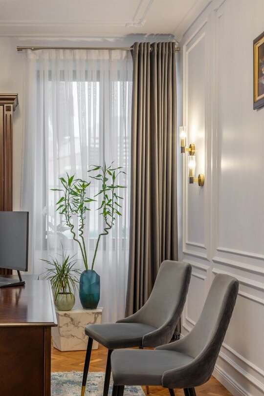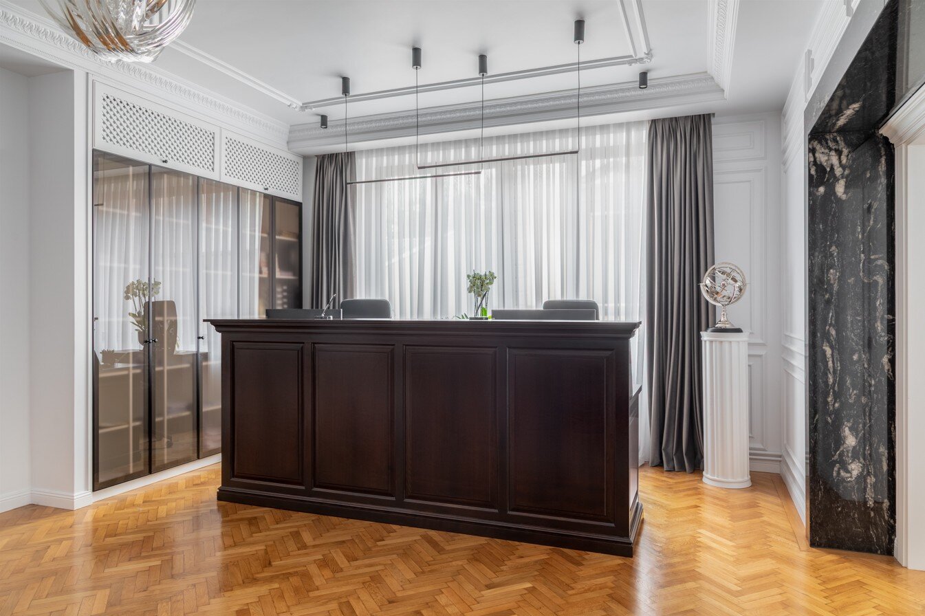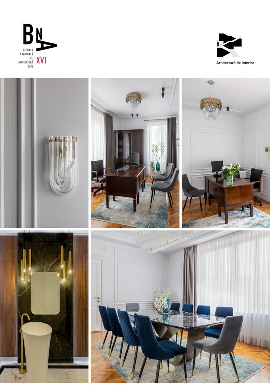 Mobilierul a fost realizat utilizând materiale precum lemn masiv, tapițerie din catifea și marmură naturală. Dispunerea acestuia urmărește optimizarea fluxului funcțional, facilitând atât activitatea individuală, cât și interacțiunea profesională.Spațiile au fost proiectate ținând cont de fluxul operațional al unui birou notarial. Astfel, au fost create: zona de recepție dedicată primirii clienților, trei camere de lucru individual și întâlniri private, sala de conferințe care are și rolul de cameră de redactare. Acestora le urmează spațiile conexe: arhivă, chicinetă și grup sanitar. Zonificarea clară și accesibilitatea optimizată asigură eficiența activității, în timp ce materialele și finisajele alese urmăresc crearea unei atmosfere unitare, echilibrate și coerente.Prin această intervenție, proiectul demonstrează modul în care designul interior poate reinterpreta „altfel” un spațiu profesional tradițional, integrând patrimoniul istoric cu soluții contemporane care echilibrează funcționalitatea, confortul și rafinamentul. În final, rezultatul nu este doar o modernizare tehnică, ci și o declarație de identitate vizuală și culturală, prin care biroul notarial devine un reper al eleganței și al profesionalismului urban actual.