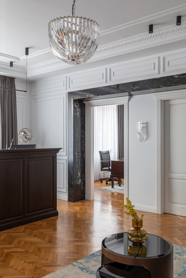 Intervenția a presupus definirea unui concept de design care să genereze un dialog între clasic și contemporan. S-a pornit de la refacerea completă a instalațiilor electrice și sanitare. Pardoseala existentă din stejar masiv a fost recondiționată, păstrând textura și patina autentice. La momentul preluării clădirii, tâmplăria originală era deja schimbată și neadecvată stilului arhitectural. Prin urmare, a fost înlocuită complet cu tâmplărie din lemn masiv. Zonele de trecere au fost marcate prin ancadramente din marmură Nero Marquina, aducând un contrast subtil între căldura lemnului și robustețea pietrei naturale, dar și un accent de culoare la nivelul pereților.