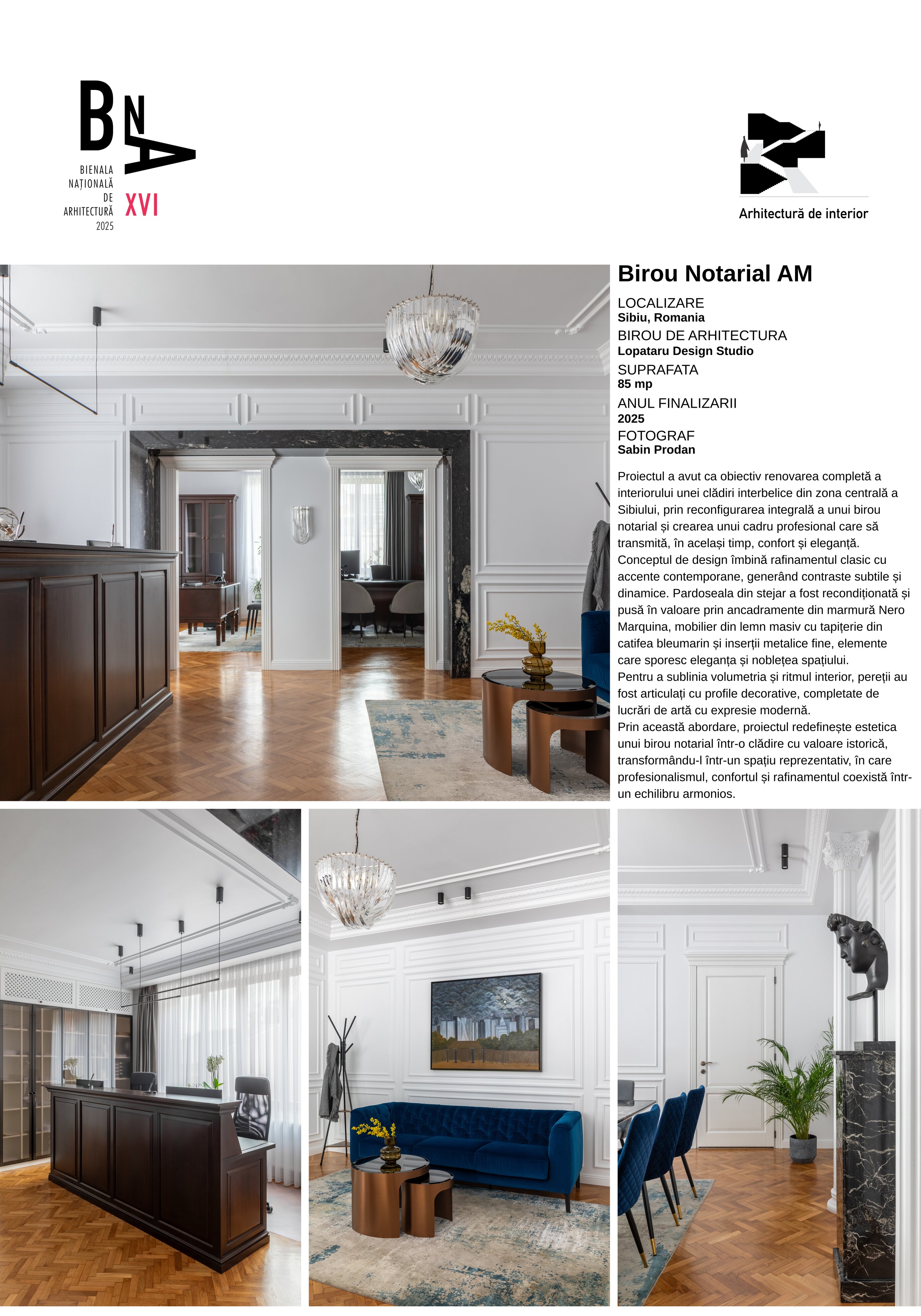 Proiectul a avut ca scop renovarea integrală a interiorului unei clădiri interbelice situate în zona centrală a Sibiului și reconfigurarea completă a acesteia într-un birou notarial. Obiectivul principal a fost crearea unui spațiu care să îmbine funcționalitatea necesară activității notariale cu confortul și eleganța, respectând în același timp valoarea arhitecturală a clădirii existente.